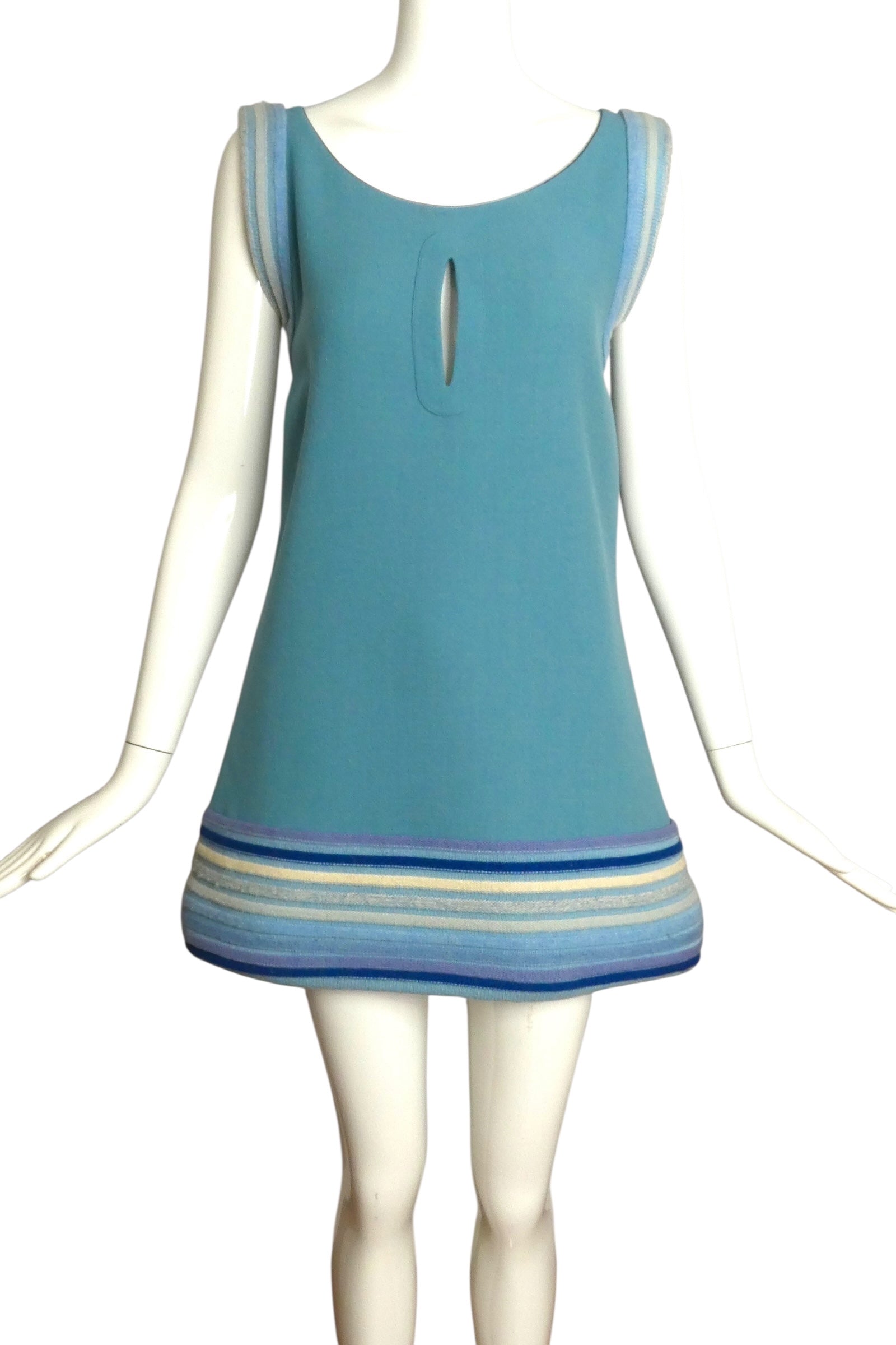 Description: This charming Pierre Cardin Boutique dress from the 2010 runway collection is crafted in blue wool crepe and designed in a flattering trapeze silhouette. It features a scoop neckline and a distinctive center front medallion cutout with applique on the chest. Complementing the design are bands of wool sweater knit stripes in varying shades of blue that encircle the armscyes and the hem of the skirt, adding texture and subtle contrast to this elegant piece.