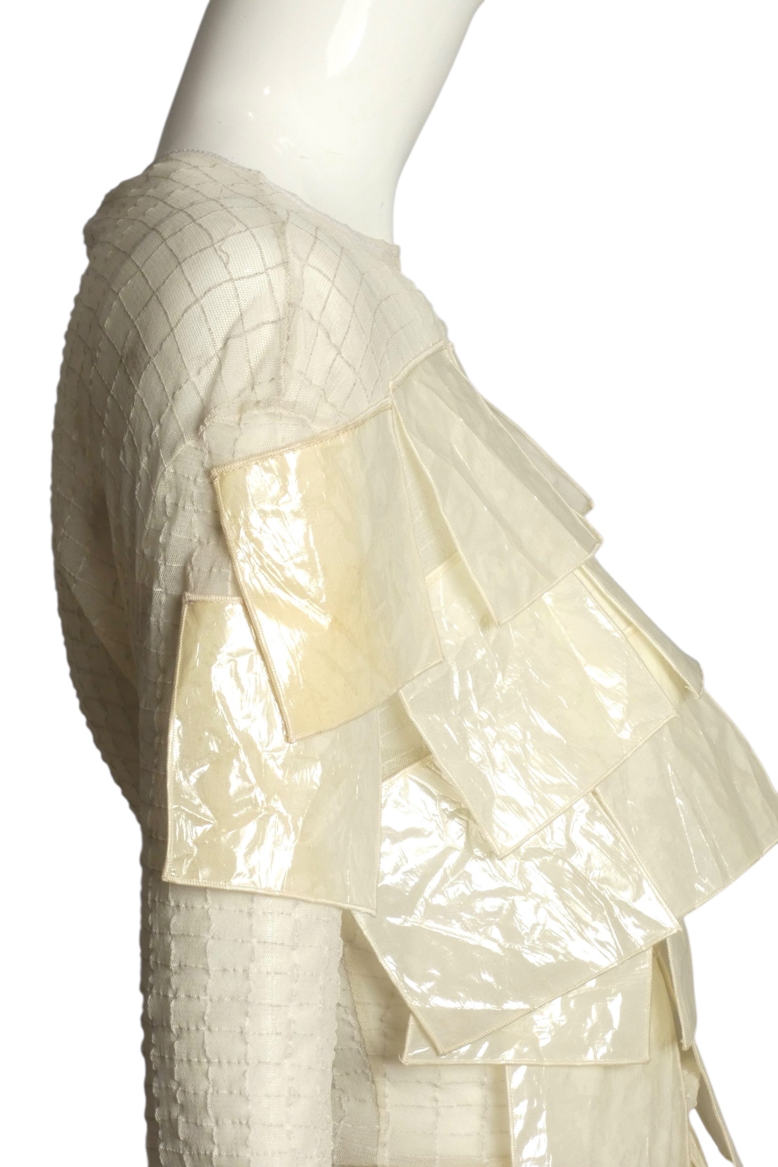 Description: Experience avant-garde elegance with this 2000 Pierre Cardin Evolution two-piece ensemble. The ivory t-shirt style blouse features a delicate windowpane mesh layered with square petals crafted from a unique cellophane-like fabric, creating a textured, luminous effect. The matching cellophane skirt hugs the hips with dart fitting, offering a sleek silhouette without a waistband. This haute couture set blends innovation with timeless sophistication, perfect for standout style with a modern edge.