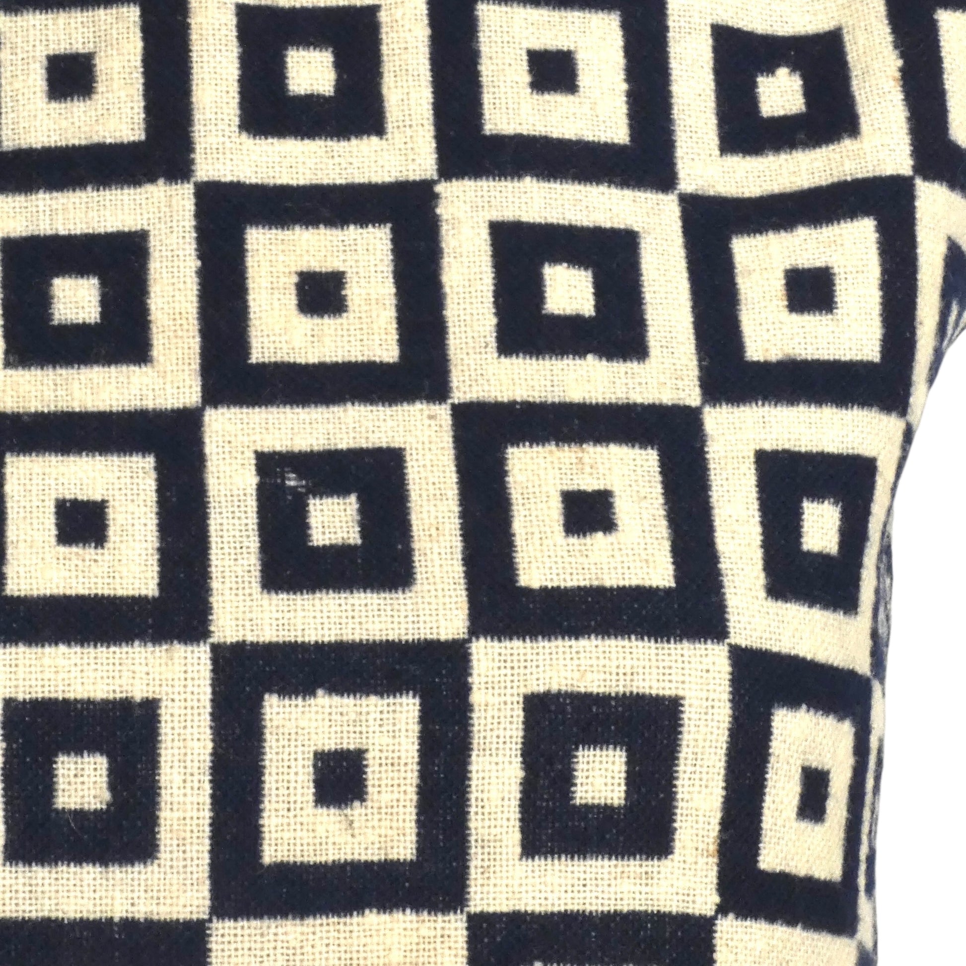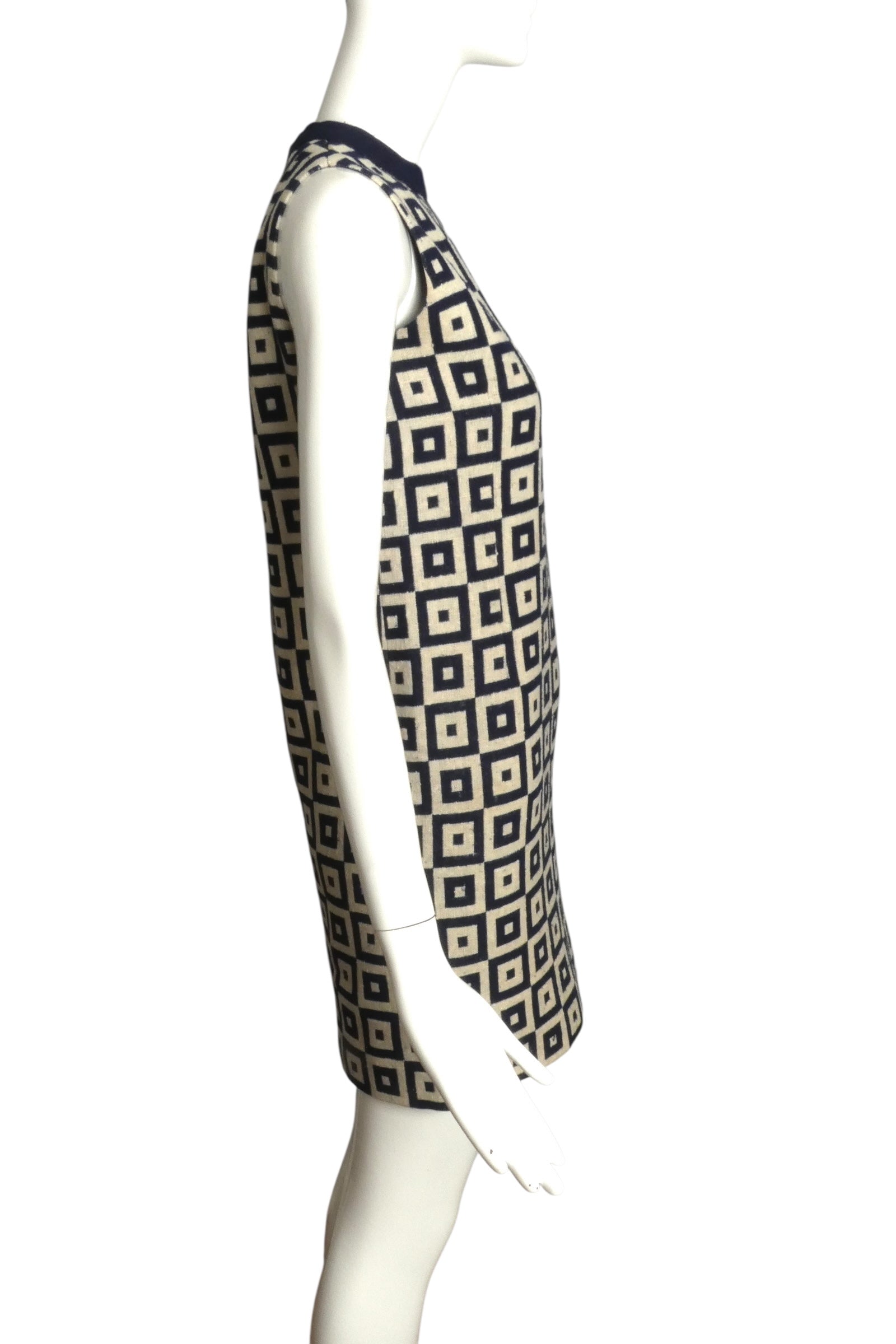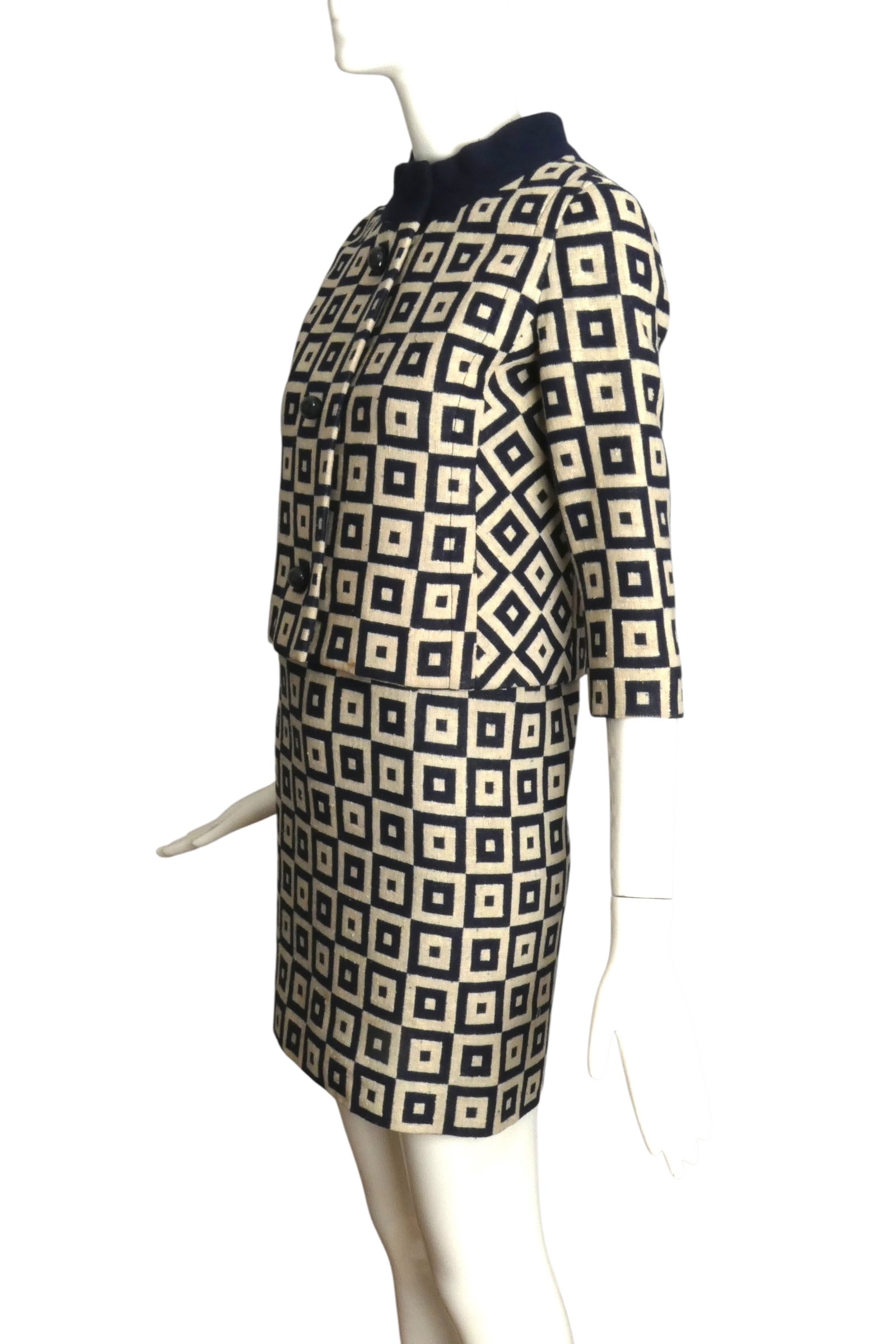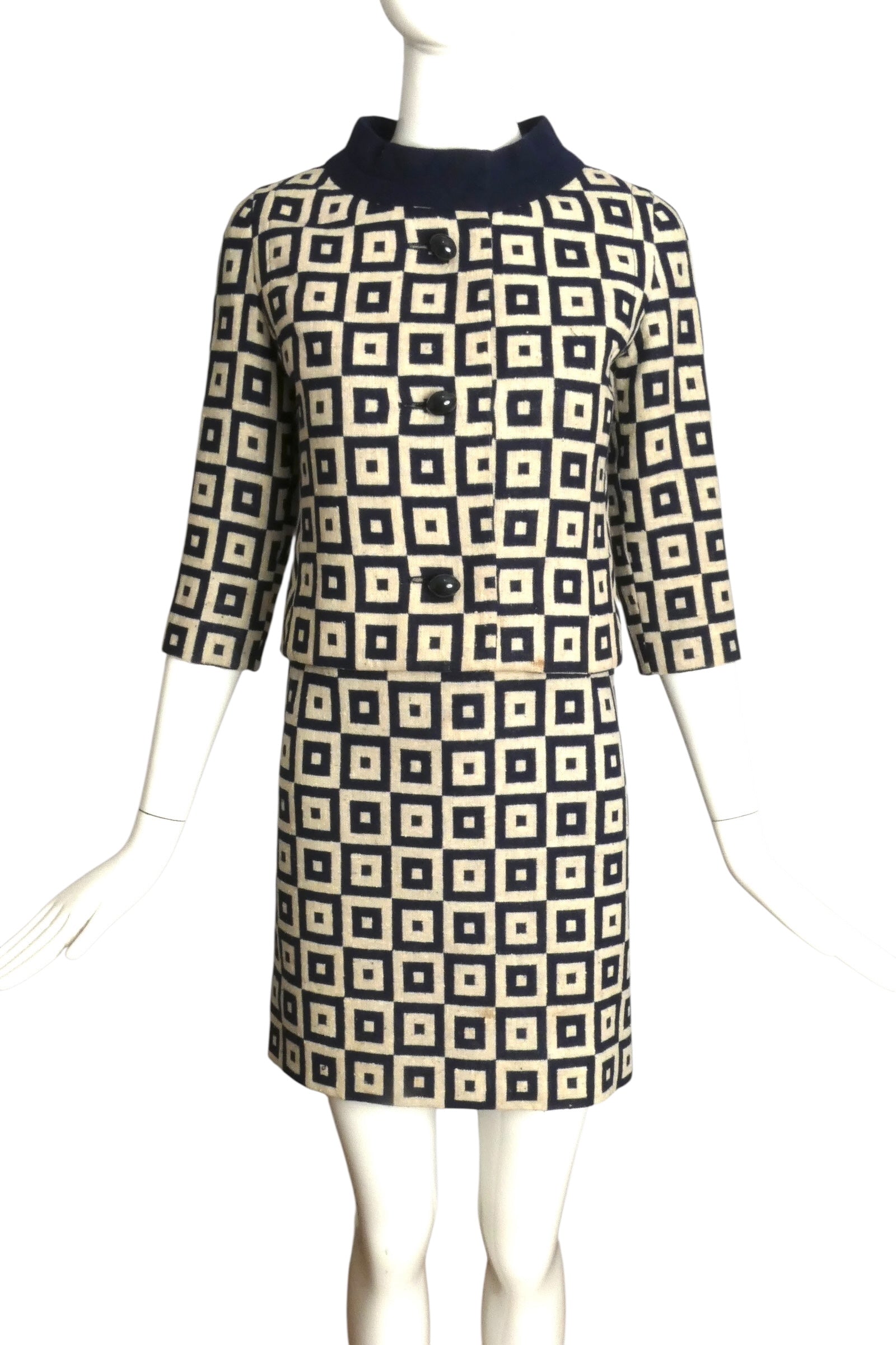 Description: This adorable 1970 linen dress and jacket ensemble from Pierre Cardin carries a story, once owned by Yoshi Takata, She was his first assistant in charge of the Asian market and Japanese muse. The shift dress features a navy band collar with a geometric pattern, while the matching jacket mirrors the collar design and closes with large navy buttons, combining vintage charm with playful elegance.