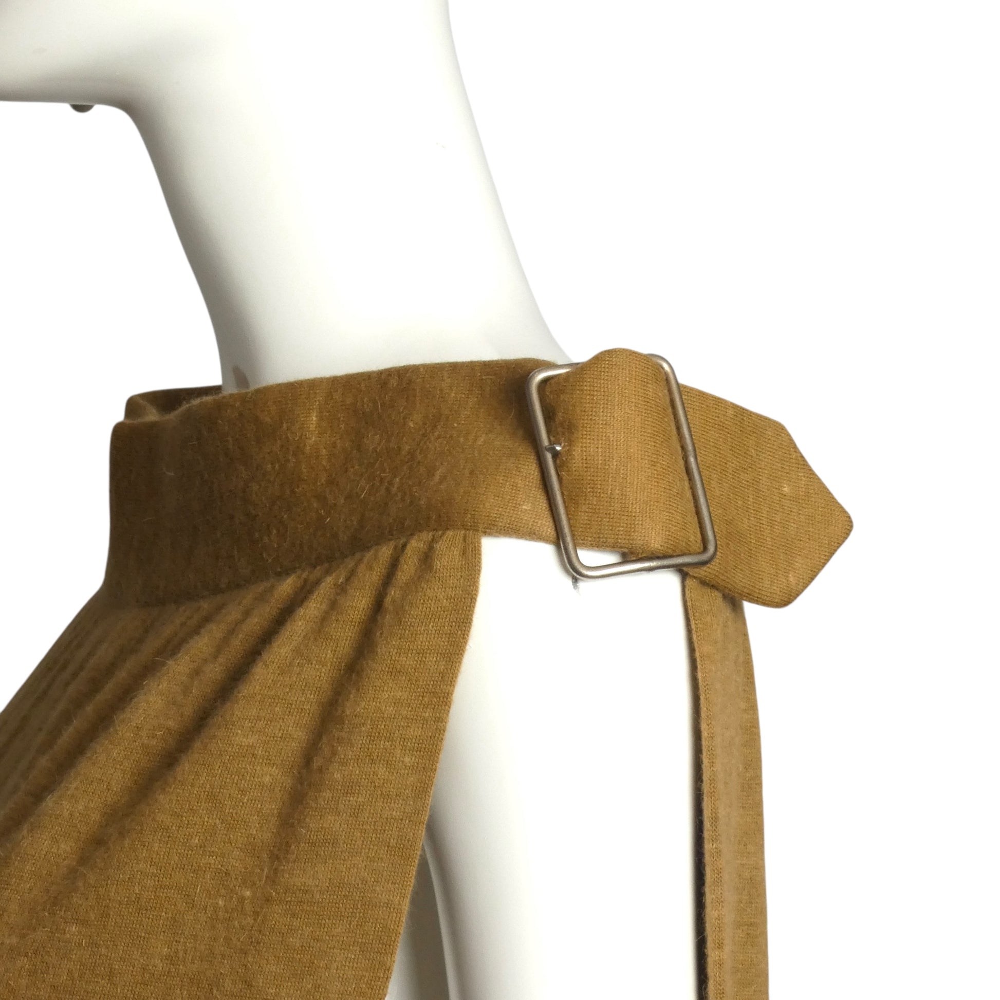 Description: Experience timeless elegance with this Pierre Cardin Haute Couture tabard-style dress crafted from rich brown wool knit. Featuring a wide band across the top and gently gathered panels flowing from the center front and back, it offers a flattering silhouette. Wide bands along the hem provide structure, while a decorative buckle on the shoulder adds a chic, distinctive detail. This sophisticated dress blends classic design with modern flair, perfect for making a refined style statement.