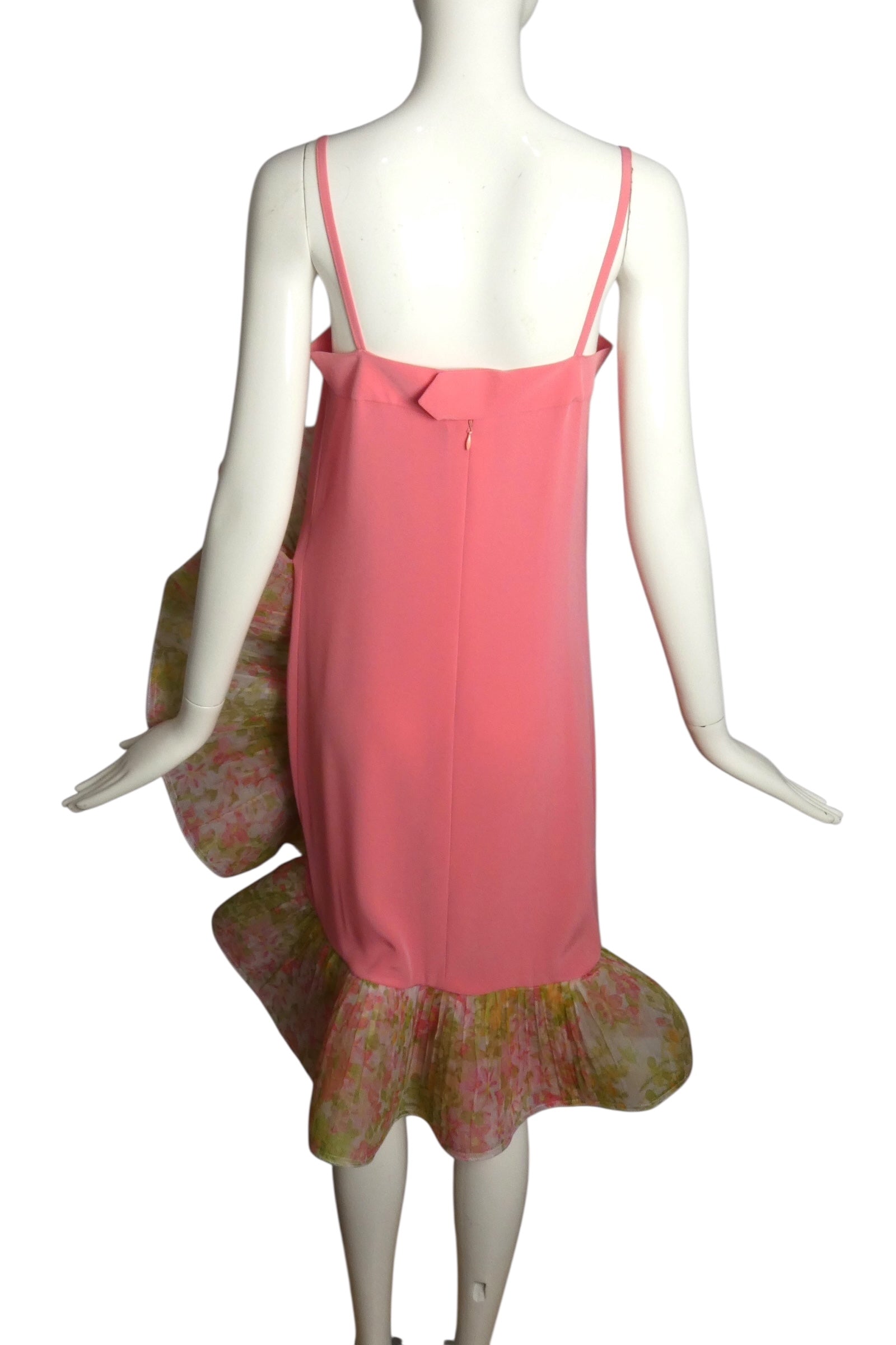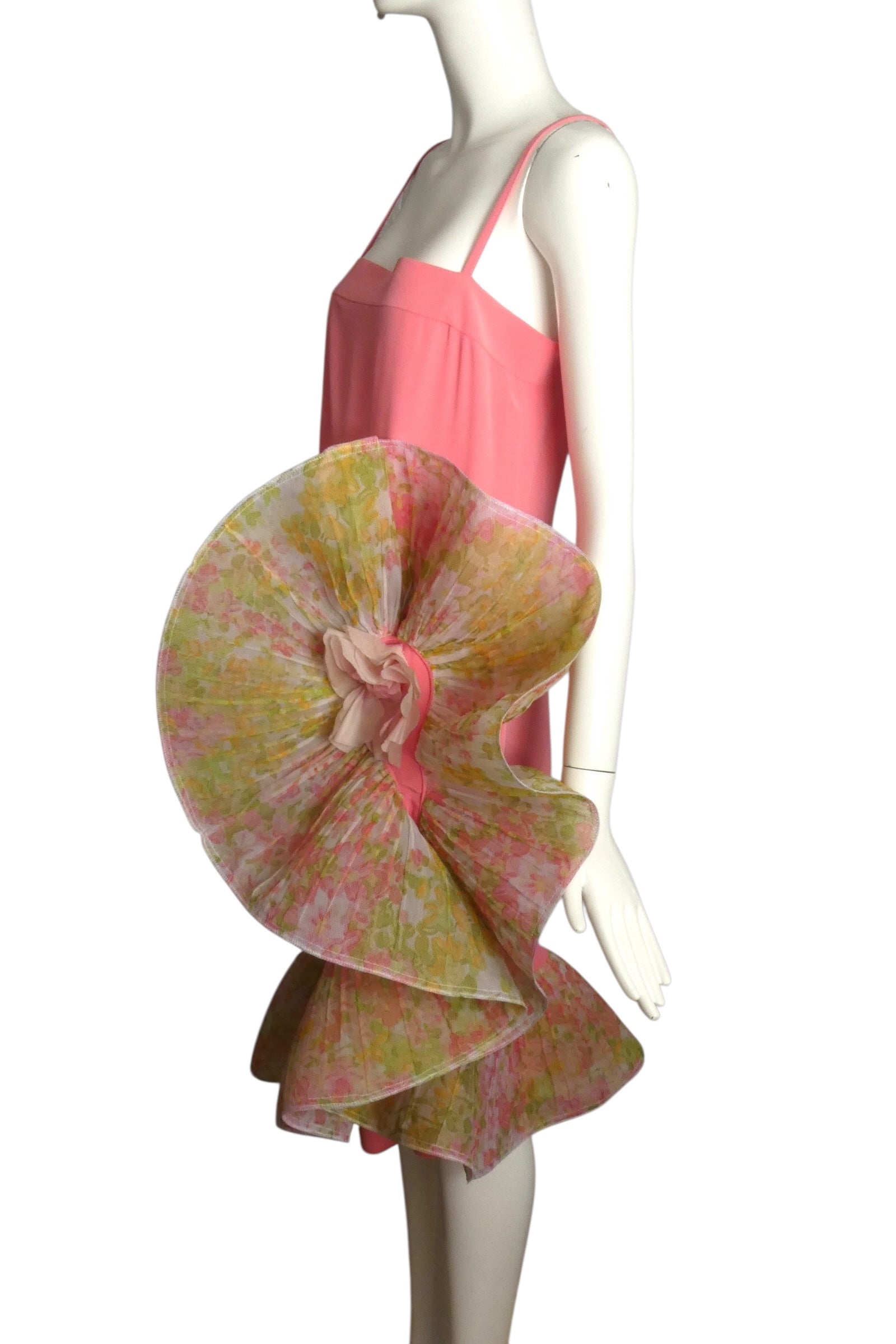 Description: Experience the delicate femininity of this exquisite 1988 Pierre Cardin Haute Couture slip dress in soft pink crepe. The refined silhouette features slender shoulder straps and a structured front band with convenient snap closures at the center back. What truly sets this piece apart is the ethereal pastel organza ruffle that blooms into an elegant rosette on the left side, cascading gracefully down the hemline and adorned with a charming pink rosette at its center. A romantic, collectible treasure from one of fashion's most visionary designers.