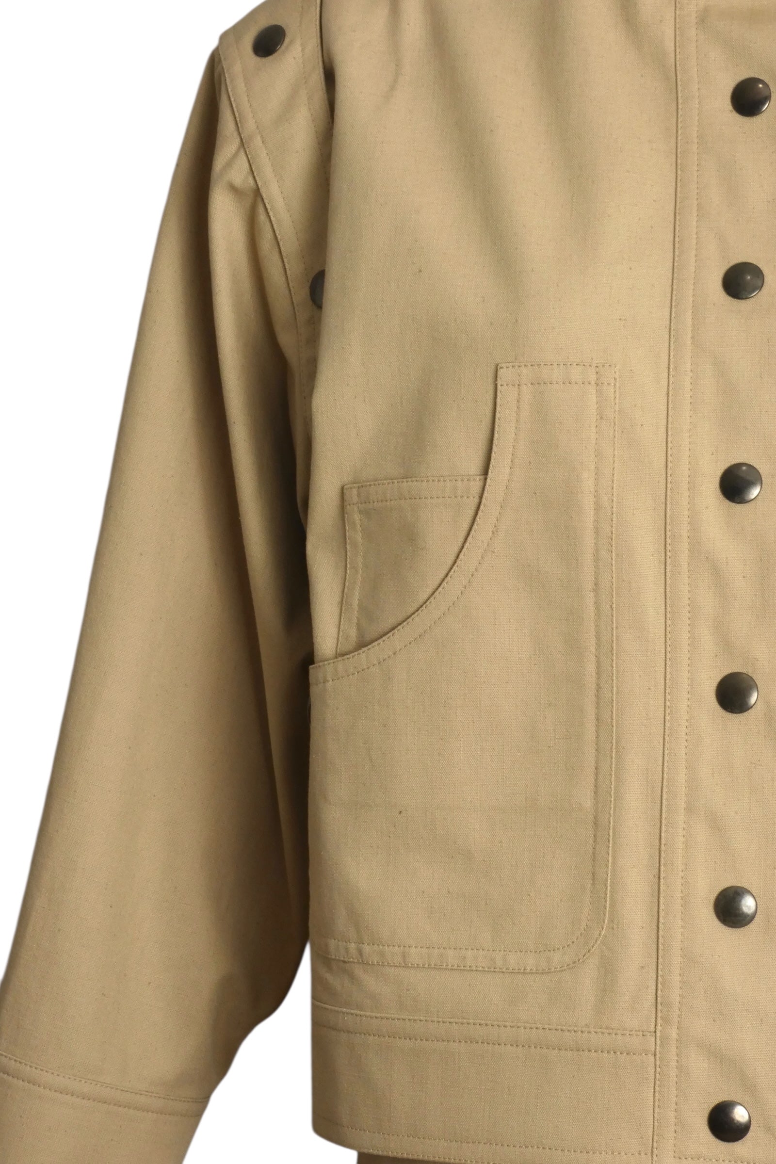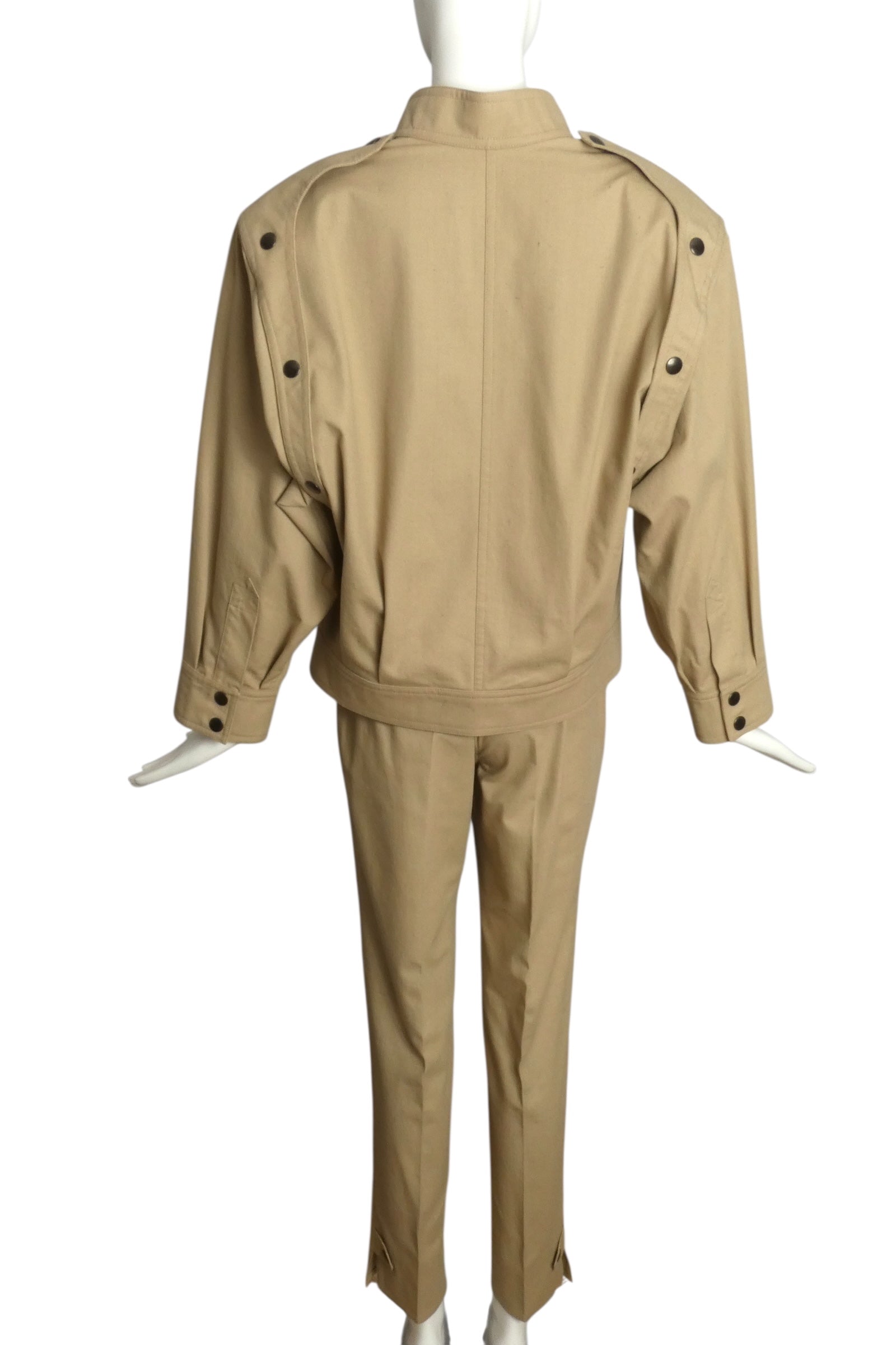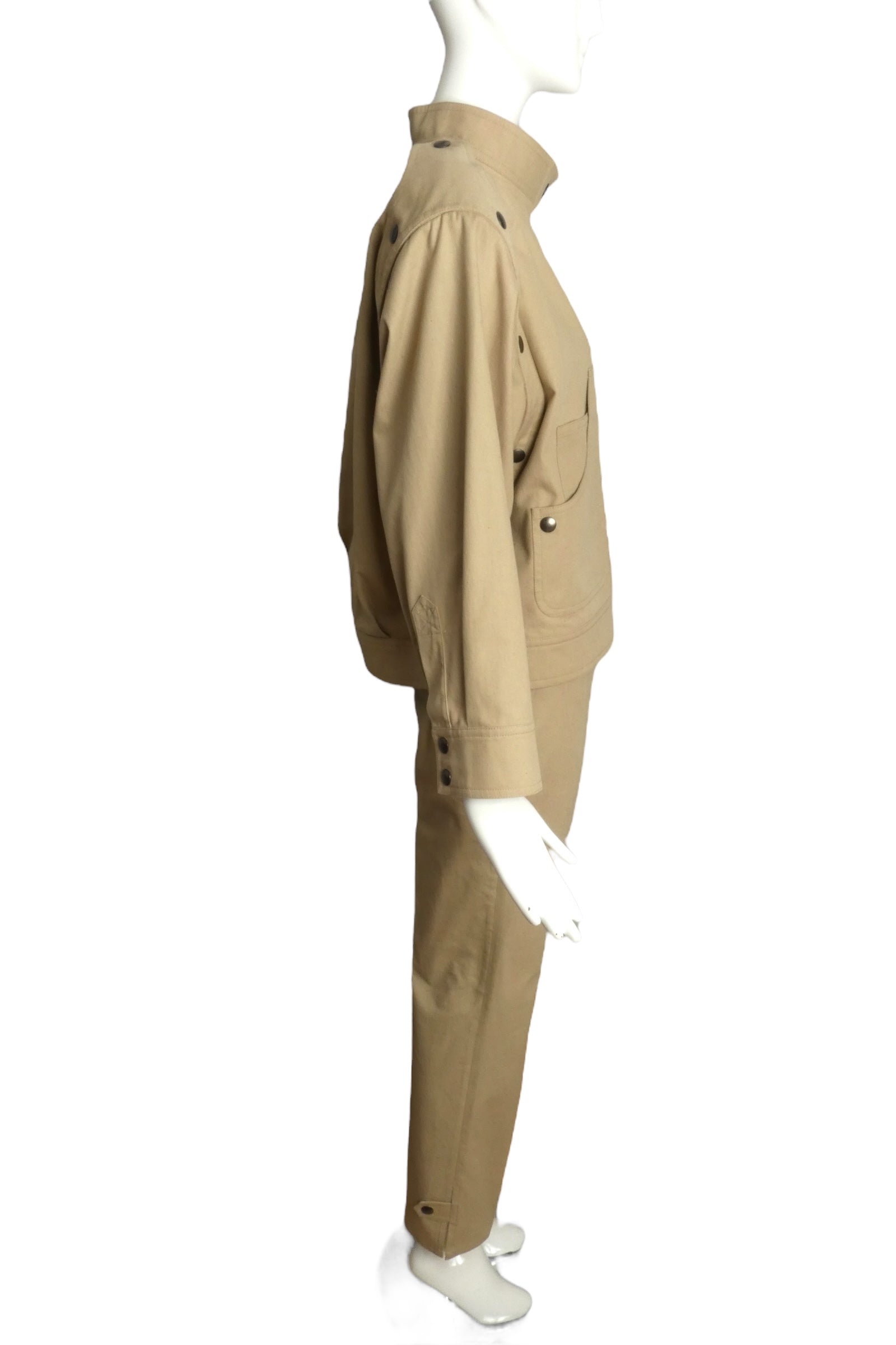 Description: Step into this stunning 1990s Pierre Cardin ensemble. Crafted from soft khaki cotton, this oversized jacket features a sophisticated band collar and snap closures that exude modern charm. The large patch pockets add practicality, while the long sleeves with snap decorations on the shoulders provide a unique flair. Paired with matching flat-front pants that boast inset side pockets, this outfit is perfect for making a statement at any occasion. Elevate your wardrobe with this classic piece that seamlessly blends style and comfort.
