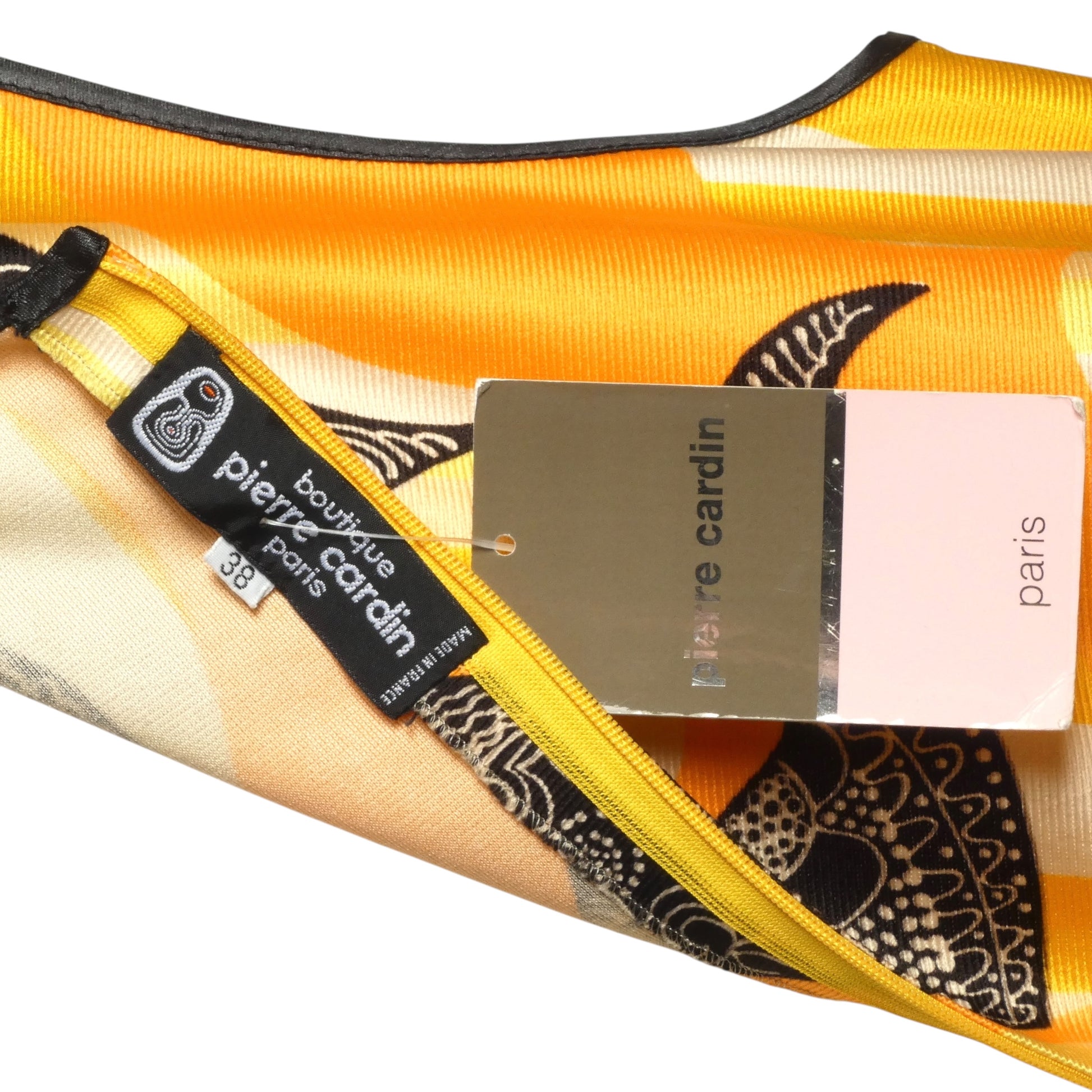 Description: Make a bold statement with this vibrant Pierre Cardin Haute Couture shirt dress from the 1990s. The eye-catching printed nylon fabric showcases a dynamic abstract pattern in orange, yellow, white, and black that captures the spirit of the era. Crisp black piping defines the silhouette with precision and polish, while a practical center back zipper closure ensures easy wear. Versatile enough to dress up or down, this piece celebrates playful color blocking and contemporary design. Perfect for vintage enthusiasts and fashion-forward individuals seeking a conversation-starting piece that combines wearable comfort with unmistakable designer prestige.