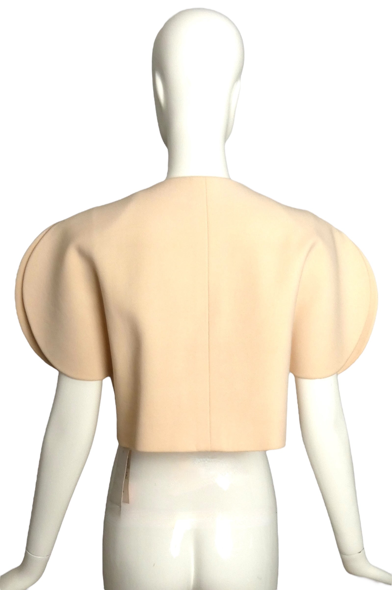 Description: From Pierre Cardin’s 1992 haute couture collection, this playful bolero jacket dazzles in ivory wool. Featuring a scoop neckline and snap closures hidden beneath charming decorative buttons, it’s both stylish and easy to wear. Chic chest welt pockets add a touch of flair, while the oversized bow at the waist brings a fun twist. Rounded panels gracefully extend over the shoulders, giving this jacket a unique, structured silhouette perfect for making a statement.