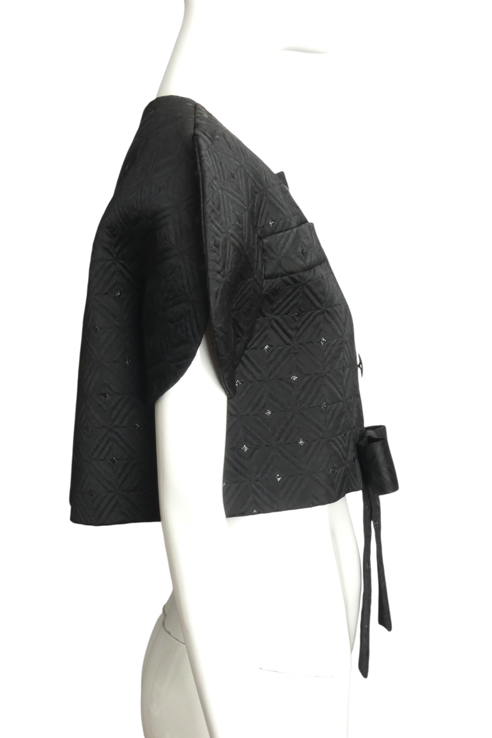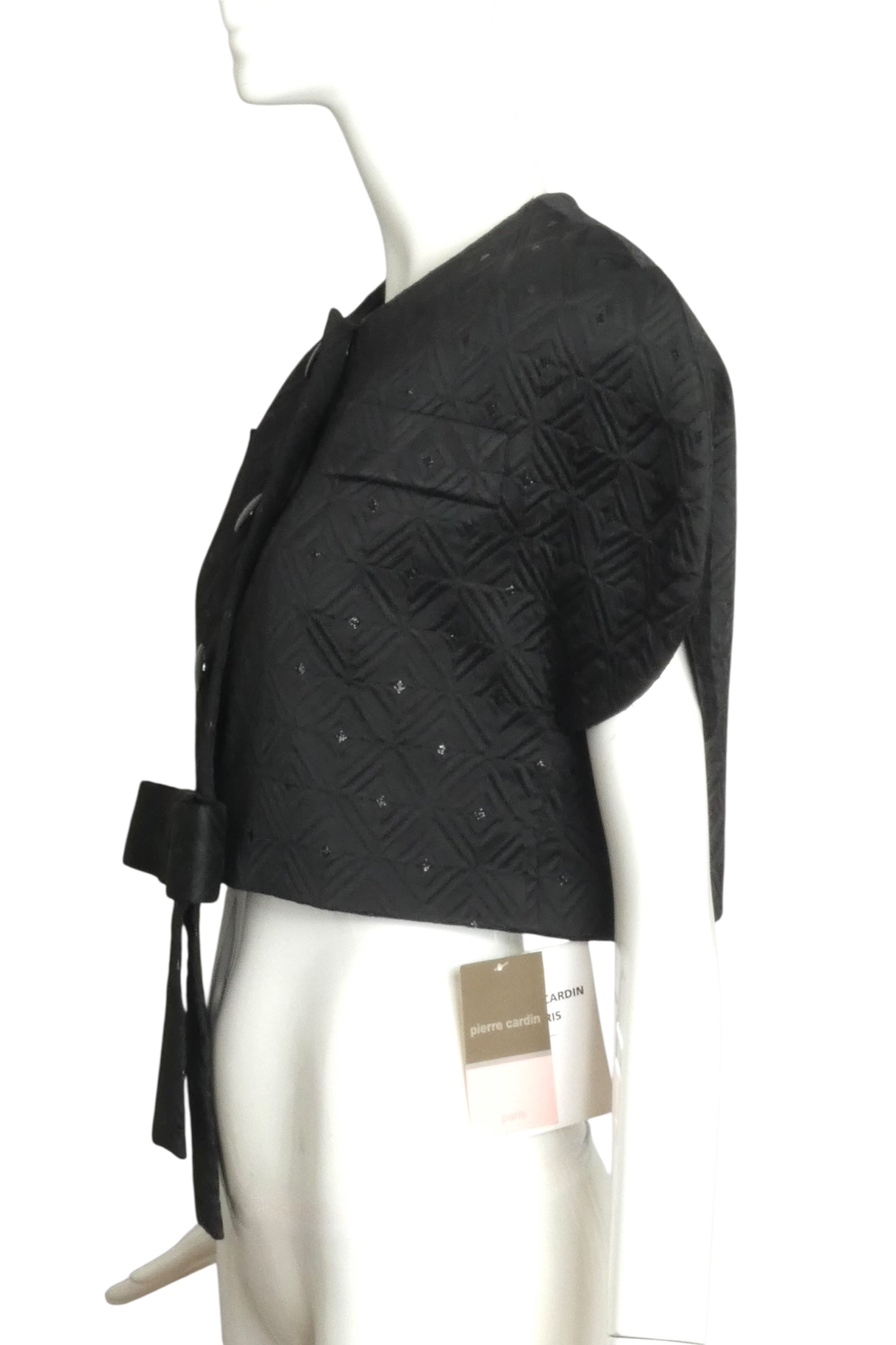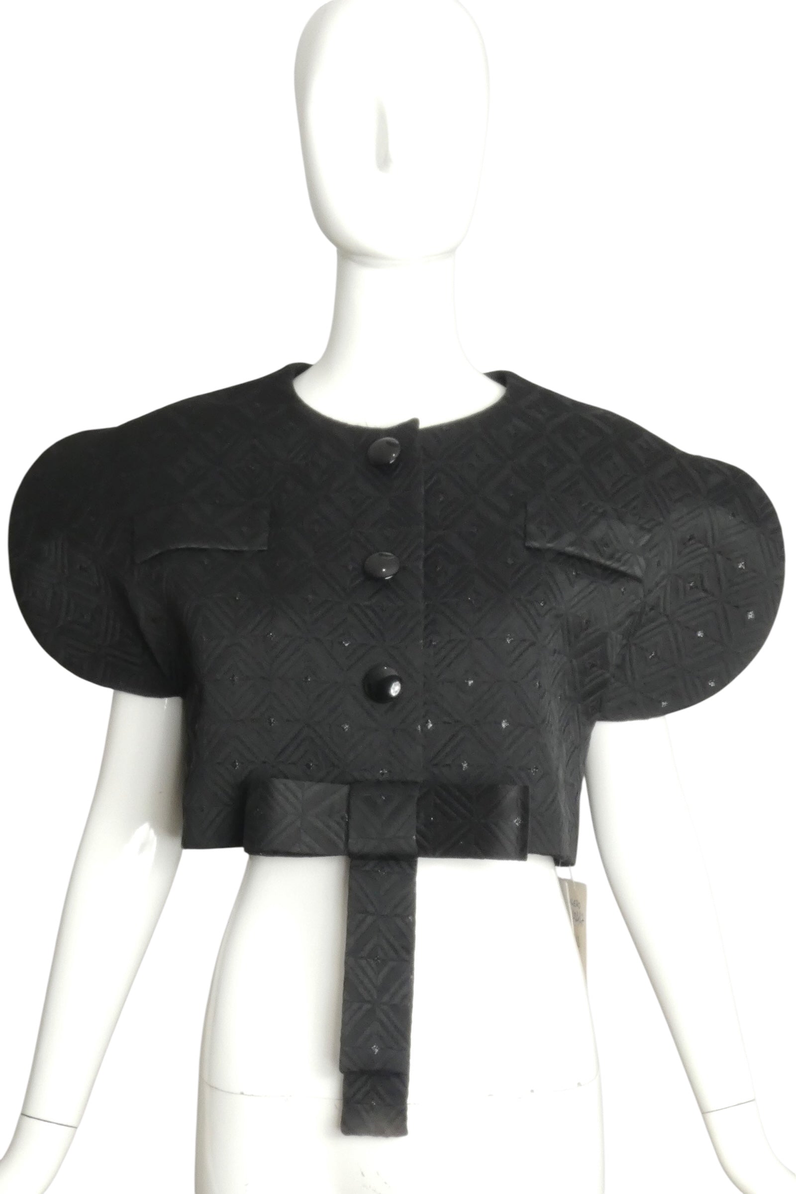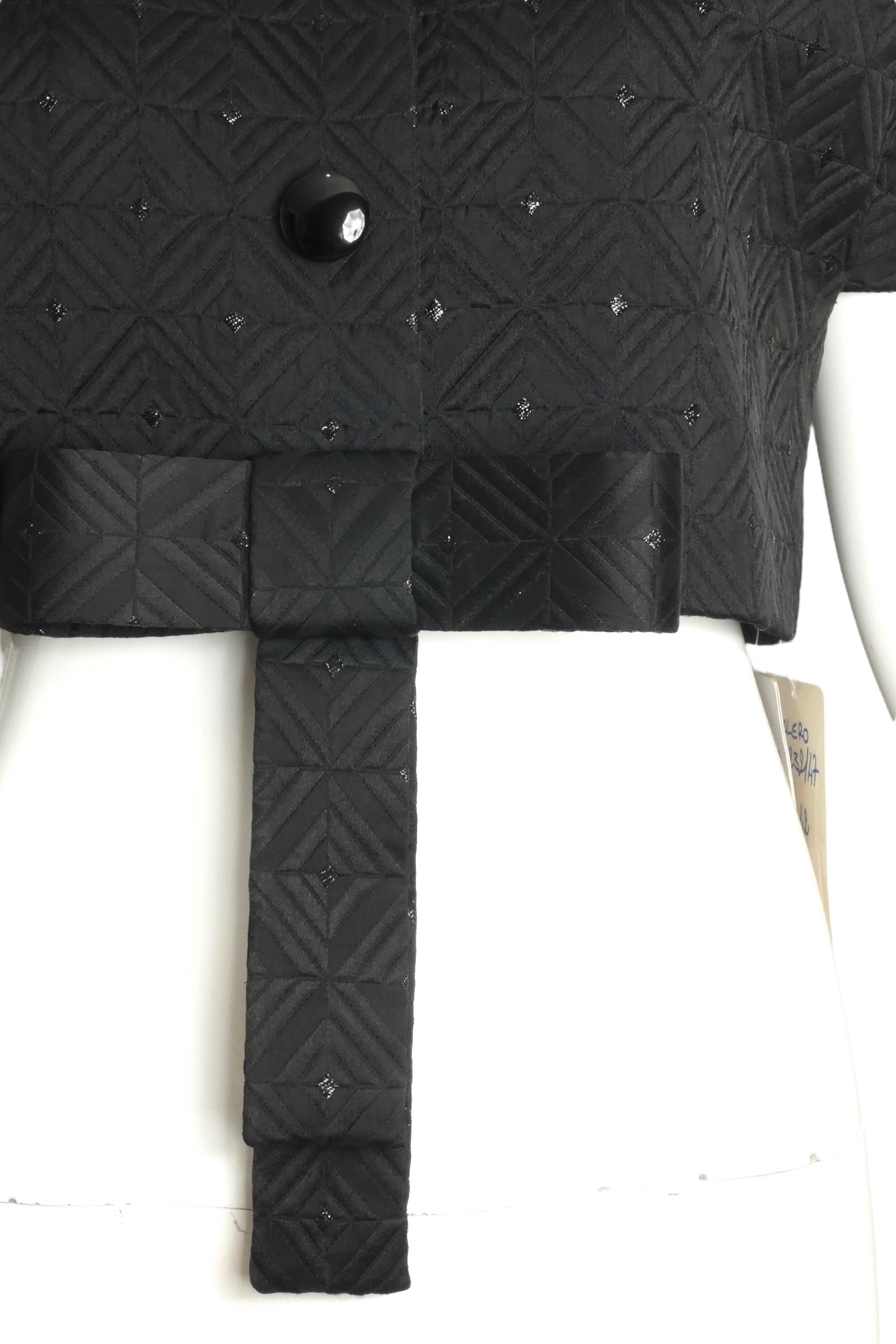 Description: From Pierre Cardin’s 1992 haute couture collection, this playful bolero jacket dazzles in black diamond-patterned brocade. Featuring a scoop neckline and snap closures hidden beneath charming decorative buttons, it’s both stylish and easy to wear. Chic chest welt pockets add a touch of flair, while the oversized bow at the waist brings a fun twist. Rounded panels gracefully extend over the shoulders, giving this jacket a unique, structured silhouette perfect for making a statement.