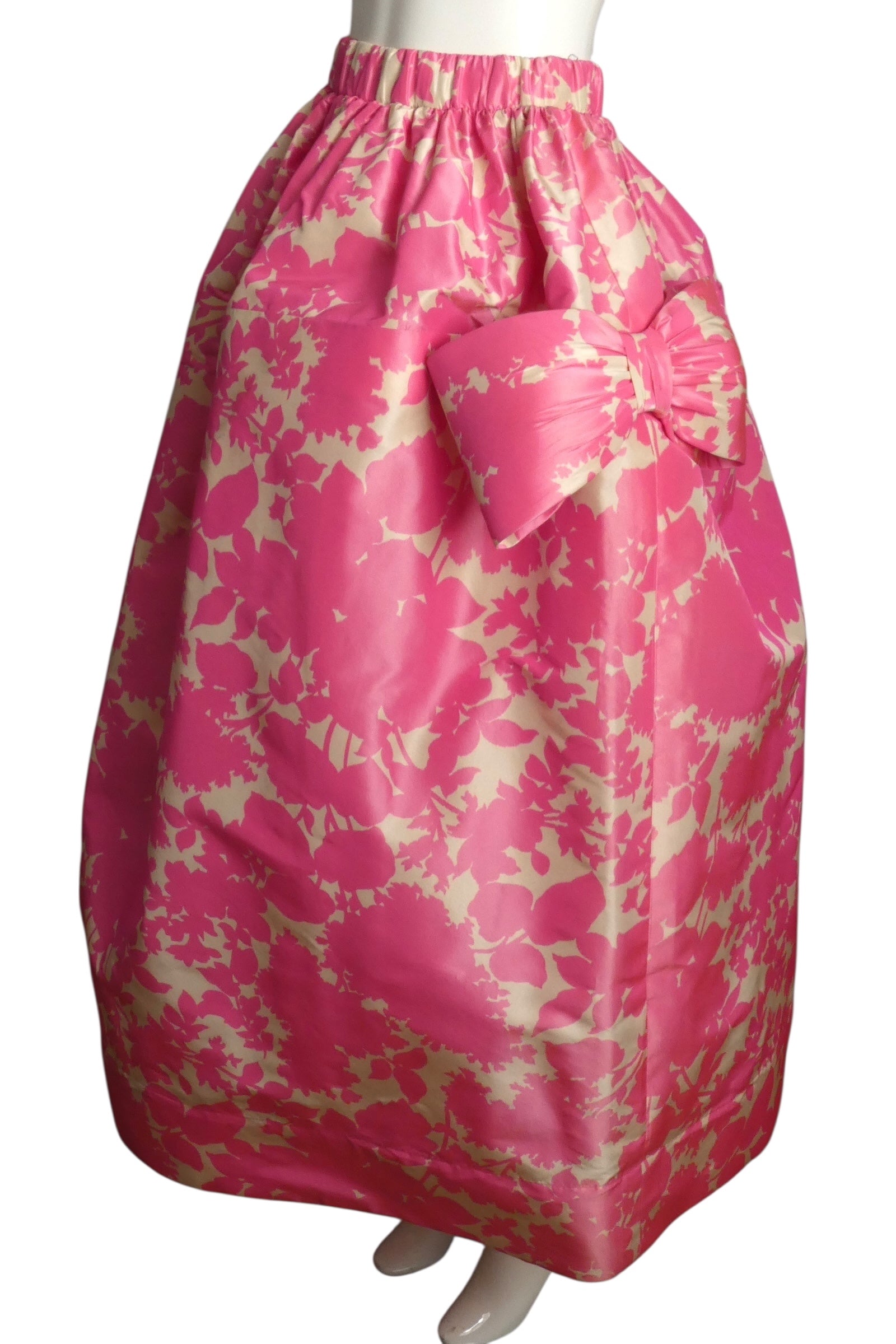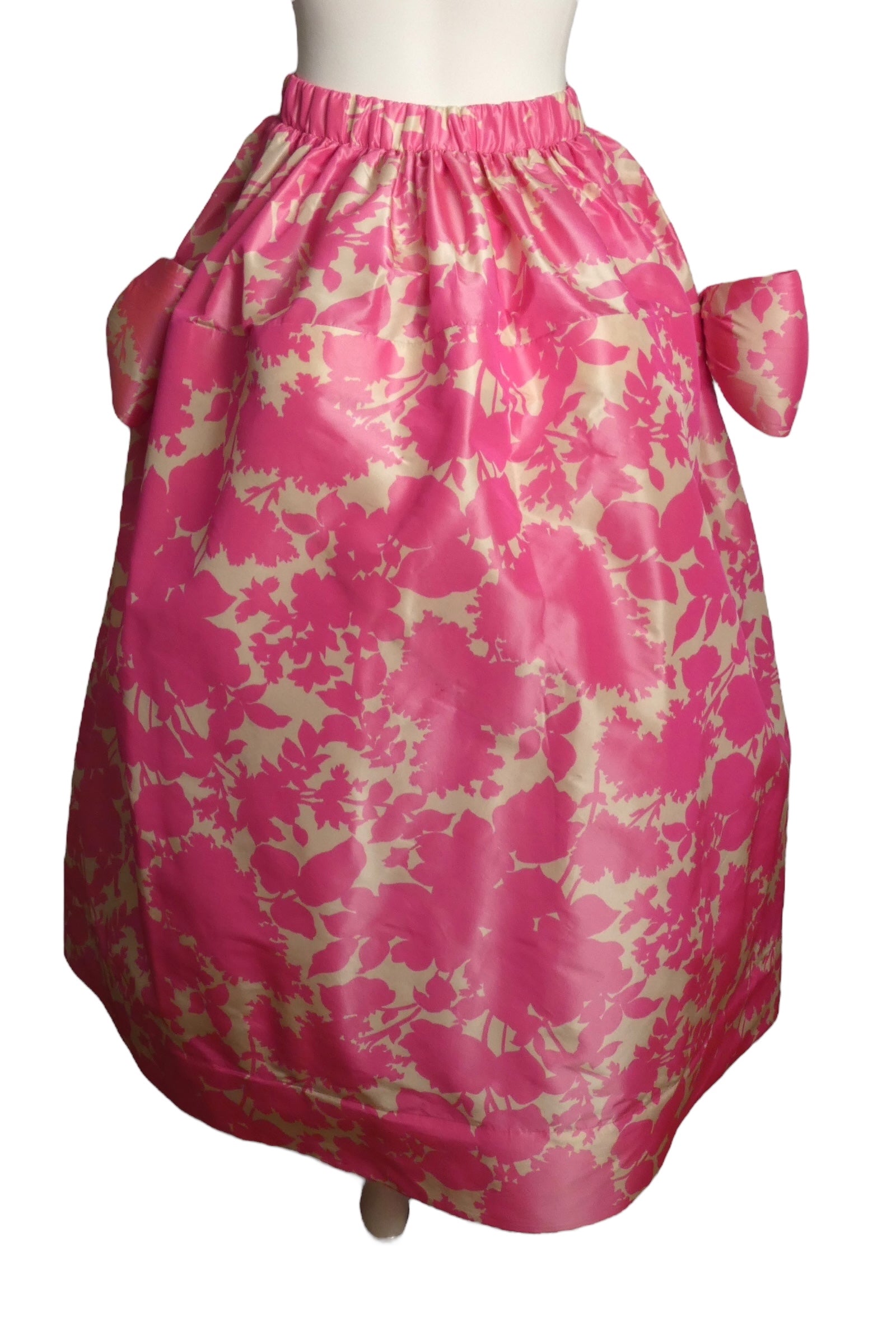 Description: Indulge in pure elegance with this breathtaking Pierre Cardin Haute Couture 1994 ball gown skirt in sumptuous printed silk taffeta. Rendered in romantic pink and white hues, the generously gored skirt cascades in luxurious gathers from a wide elastic-cased waistband. Strategic hip stiffening amplifies the skirt's dramatic volume and silhouette, while magnificent bows positioned at the sides add refined flourish. A showstopping piece that captures the opulence and romance of haute couture's golden era.
