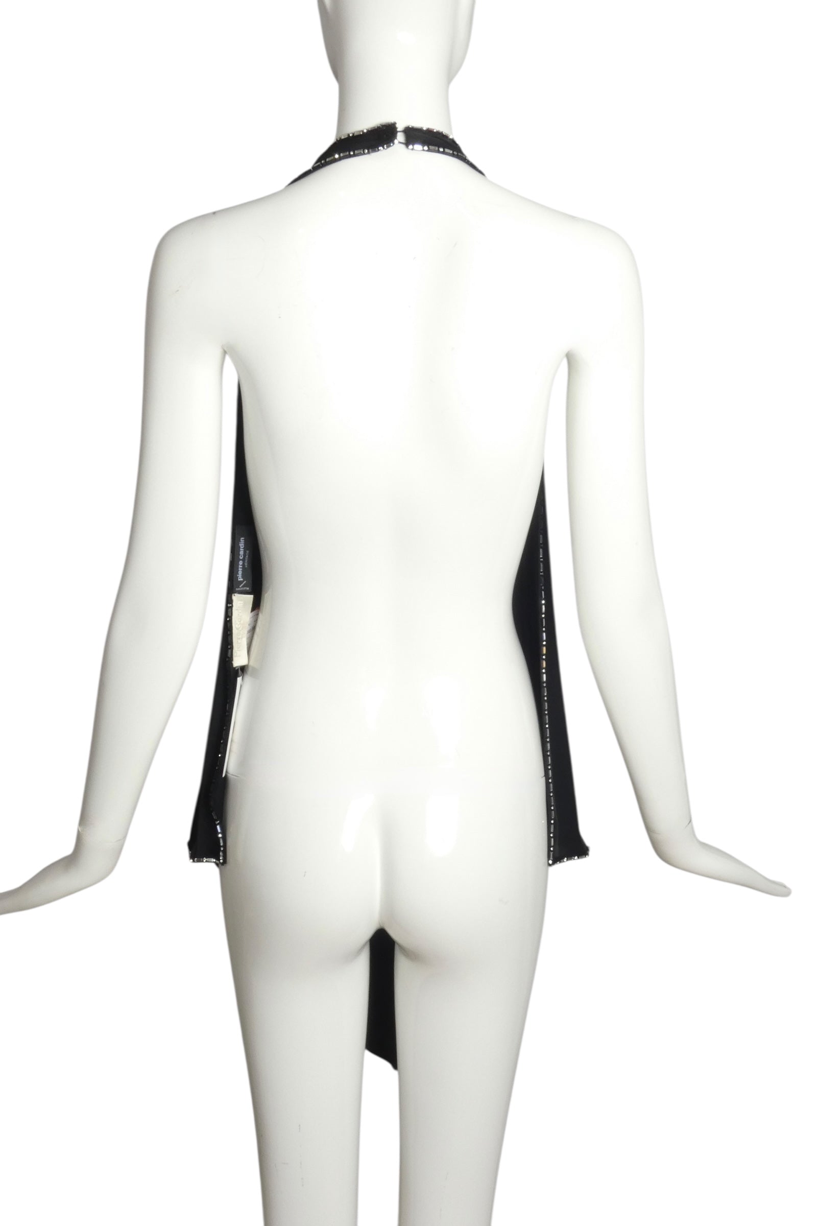 Description: A stunning piece from Pierre Cardin's 1998 haute couture runway collection, this jet black halter top showcases exquisite accordion pleating and shimmering rhinestone trim along the edges. The elegant halter neckline flows gracefully down the front, secured with a belt of your choice for customizable styling. This is a rare opportunity to own an authentic designer piece that captures the sophistication and artistry of late 90s haute couture. Perfect for the discerning collector or fashion enthusiast seeking investment-worthy vintage couture.