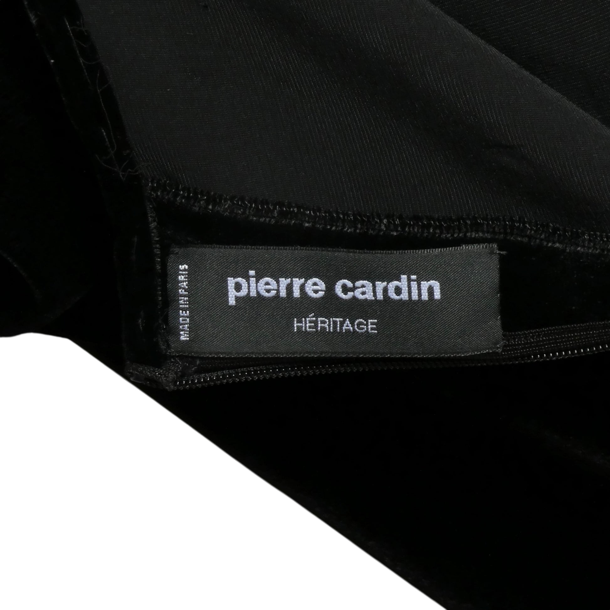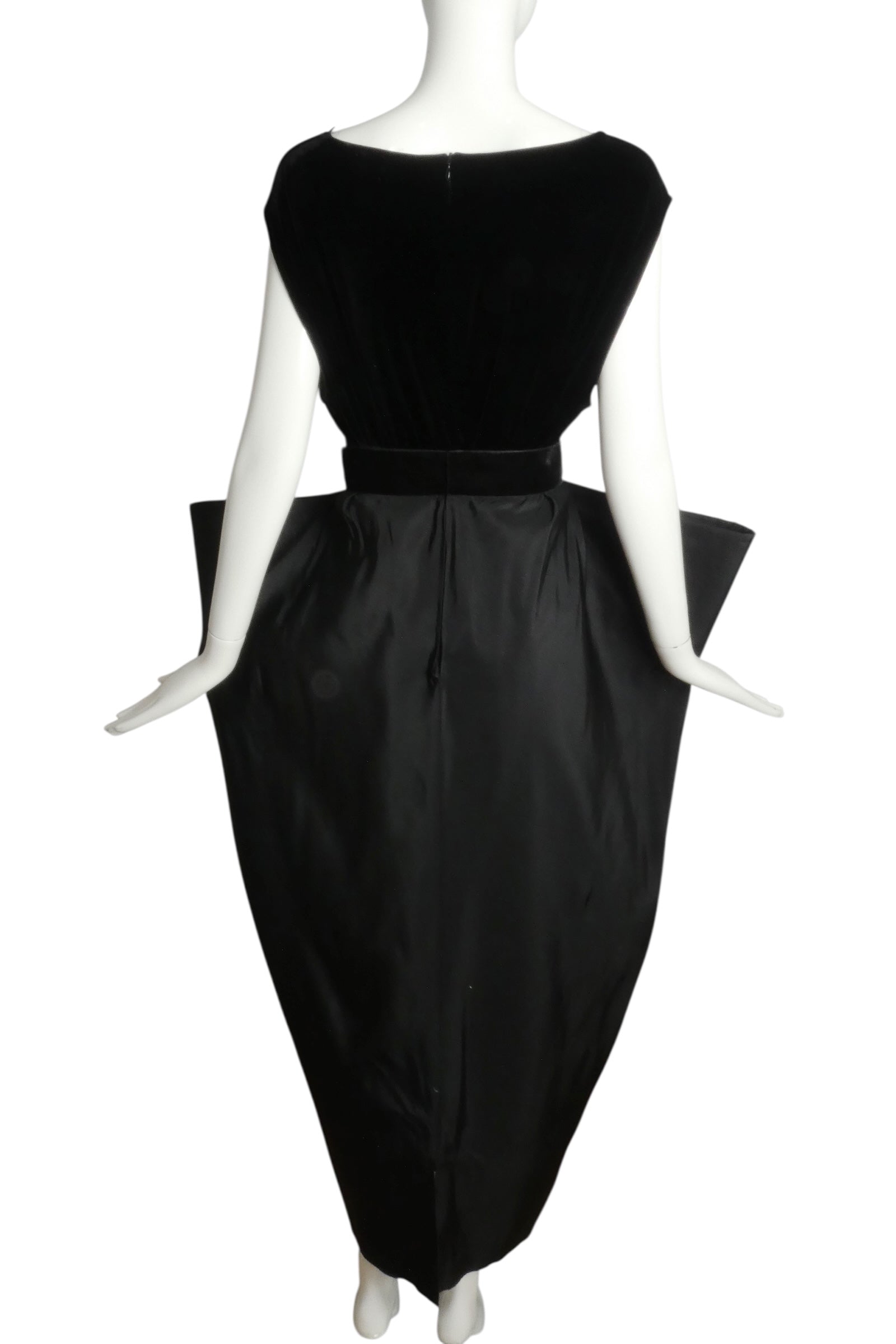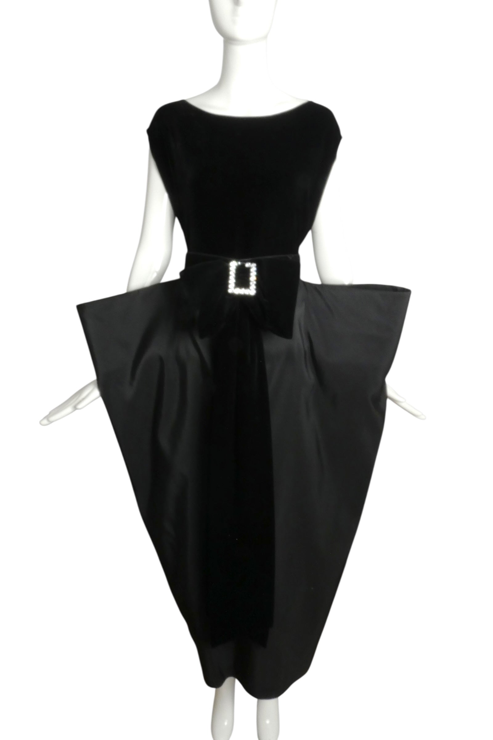 Description: Make an unforgettable entrance in this spectacular Pierre Cardin ensemble from the 2002 haute couture collection. The foundation features a sophisticated black velvet evening dress with a graceful scoop neckline and streamlined silhouette that flows effortlessly without darts or waist seams. The showstopping black taffeta overskirt elevates the look with architectural drama—a luxurious velvet waistband anchors a stunning center front bow embellished with a rhinestone buckle, while looped panniers extend dramatically from the sides to create a head-turning silhouette. This couture masterpiece seamlessly blends elegance with theatrical flair, delivering pure glamour for the collector seeking investment-worthy designer pieces with unforgettable presence.
