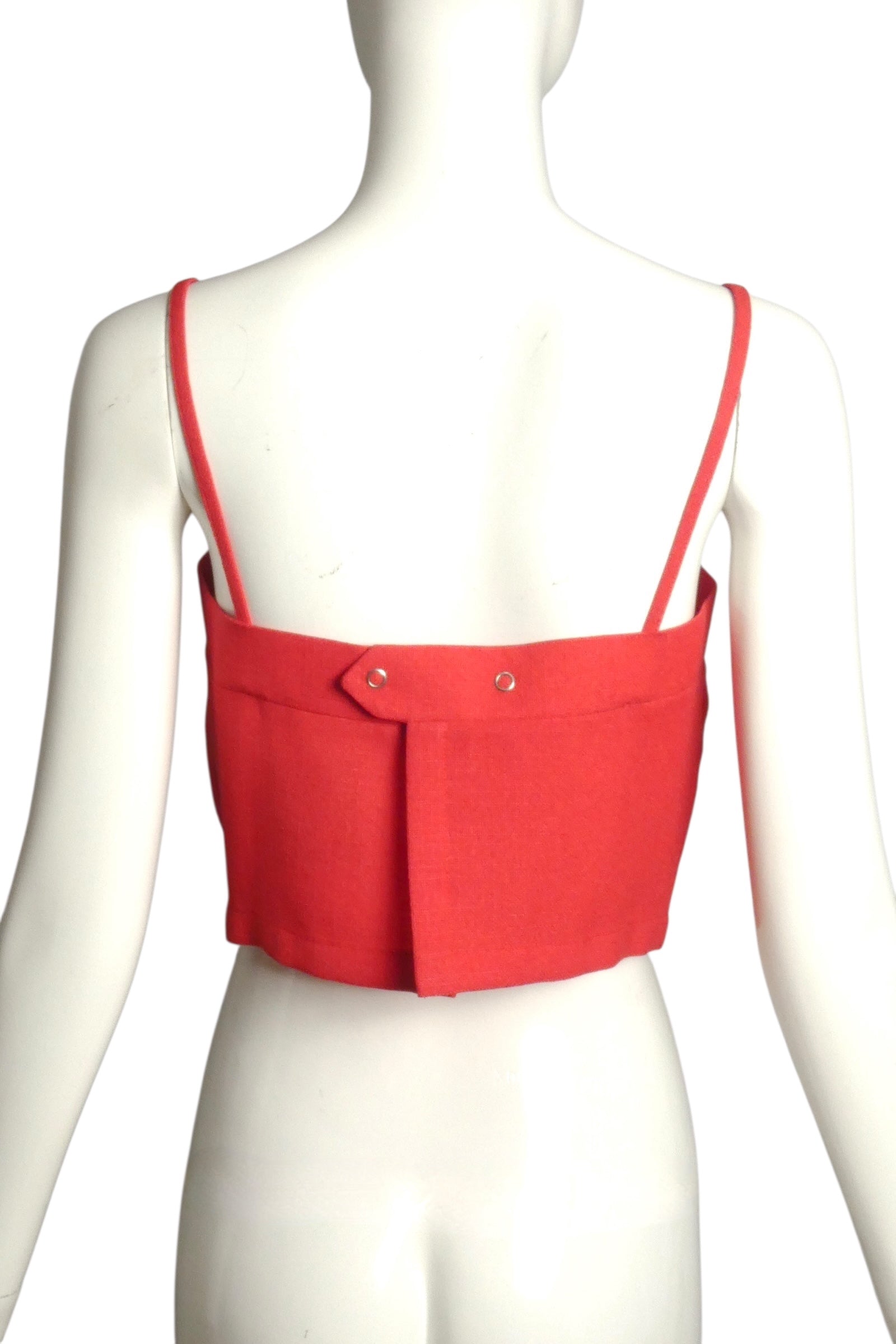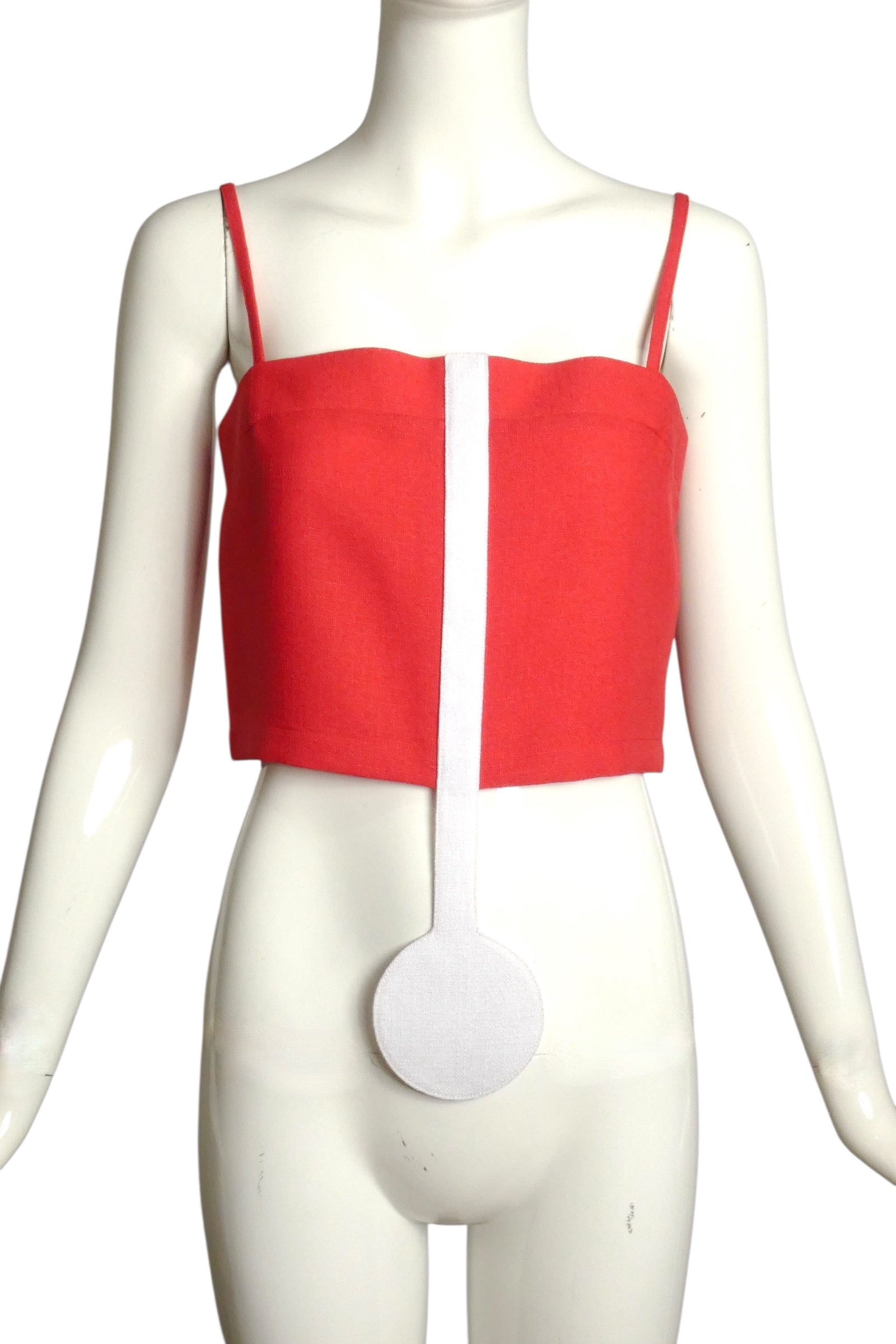 Description: Embrace effortless summer style with this captivating Pierre Cardin Haute Couture top from the 2004 collection. Crafted in vibrant red rayon, this sleek midriff piece features delicate spaghetti straps and a supportive band across the top for a flattering fit. The standout design element—a striking white stripe appliqué that descends the center front and culminates in a bold round medallion—adds artistic flair and movement to the silhouette. Perfect for warm-weather occasions, this sophisticated top pairs beautifully with tailored bottoms or flowing skirts, offering the perfect balance of minimalist elegance and designer detail.