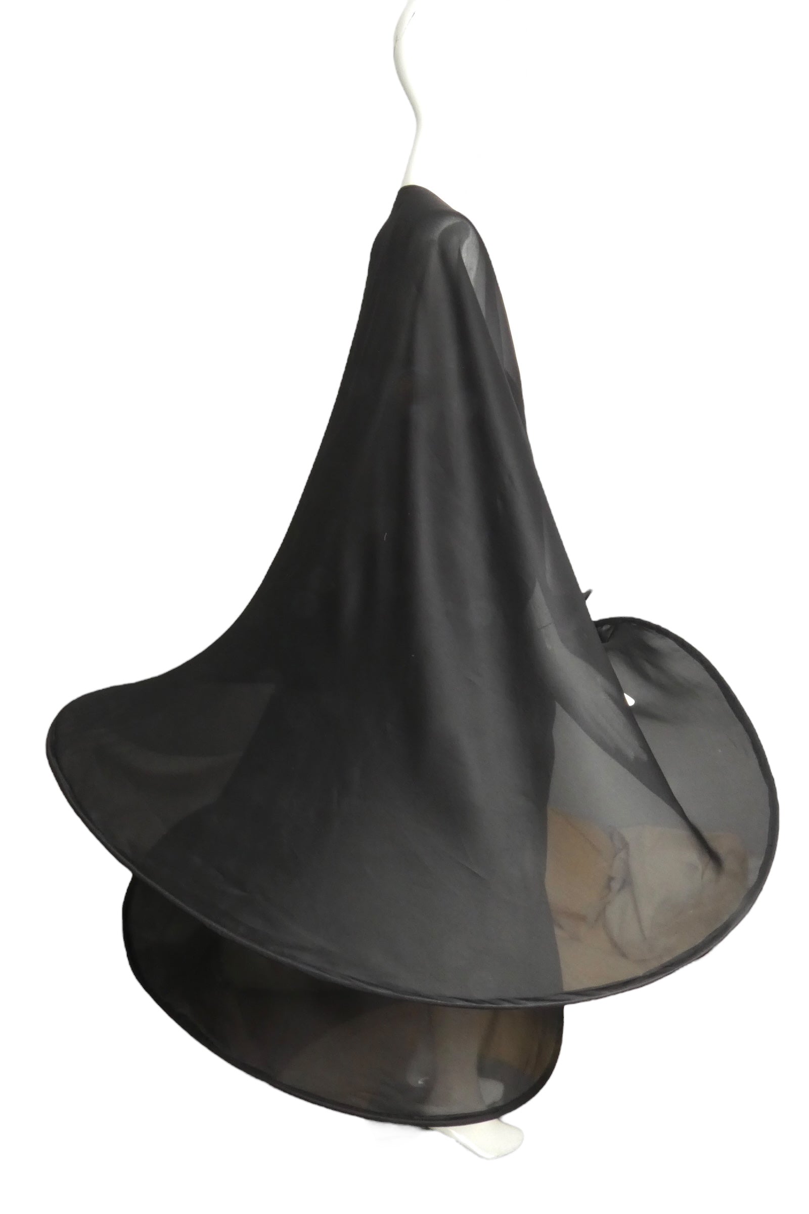 Description: This striking coat is crafted from black silk organza, featuring an oversized hoop along the edge that shapes a bold, circular silhouette. The design includes a central opening that sits on your shoulders, enabling the fabric to fold while staying close to your body. Practical side slits provide room for your arms, blending avant-garde style with wearability.