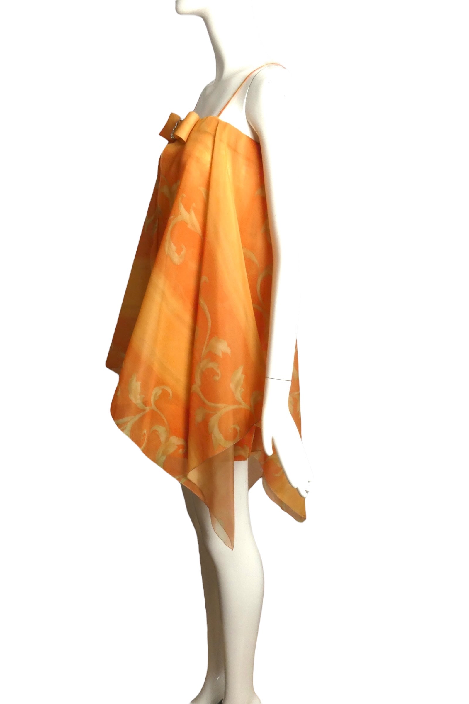 Description: From Pierre Cardin's 2008 collection, this charming slip dress features delicate floral-print organza and slender spaghetti straps for an airy look. A flowing over dress cascades to pointed hems, adding graceful movement. The standout detail—a large bow with a sparkling rhinestone buckle at the chest—brings a touch of glamour to this effortlessly elegant piece. Perfect for those seeking a blend of sophistication and whimsy in their wardrobe.