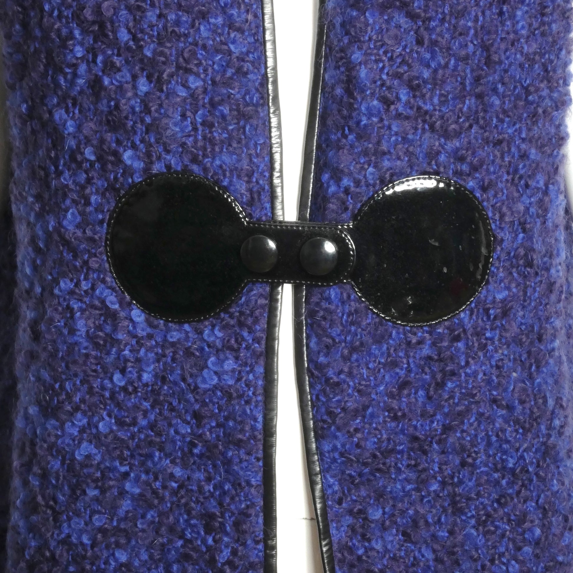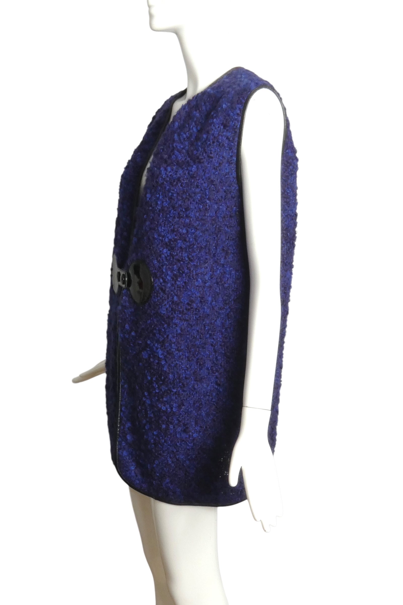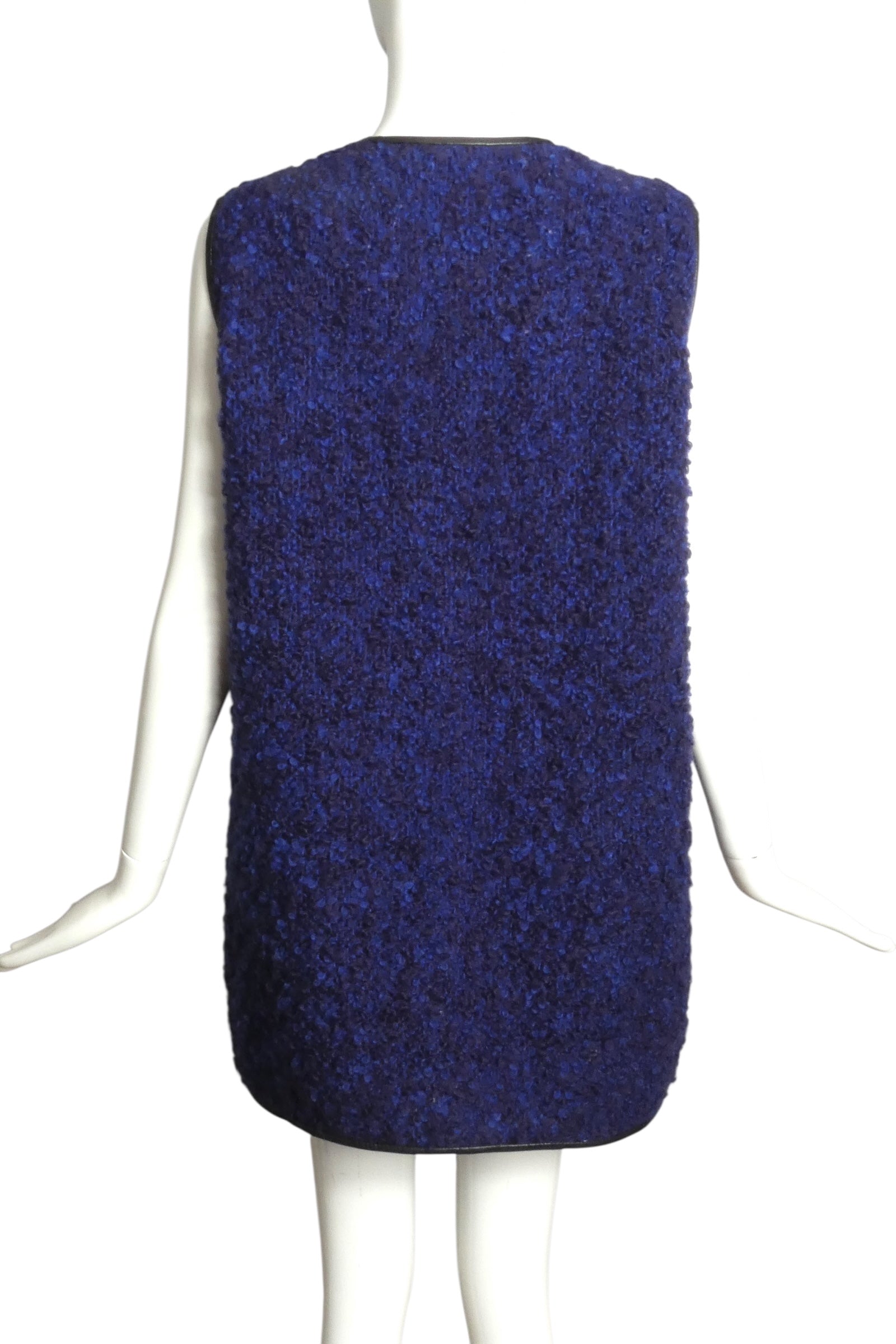 Description: From Pierre Cardin's prestigious 2008 Haute Couture collection, this stunning wool boucle knit vest showcases sophisticated color blocking in rich blue and navy tones. The refined silhouette features luxurious black leather piping that frames the neckline and armholes, while a sleek patent leather tab with snap closure at the front waistline adds a modern, polished touch. Perfect for elevating any ensemble with designer elegance and timeless craftsmanship.