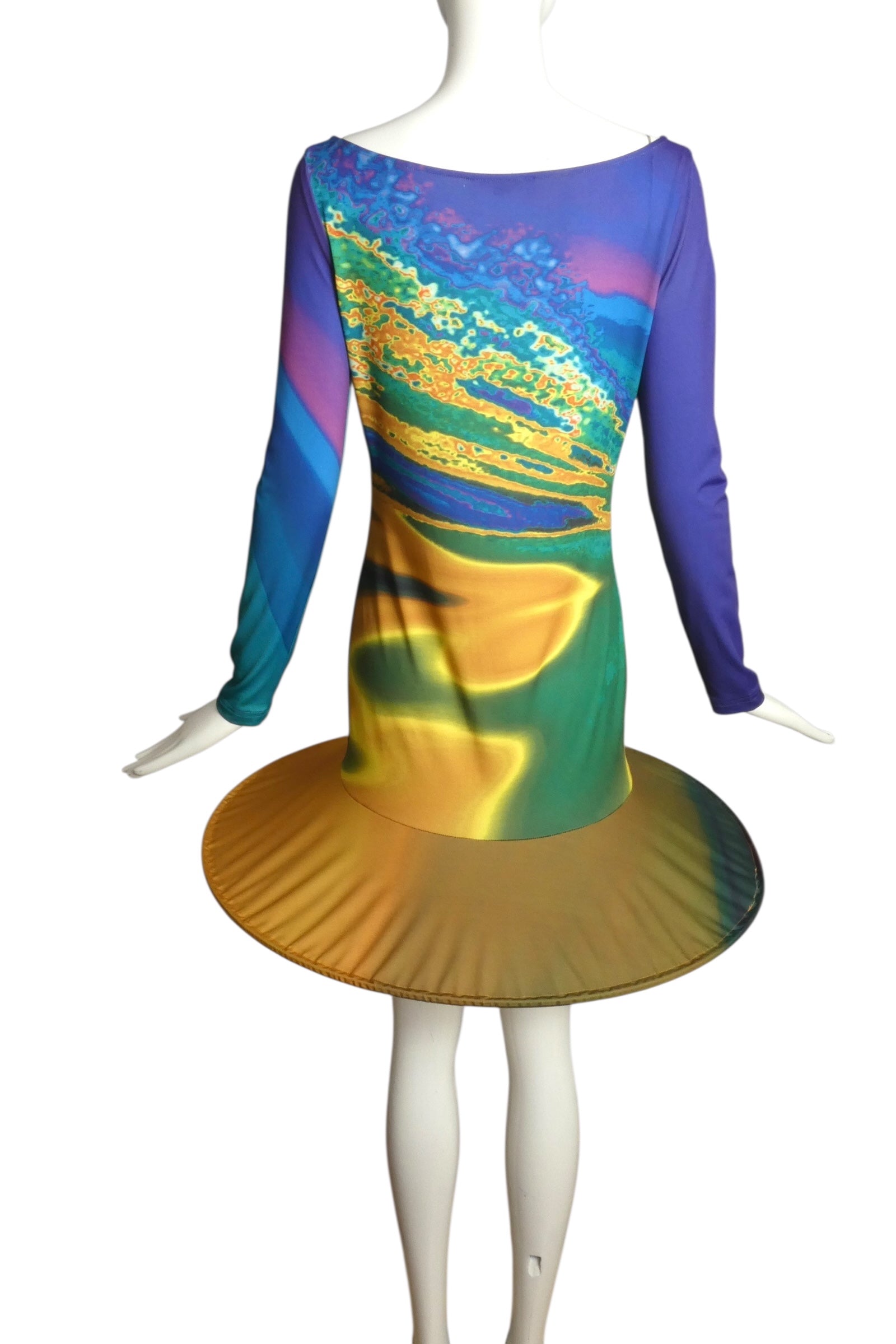 Description: Discover a show stopping piece from Pierre Cardin's Spring 2009 Haute Couture collection. This striking multi-color jersey knit dress features the designer's signature architectural silhouette, complete with a dramatic saucer hoop that defines the lower skirt. The bold printed knit creates movement and visual interest, while the structured hoop adds an avant-garde edge that captures Cardin's innovative design philosophy. A true collector's piece for those who appreciate high fashion history and statement-making style.