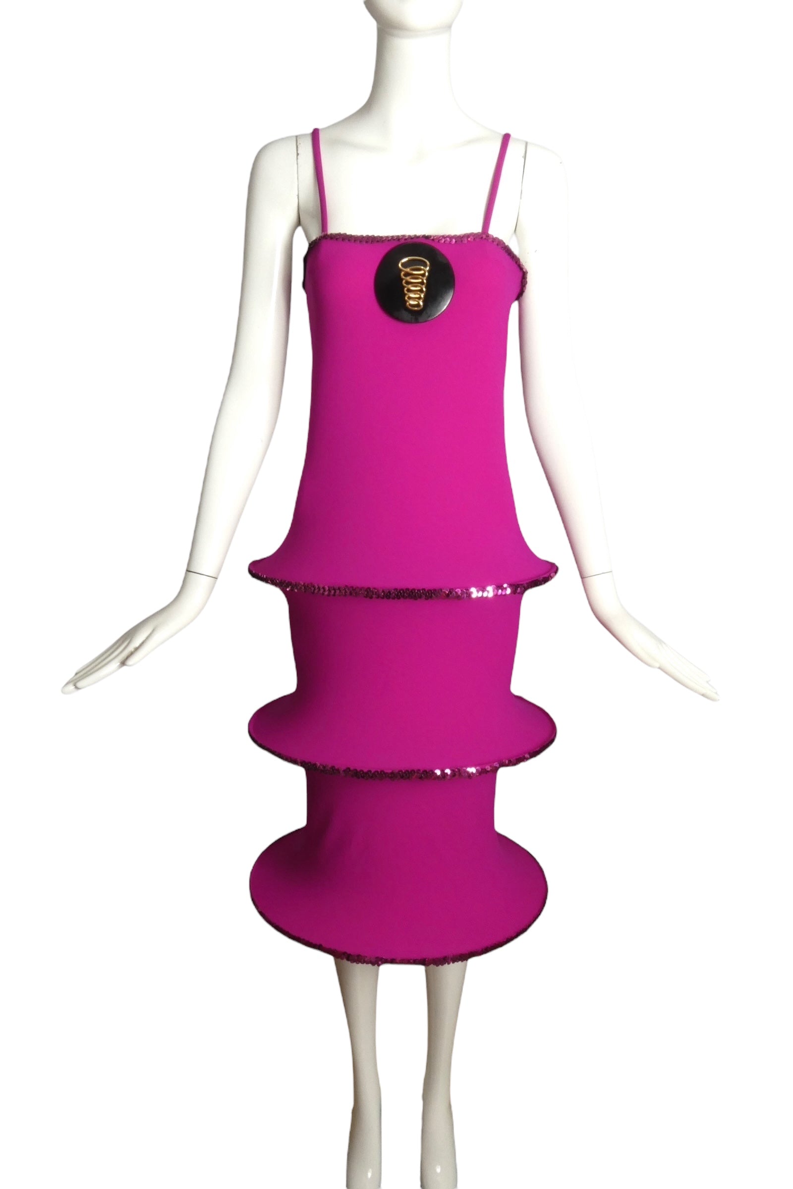 Description: Captivate in this iconic Pierre Cardin slip dress from the 2009 collection—a stunning fusion of elegance and architectural innovation. Rendered in luxurious raspberry knit, the minimalist silhouette features delicate spaghetti straps and is anchored by a striking patent leather medallion at the chest, crowned with a gold-tone spiral detail that adds contemporary edge. The skirt showcases Cardin's signature three-ring hoop construction, creating a sculptural, geometric form that moves with fluid grace. Sparkling raspberry sequins trim the hemline for added luminosity and dimension. This is haute couture that celebrates both restraint and drama—a collector's treasure that embodies Cardin's visionary approach to modern silhouettes and timeless sophistication.
