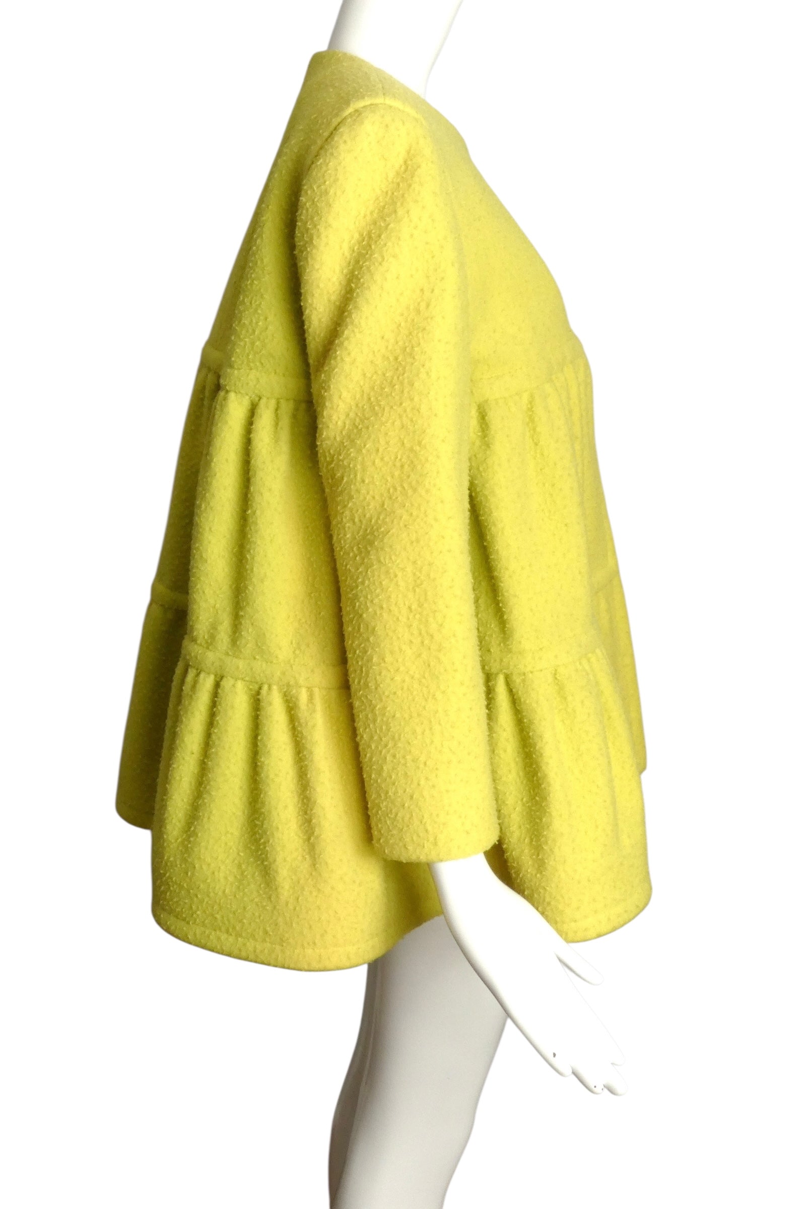 Description: This striking chartreuse jacket from Pierre Cardin’s 2009 couture collection features a distinctive pilled texture that commands attention. Designed in a baby doll silhouette, it offers a scoop neckline paired with a curved placket secured by black snap closures. The gathered skirt falls from the raised waistline, while the long sleeves conclude with a neatly turned-under finish, showcasing expert tailoring.
