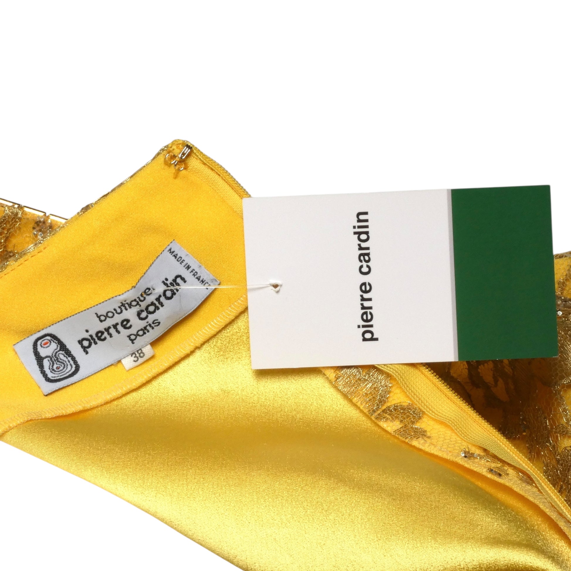Description: From the 2010 Pierre Cardin collection, this radiant yellow shift dress combines luxurious silk crepe with an enchanting overlay of metallic gold floral lace adorned with sparkling glitter accents. The scoop neckline and majestic rhinestone trim create an elegant focal point, while matching embellishment frames the armscyes for cohesive sophistication. A center front slit adds graceful movement, and strategic hemline stiffening creates a stunning circular silhouette in the skirt. Perfect for those seeking vintage designer elegance with show-stopping sparkle and refined construction.