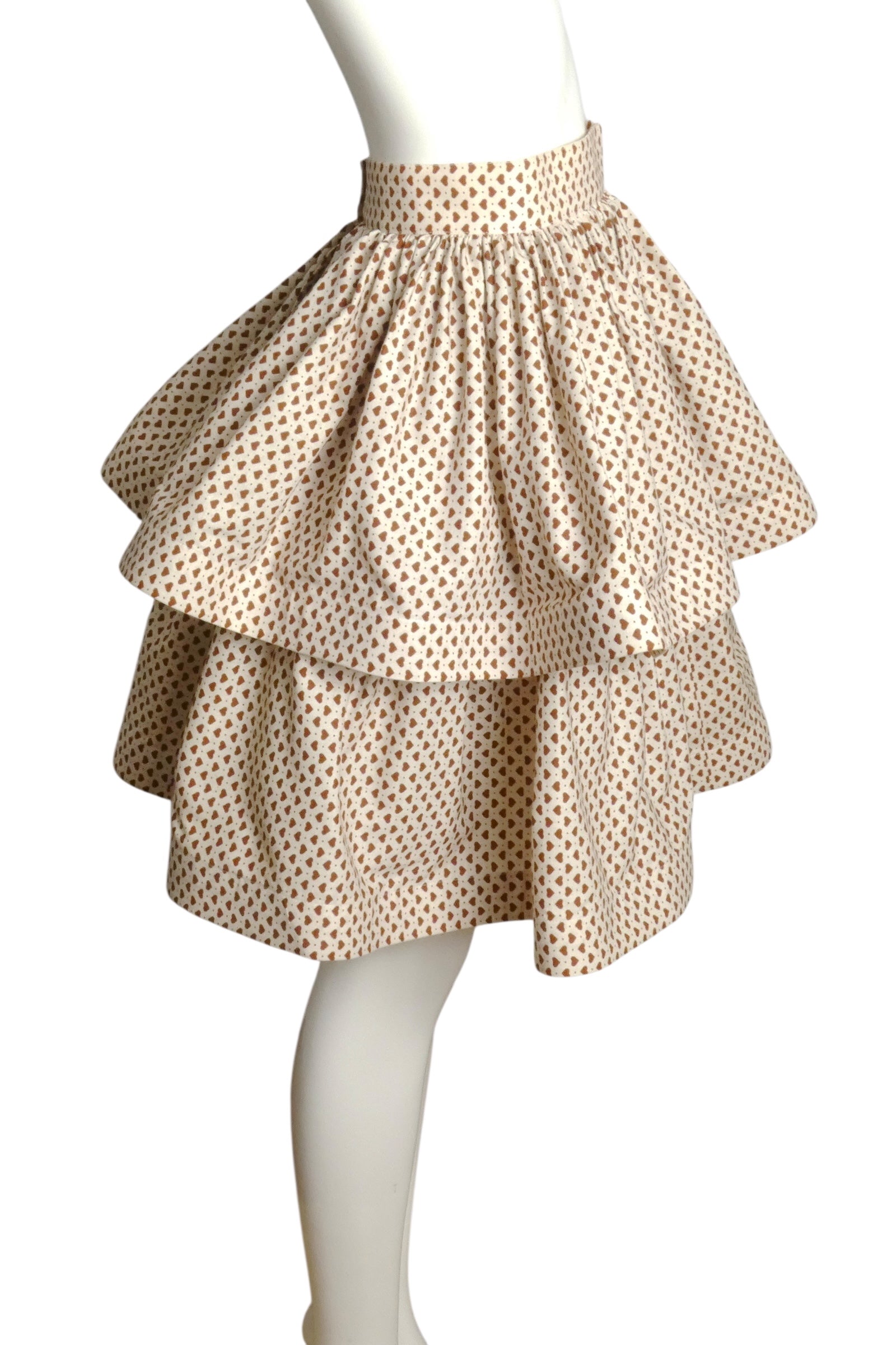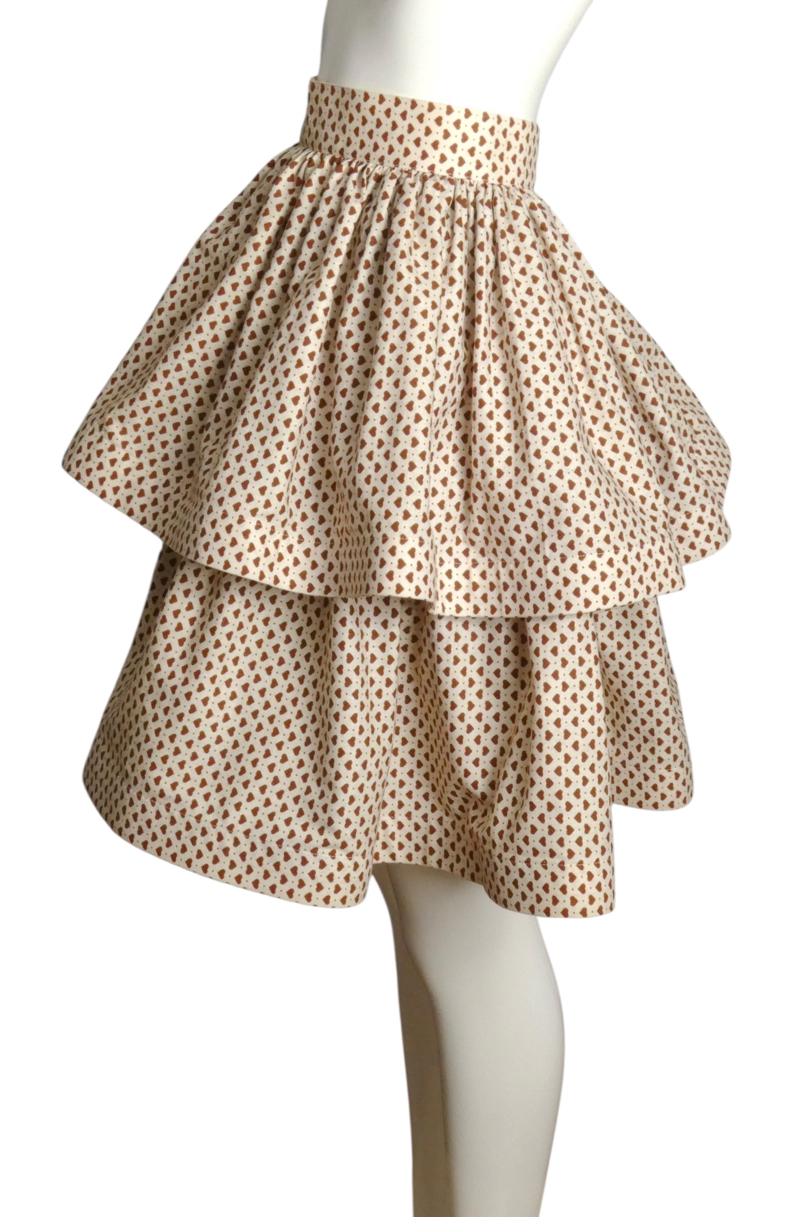 Description: Step into summer with this charming Pierre Cardin Haute Couture cotton skirt. Featuring a delicate white fabric adorned with brown hearts and dots, the tiered design gathers gracefully from a wide waistband. The stiffened hem adds volume and shape, giving the skirt a playful, flattering silhouette perfect for sunny days and stylish outings.