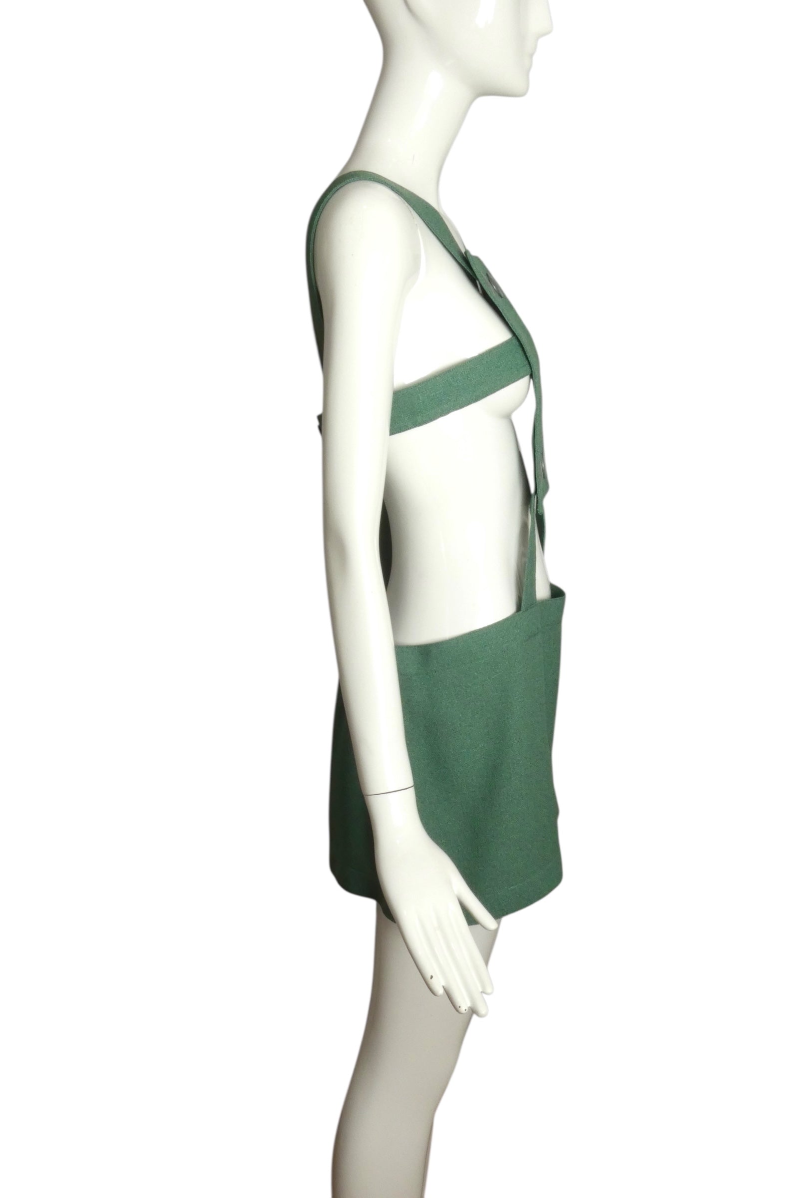 Description: Step back into the golden age of haute couture with this charming Pierre Cardin jumper from the iconic 1977 collection. Rendered in a luxurious green rayon blend, this piece showcases a striking center front shield embellished with gleaming silver buttons that catch the light beautifully. Adjustable straps wrap around the body and connect to a chic low-rise mini skirt, creating a playful silhouette that epitomizes '70s sophistication. A rare find for vintage collectors seeking authentic designer pieces with undeniable style.