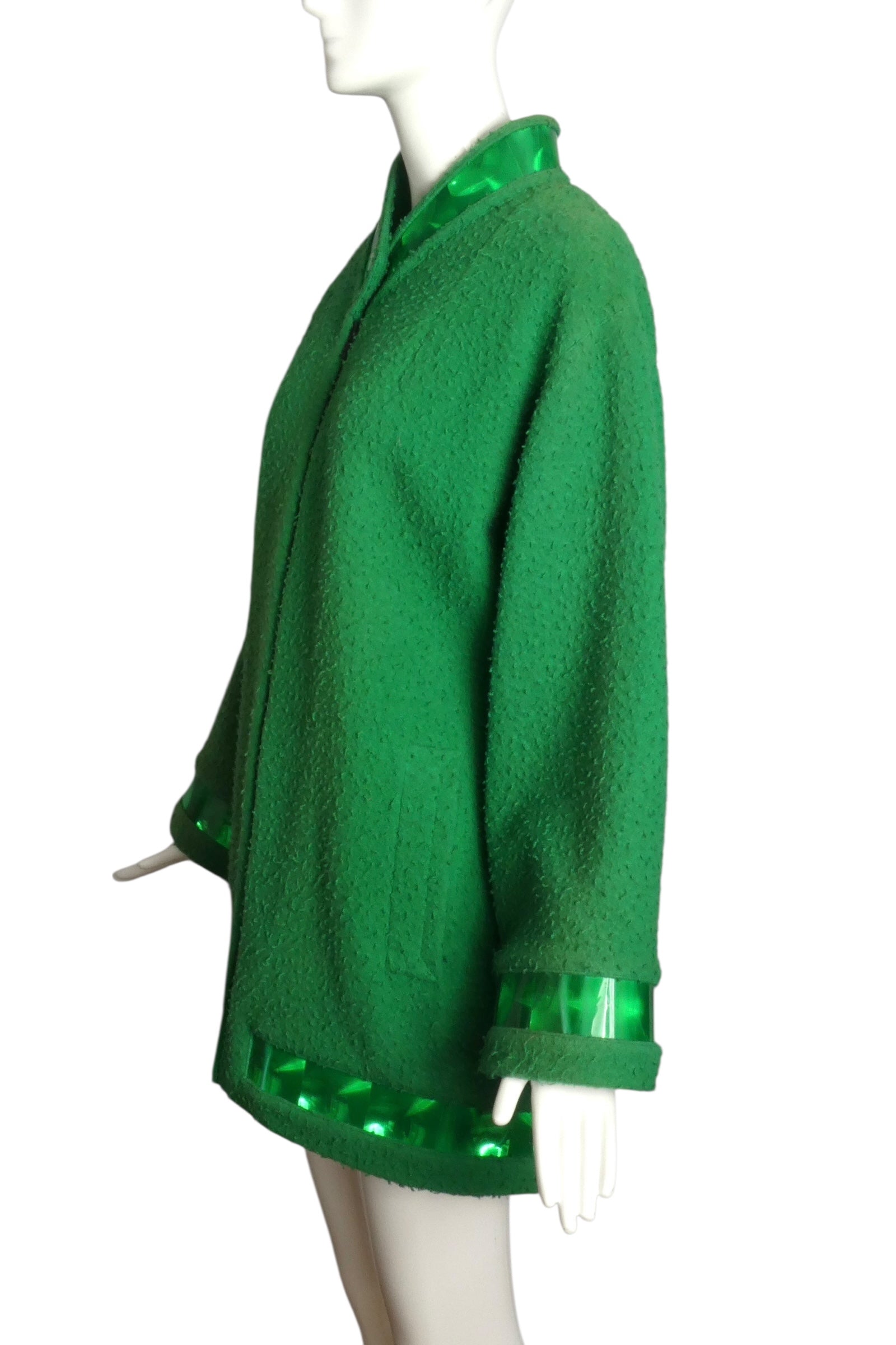 Description: This fabulous Pierre Cardin green wool coat from the 2008 collection is a true statement piece for the discerning vintage enthusiast. Crafted in luxurious wool, the coat features a distinctive band collar adorned with eye-catching hologram vinyl trimming that cascades along the neckline, hemline, and wrists for an avant-garde touch. The streamlined silhouette is enhanced by a front zipper closure and practical welt pockets at the stomach. Perfect for elevating any ensemble with high-fashion flair and timeless elegance.
