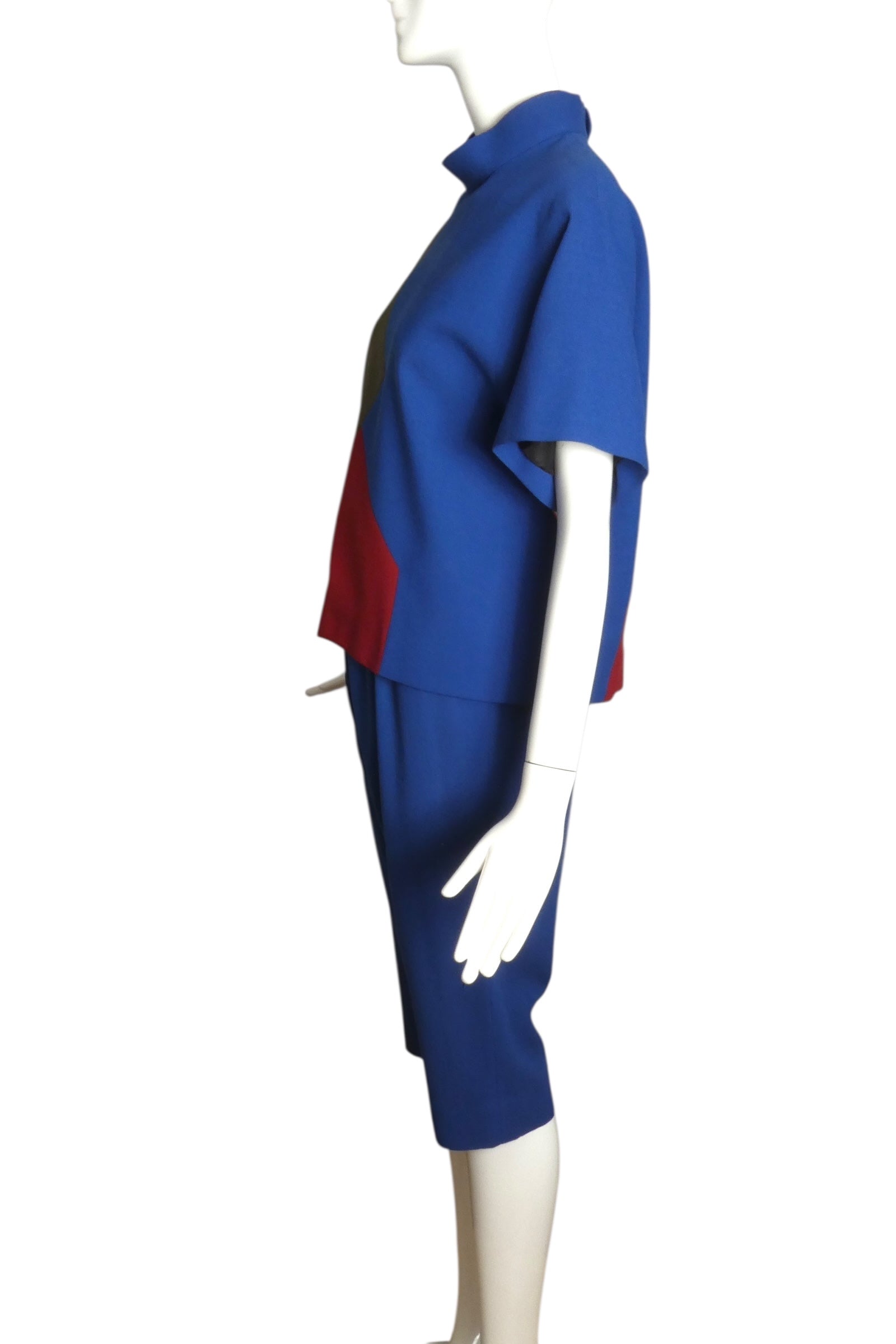 Description: Step into haute couture history with this striking Pierre Cardin two-piece ensemble from the 2010 collection. The sculptural top features a distinctive band collar with snap closures at the back, while bold color-blocking and geometric patterns create visual intrigue across the front and back. The coordinating wool pants showcase a generous waistband with snap closures and gracefully gathered legs—a design choice that adds movement and sophistication. This architectural ensemble exemplifies Cardin's visionary approach to modern tailoring, making it an exceptional investment piece for collectors and fashion enthusiasts who appreciate avant-garde design and impeccable craftsmanship.