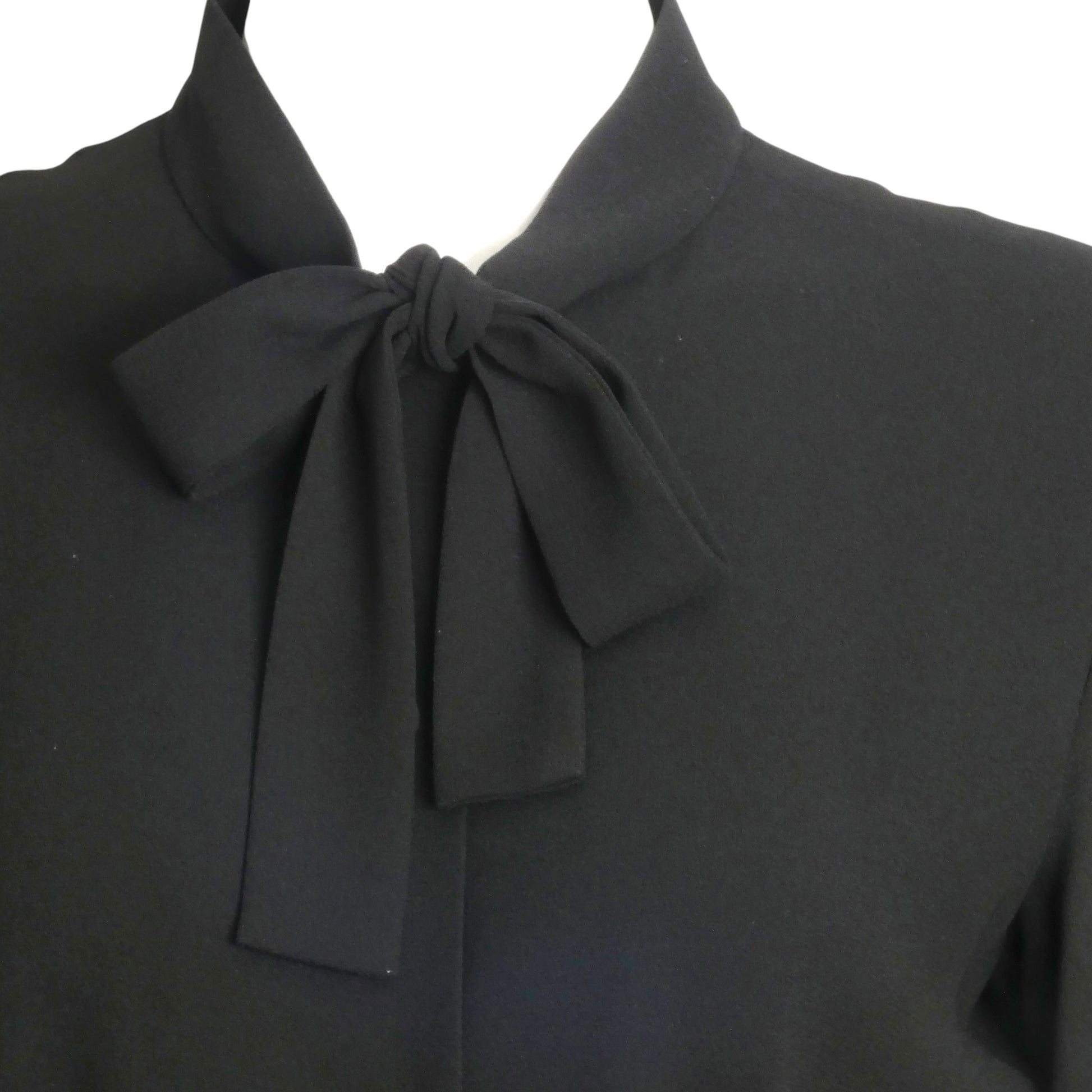 Description: Step back into the chic 1970s with this playful Pierre Cardin black rayon crepe dress. Featuring a charming shirtwaist style with a sash tie at the neck and button closures down the front, it hugs your natural waist before flaring into a full, pleated skirt. Short sleeves with a neat turned-under finish add a sweet touch. Perfect for twirling through the day or dancing into the night, this size 6 vintage treasure brings timeless Parisian flair to your wardrobe.