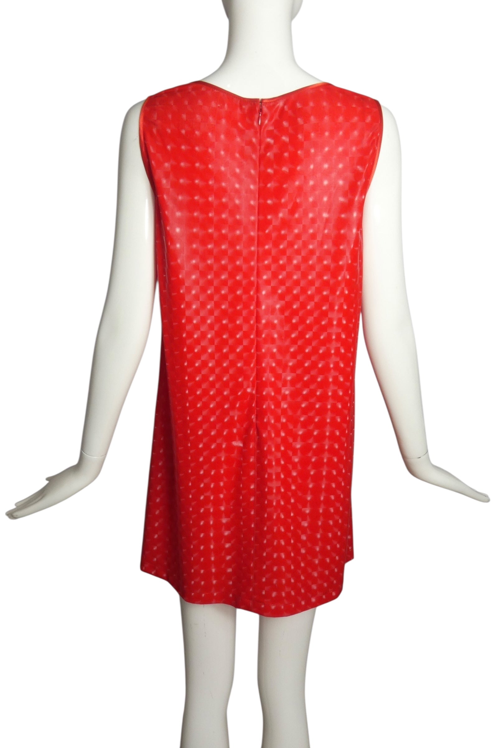 Description: Make a fearless statement in this avant-garde Pierre Cardin Haute Couture dress from Spring 2011. The striking red hologram-printed latex creates an iridescent, eye-catching surface that shifts with light and movement, while the clean shift silhouette keeps the focus on the fabric's mesmerizing finish. A bold black patent-edged cutout at the chest adds architectural intrigue and modern edge. This is futuristic fashion for the daring—a piece that captures Cardin's visionary approach to materials and design, perfect for those ready to command attention.