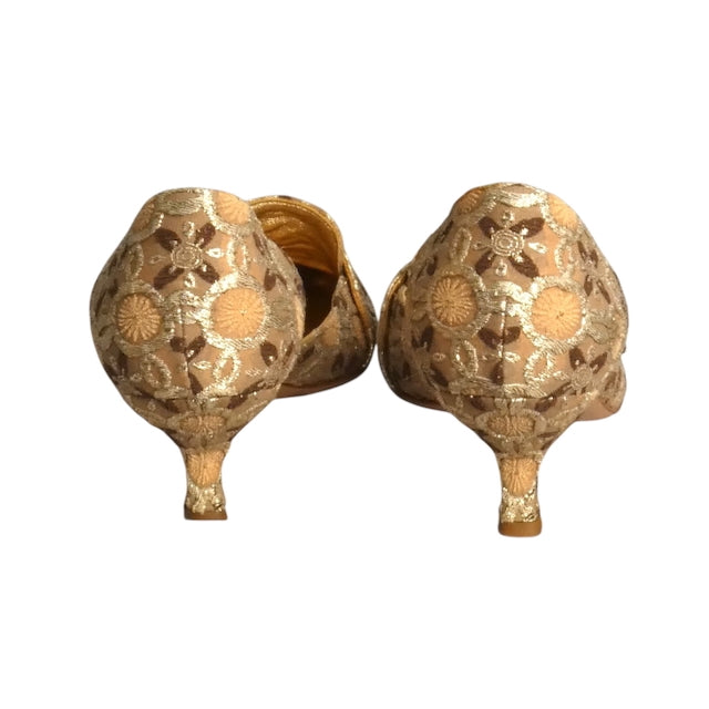 Description: Elevate your ensemble with these exquisite Prada brocade buckle kitten heel pumps. Featuring a metallic gold and brown brocade pattern artfully layered over nude mesh, they offer a refined yet striking look. The pointed toes and prominent buckles across the vamp add architectural elegance, while the modest kitten heel provides comfort without sacrificing style. Ideal for enhancing any outfit with a sophisticated touch, these pumps embody Prada’s signature blend of craftsmanship and contemporary design.