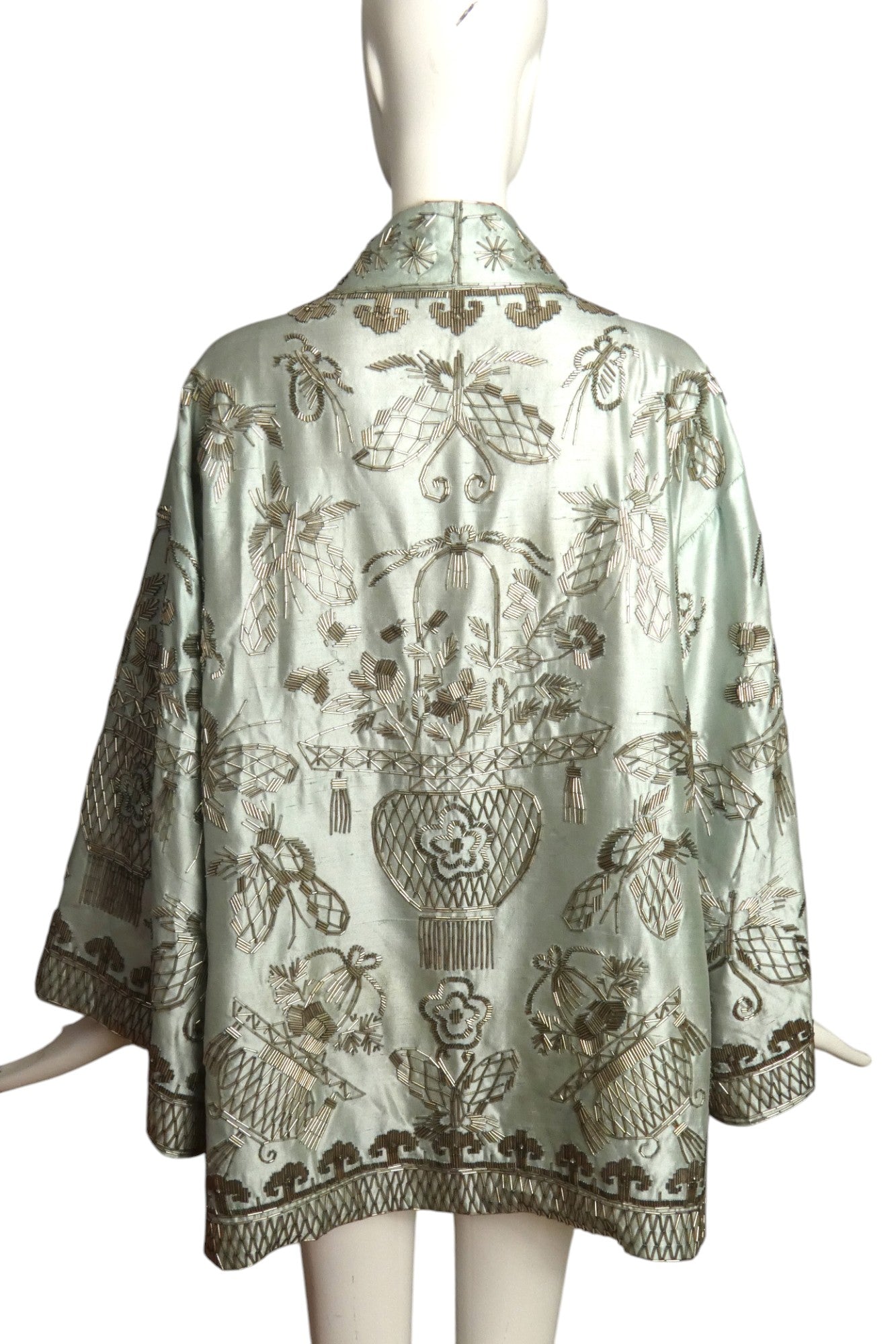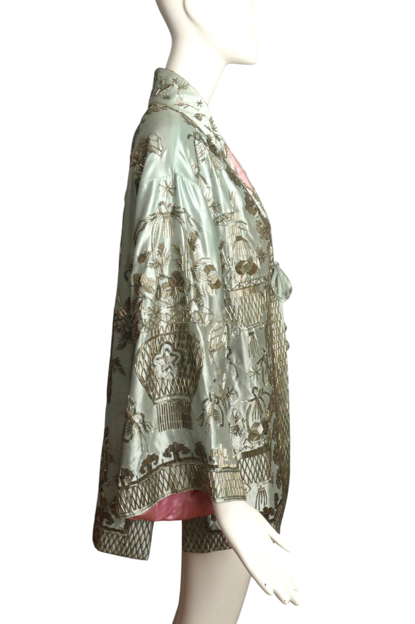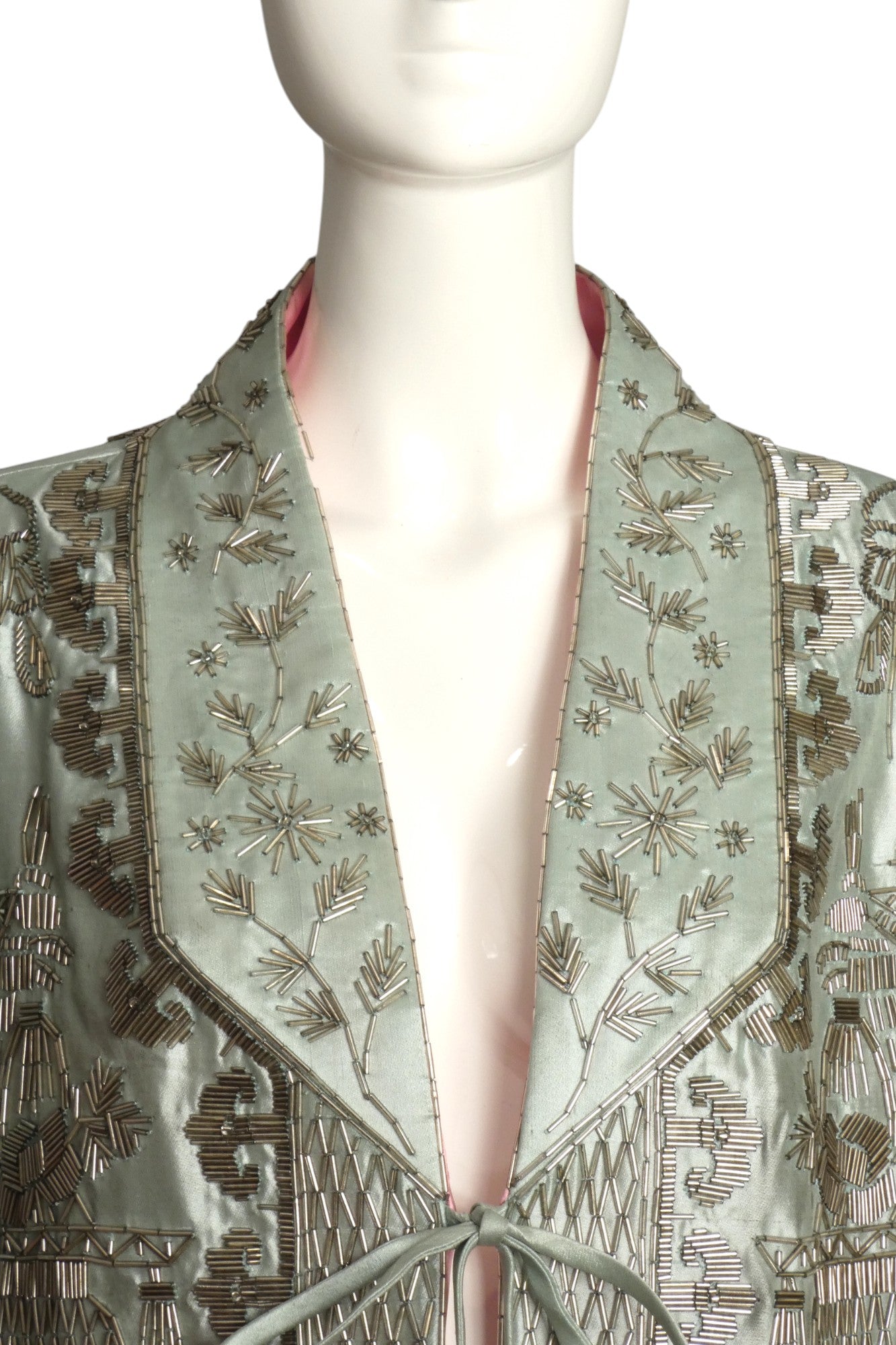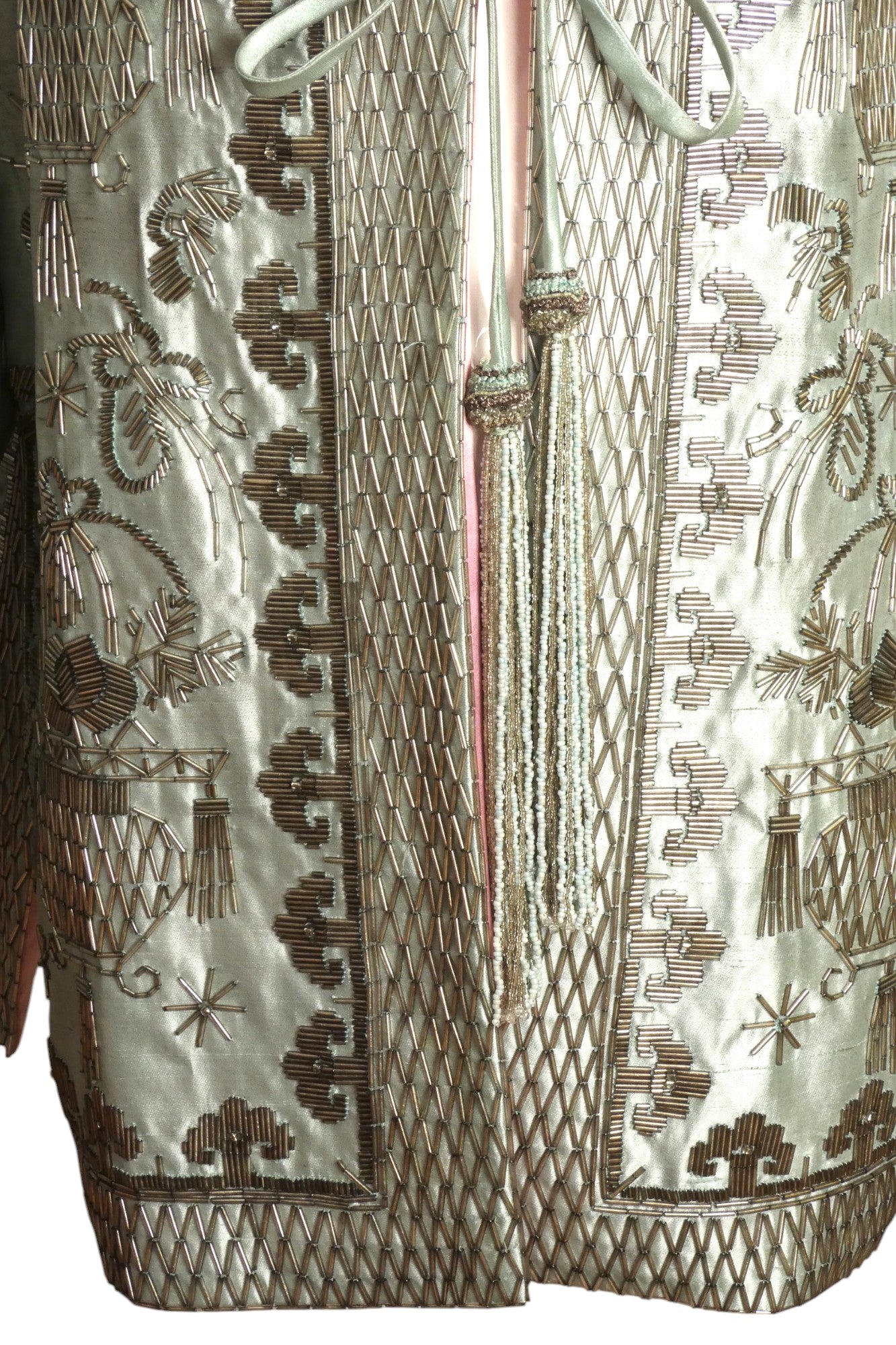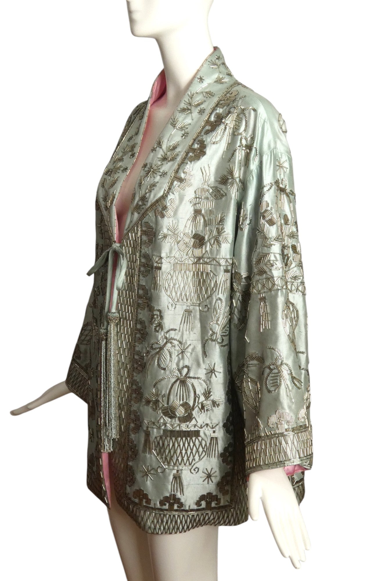 Description: Exquisite sea foam green silk shantung evening coat with captivating Asian-inspired design. This Reem Acra masterpiece dazzles with shimmering silver bugle beads throughout, creating an unforgettable silhouette. Features elegant cord tie closure adorned with luxurious beaded tassels. The strategic side slits enhance movement while revealing the stunning pink silk lining—a perfect statement piece that commands attention at any formal occasion.