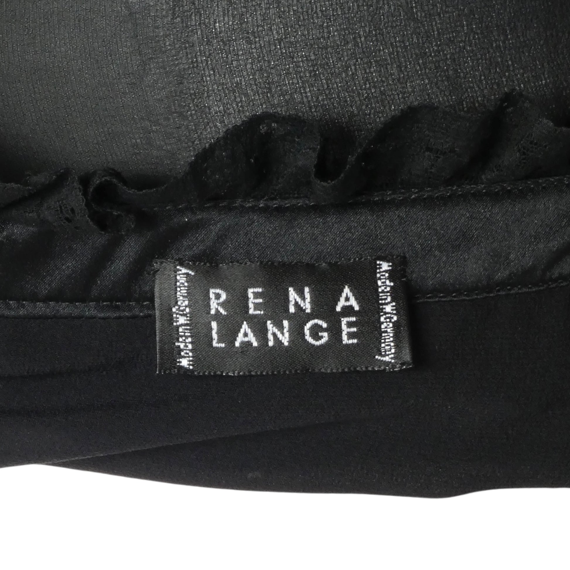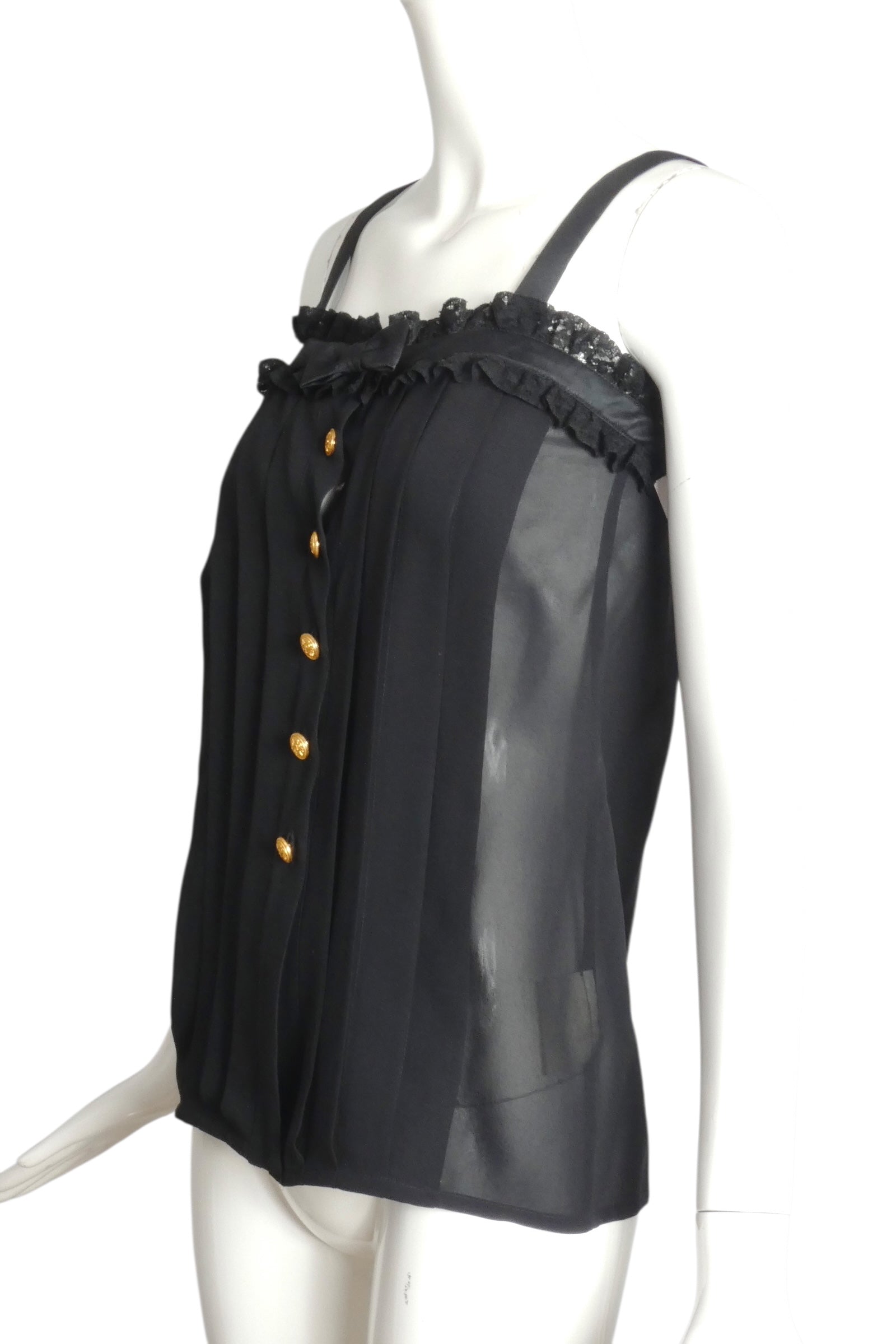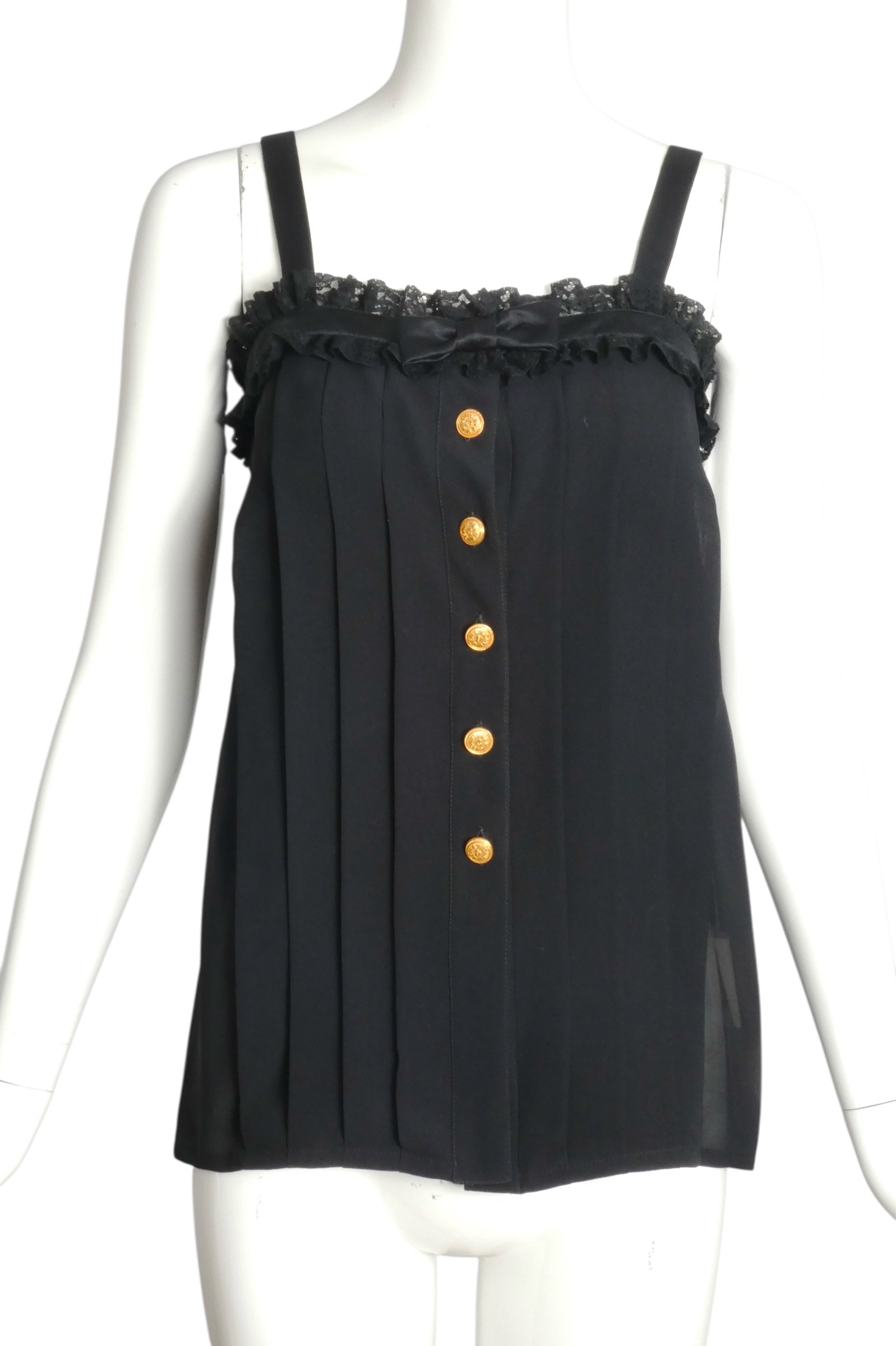 Description: An exceptional top from Rena Lange's Spring 1993 collection, this piece exemplifies the designer's refined approach to sophisticated eveningwear. Constructed in luxurious black silk georgette, the garment features refined black satin shoulder straps and signature gold-tone button closures that traverse the front placket, providing both functional security and distinctive design detail. The silhouette descends in gracefully engineered pleats from a coordinating satin ribbon band positioned at the neckline, which is elegantly finished with delicate black ruffle lace edging. A diminutive bow accent at the center front adds refined femininity to the composition. This distinguished piece demonstrates Lange's mastery of complex fabric manipulation and her commitment to meticulous construction techniques characteristic of haute couture design.