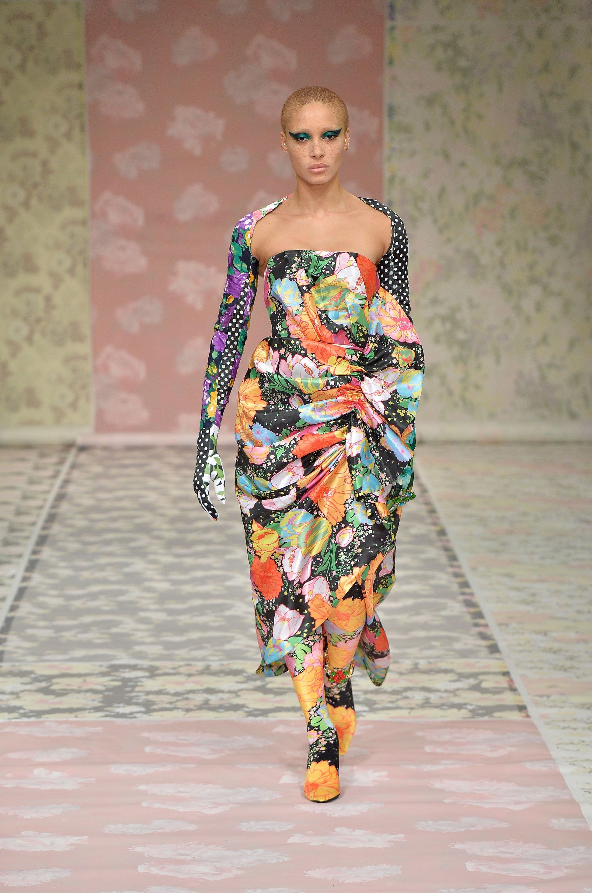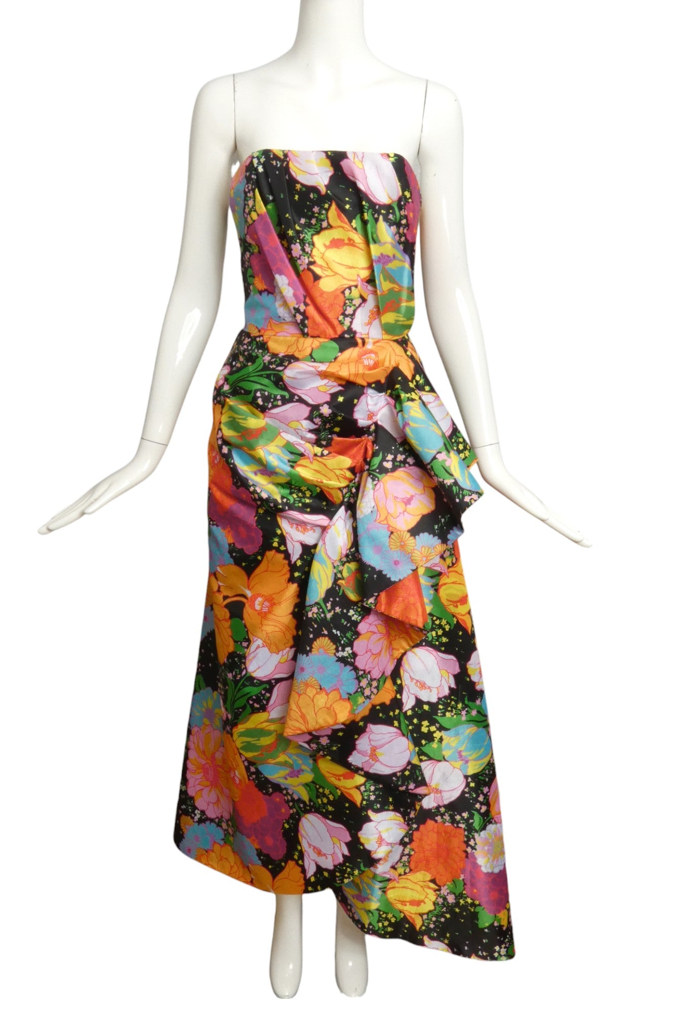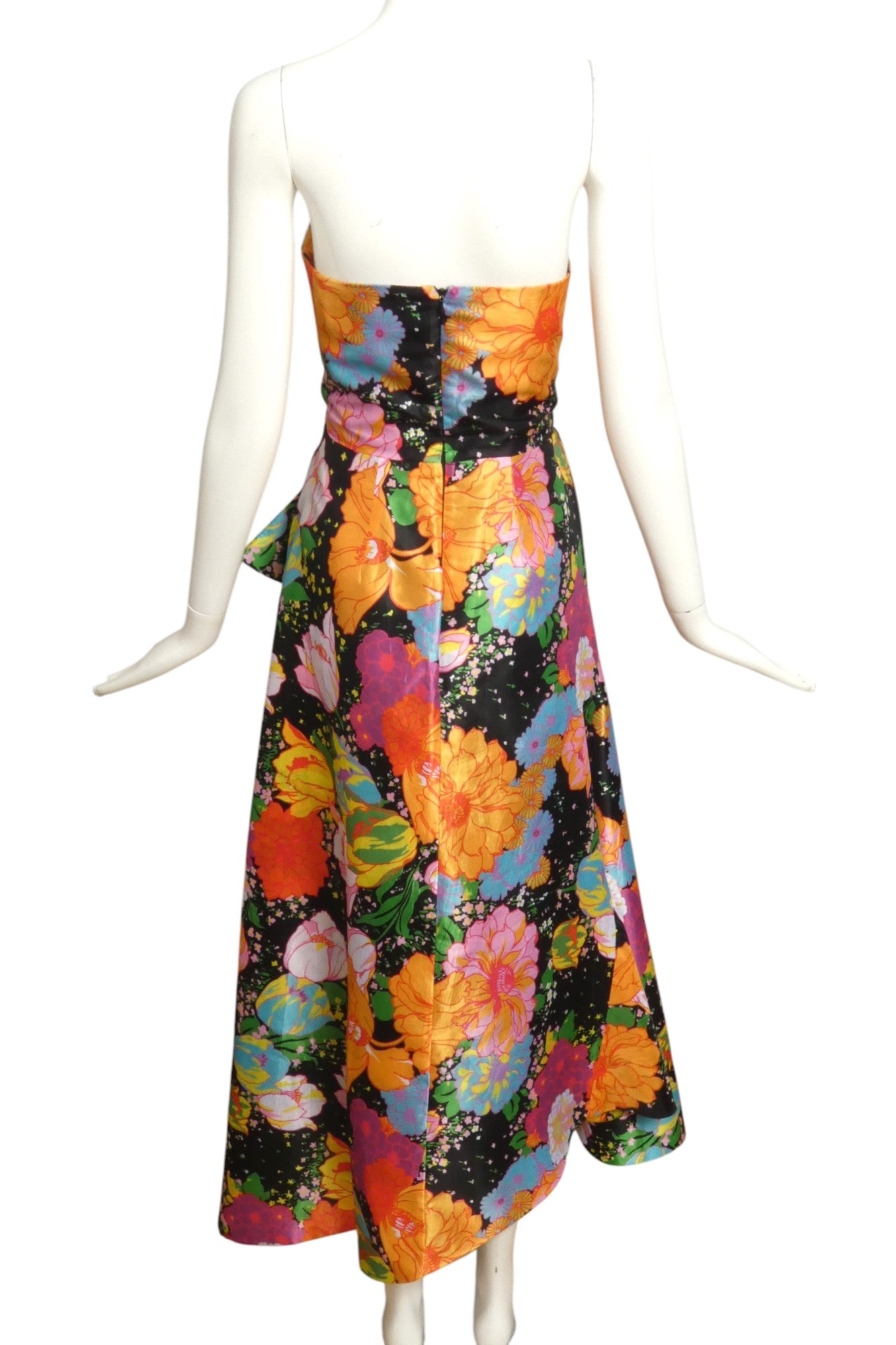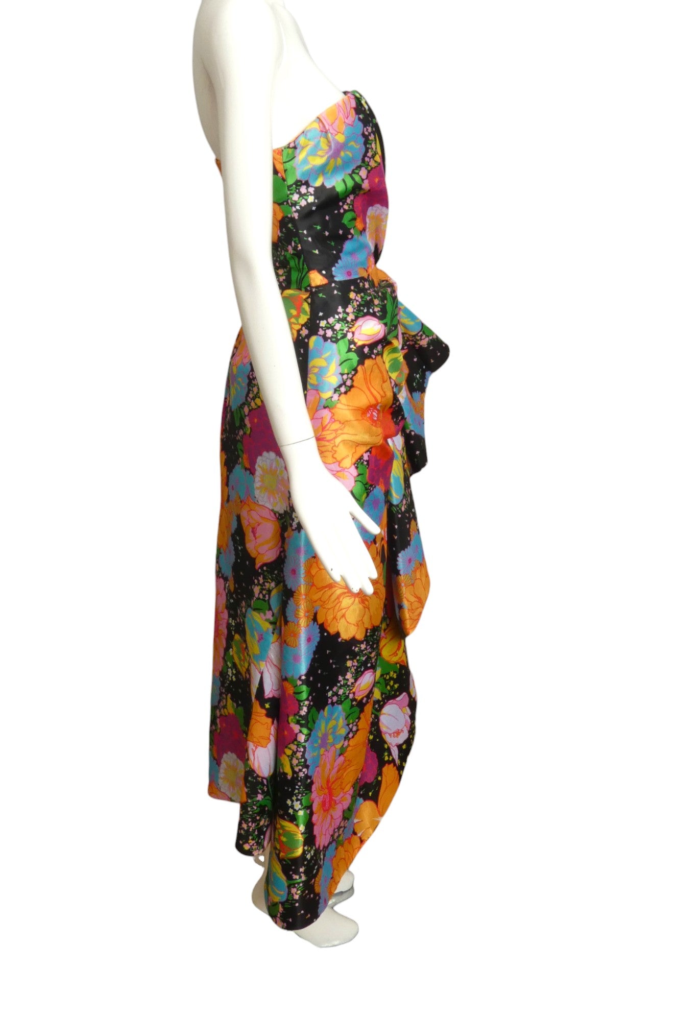 Description: Step into springtime glamour with the Richard Quinn Floral Satin Evening Dress from the 2018 collection. This stunning strapless dress features a structured bustier bodice that flatters your shape, while the lively floral print adds a playful pop. The wrap-front skirt with a flowing side drape creates a graceful, twirl-worthy silhouette. Perfect for making a stylish statement at any special event, this dress brings a burst of charm and elegance wherever you go!
