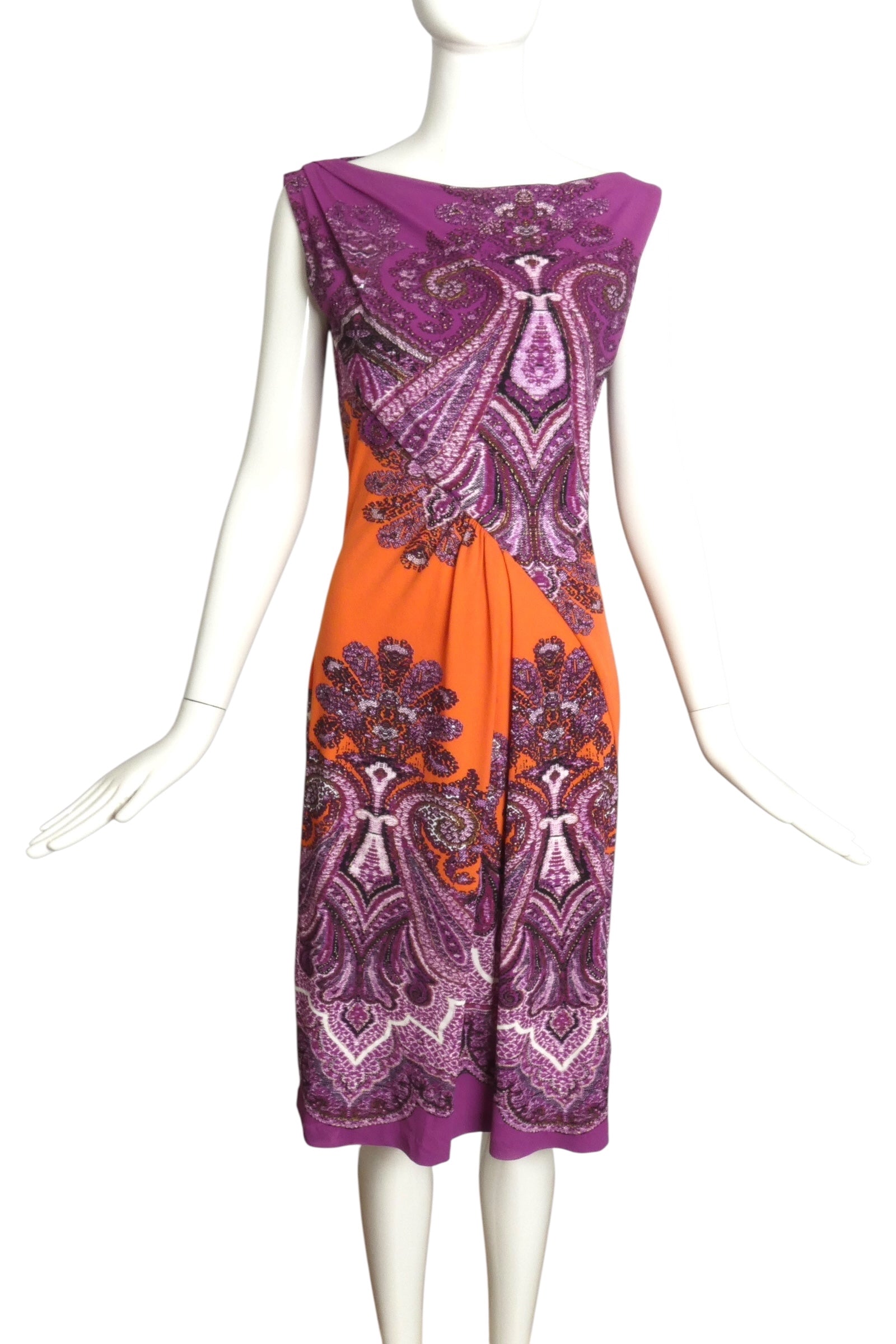 Description: This Roberto Cavalli jersey dress in vibrant purple and orange showcases a dramatic, glitter-painted pattern that catches the eye. Featuring a sophisticated draped neckline formed by pleats from the right shoulder, it elegantly balances boldness with refinement. A diagonal seam runs from the right underarm to the lower left leg, adding distinctive structure, while cascading gathers down the center front enhance its fluid silhouette.