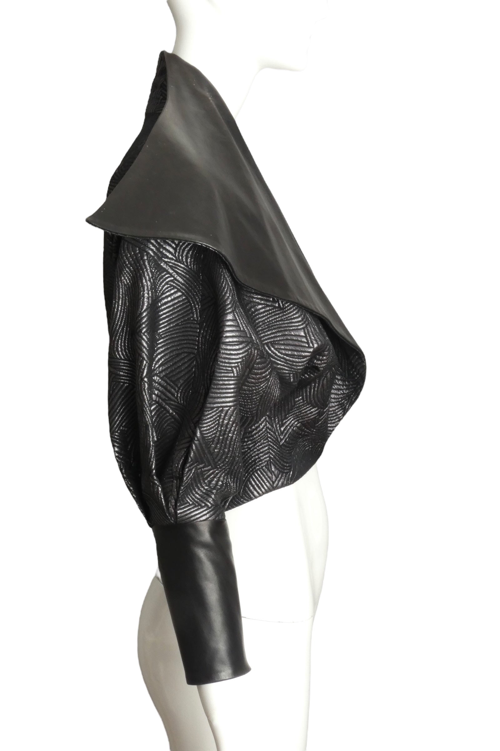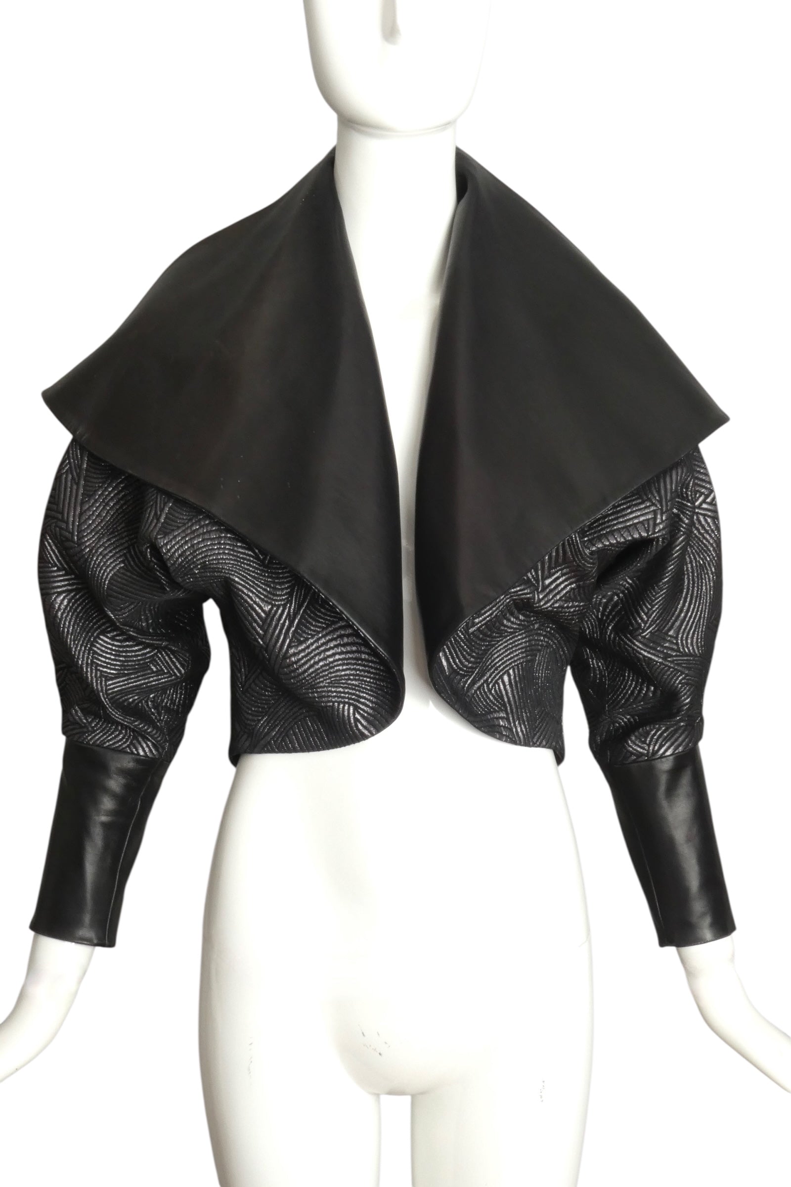 Description: This stunning bolero jacket by RUBIN SINGER features a luxurious metallic silver and black brocade fabric paired with wide black leather fold-back revers for a bold contrast. The sleeves are seamlessly integrated with the jacket, highlighted by tapered black leather lower sleeves that add sleek sophistication. Brand new with original tags and priced at $1445.