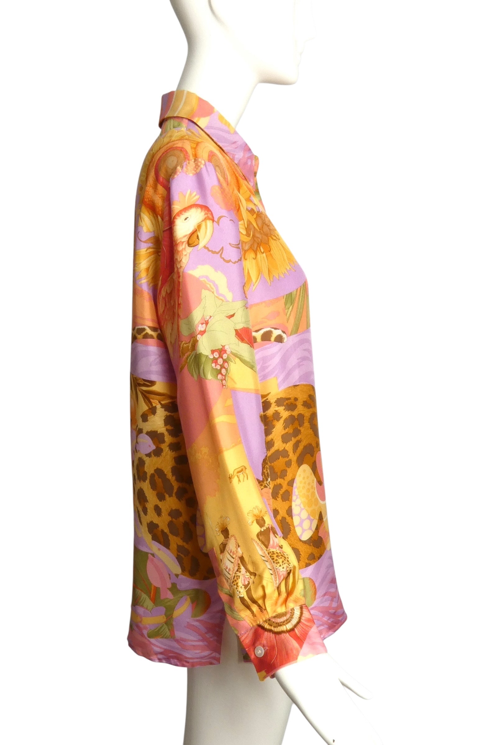 Description: This 1990s Salvatore Ferragamo blouse showcases luxurious silk twill crafted with an expert tropical print featuring vibrant flowers, parrots, hunters, and leopards. Designed with a refined small collar and a front button closure, it offers a polished silhouette. Long sleeves with buttoned cuffs add a tailored touch, making this size 8 blouse an elegant statement piece that blends artistry with timeless sophistication.