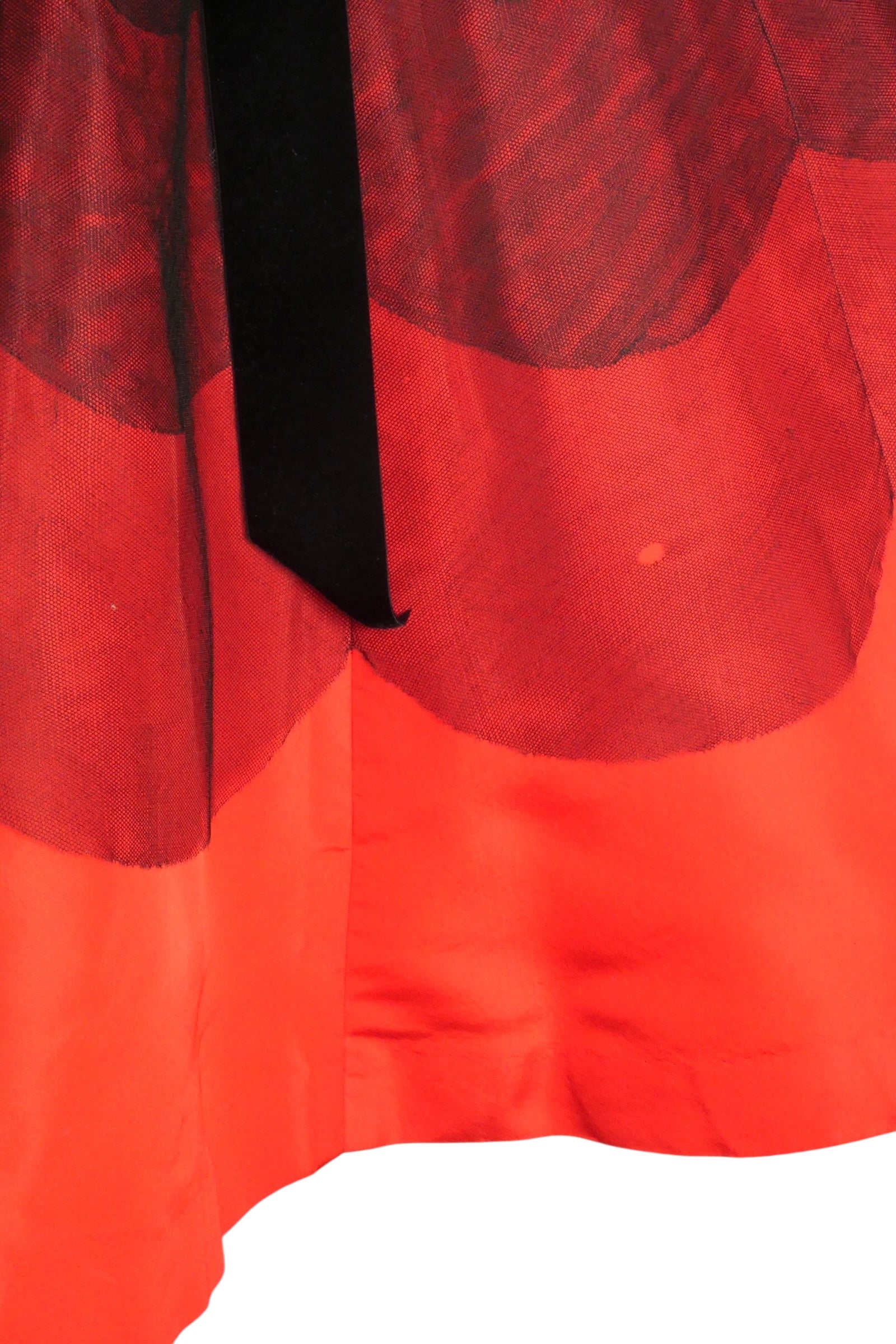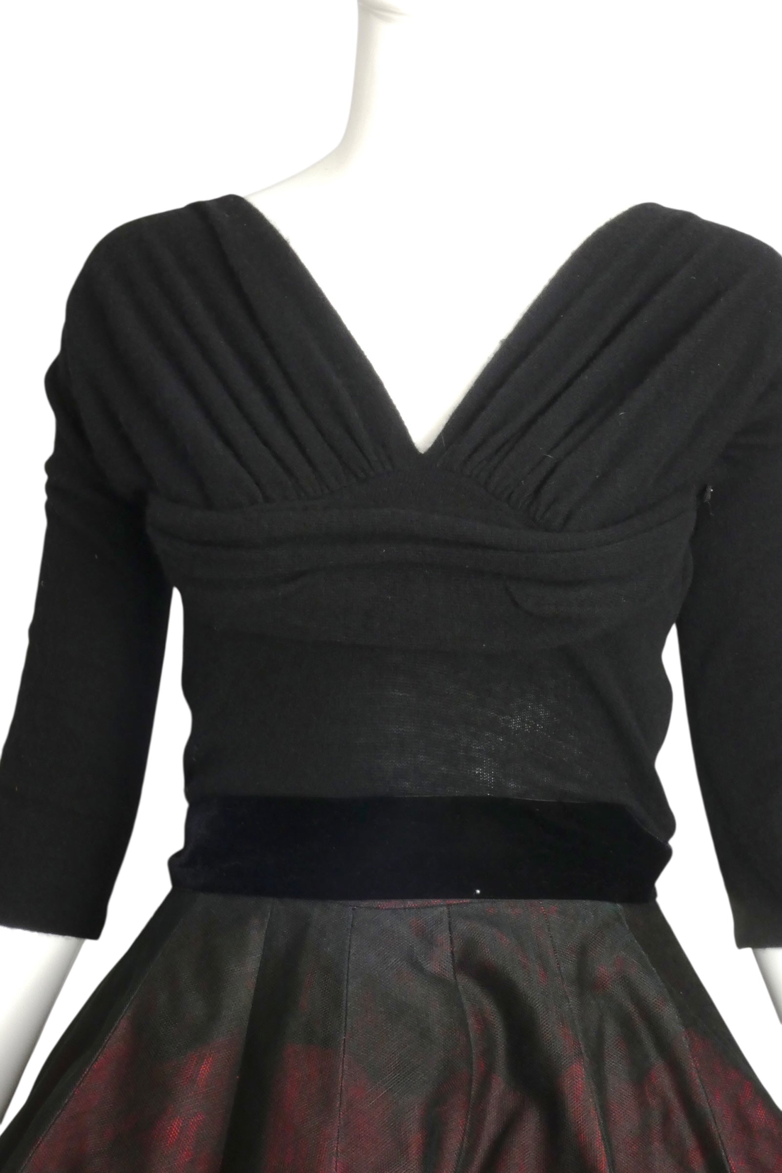 Description: Charming 1955 two-piece set featuring a black wool knit sweater paired with a red taffeta skirt. The dress boasts a deep v-neckline with an empire waist and a graceful drape below the bust. It zips up at the side for easy wear. Layers of black scalloped tulle tier over the vibrant red skirt, finished with a black velvet ribbon that ties at the waist for a fun, flirty touch. Size 2 and full of vintage flair!