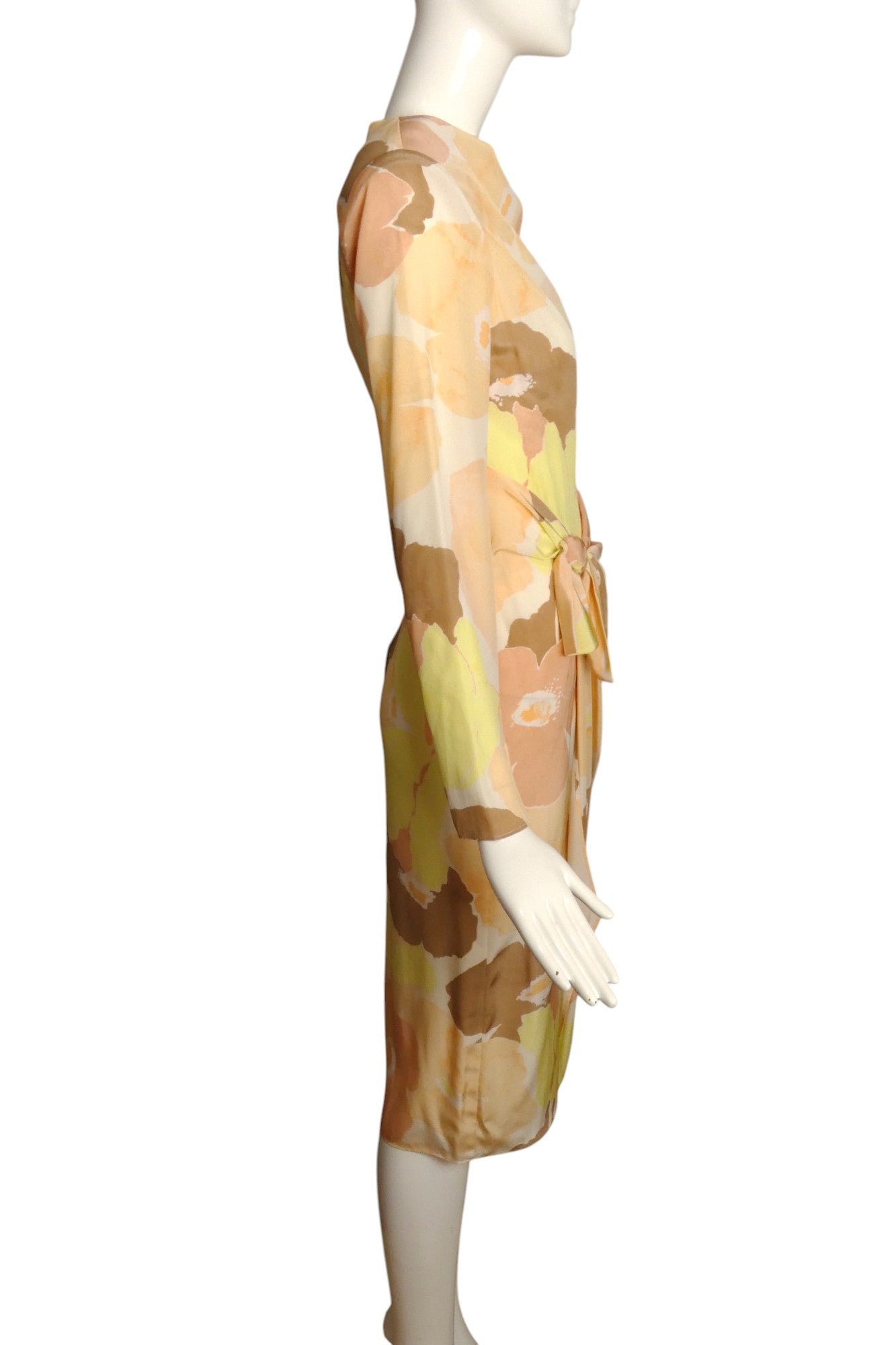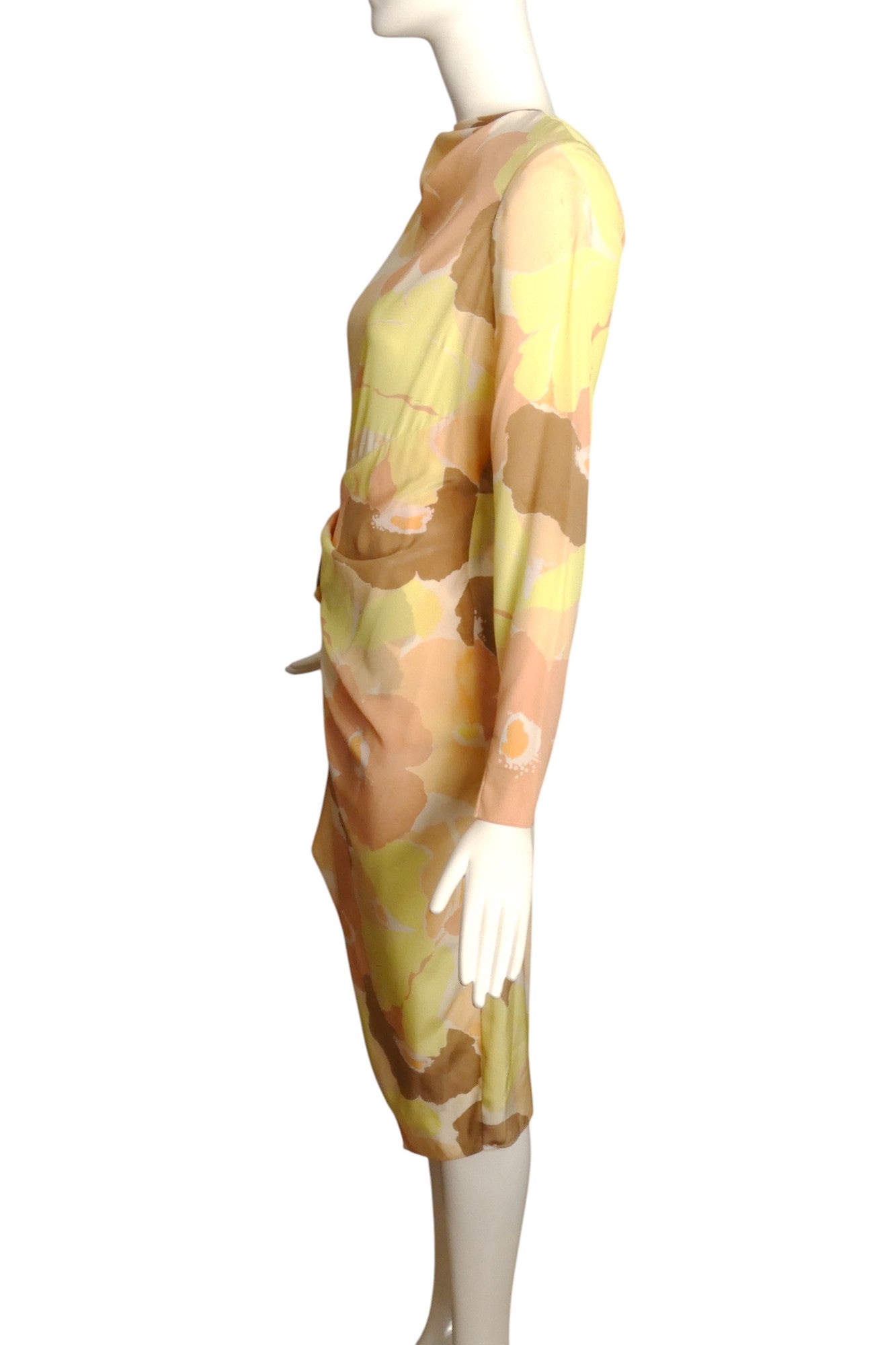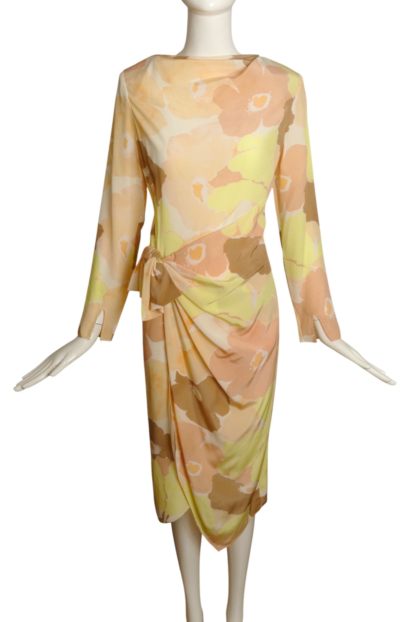 Description: Exquisite silk dress showcasing a bold floral design. Features an elegant sarong silhouette with a sophisticated faux knot detail at the right hip. The luxurious draping at the neckline and precision diagonal bust darts create a flattering fit. This pristine ST JOHN piece still bears its original store tags, making it a must-have addition to your designer collection.