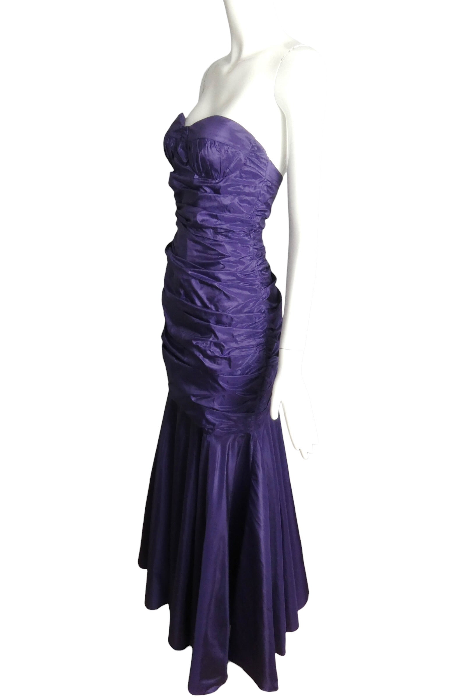 Description: An elegant evening dress from Michael Kors Fall 2005, crafted in rich purple silk taffeta with a lustrous, structured finish. The strapless bodice features a softly sculpted sweetheart neckline with subtle gathering, creating shape and dimension through the bust and torso. The silhouette is fitted through the waist and hips with delicate ruching that enhances the figure, before flaring into a fluid, mermaid-style skirt. The crisp taffeta holds its shape beautifully, giving volume and movement to the hem while maintaining a refined, tailored look.