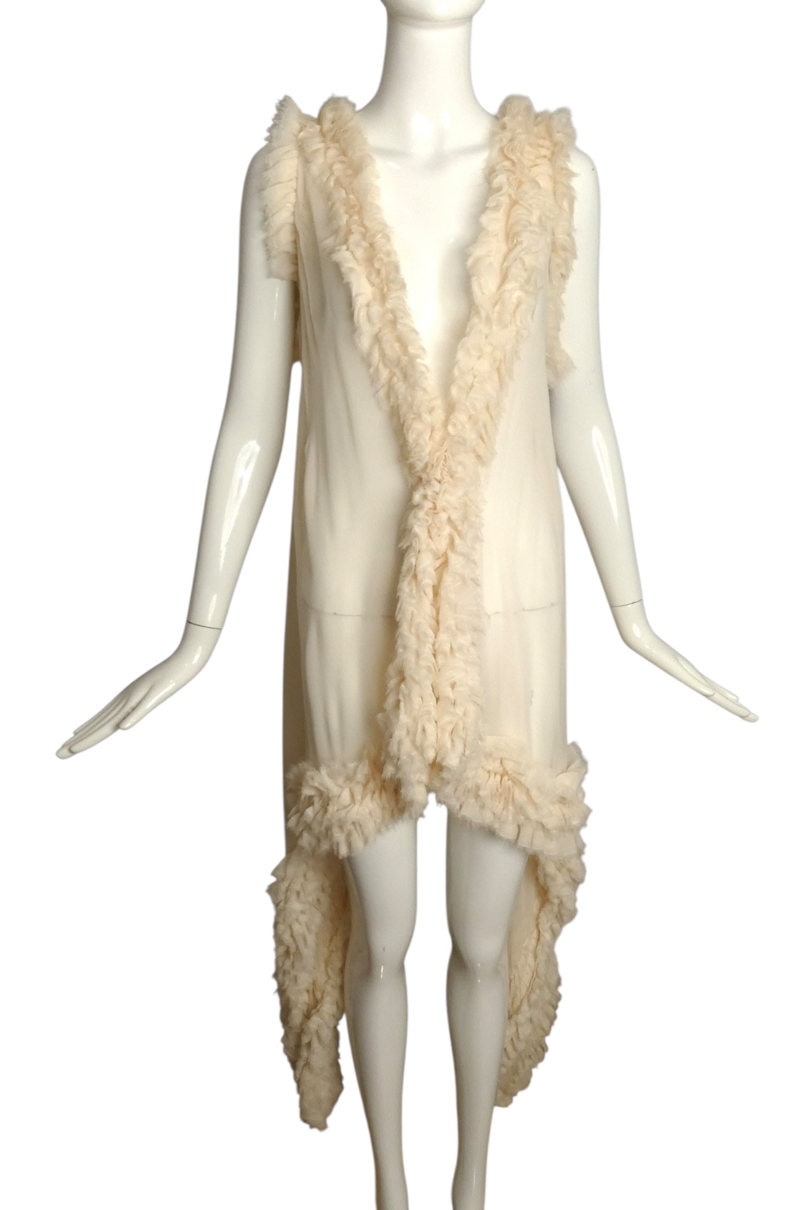 Description: This stunning ivory silk chiffon vest from Thomas Wylde is a dreamy statement piece that floats with every breeze. Featuring delicate raw-edge chiffon ruffles and long cascading tails, it’s designed to captivate. Slides at the side seams let you belt it in the front for a flattering fit while letting the back flow freely. Brand new with tags and a $1785 price, this vest adds whimsical elegance to any evening look. Perfect for twirling through unforgettable nights in style!