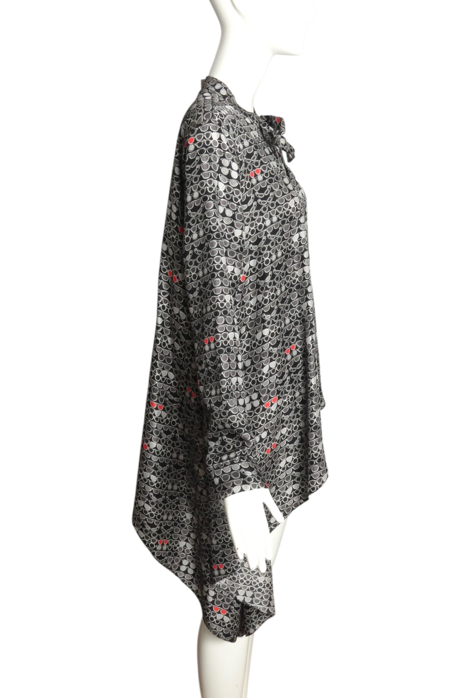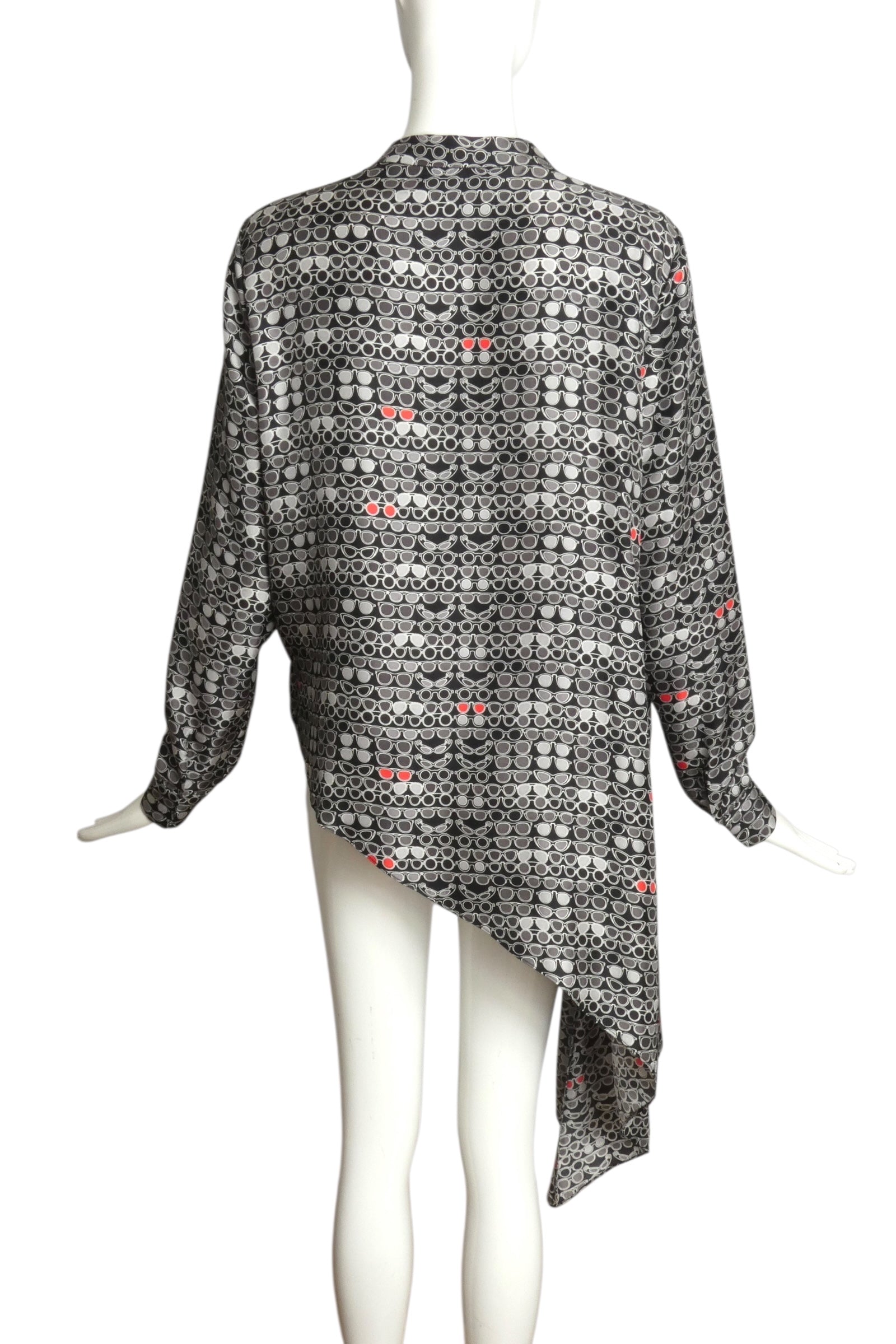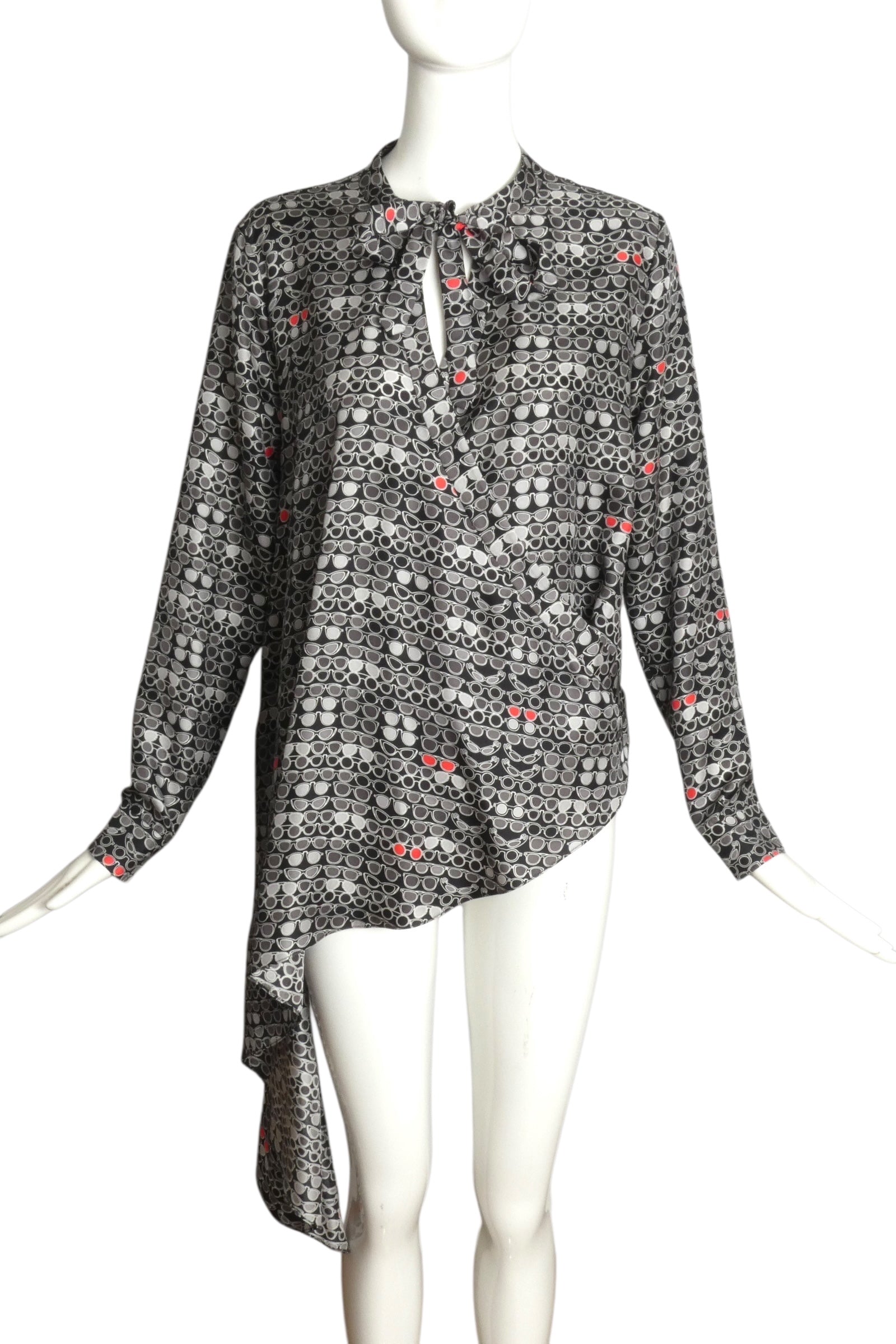 Description: Elevate your style with this playful Thomas Wylde silk blouse featuring a quirky sunglass print in shades of grey with pops of red. The wrap front snaps to the side, creating a dramatic drape down the right side, while the scarf tie at the neck adds a chic finishing touch. Brand new with tags and originally priced at $550, this size Medium piece brings effortless fun and sophistication to your wardrobe.
