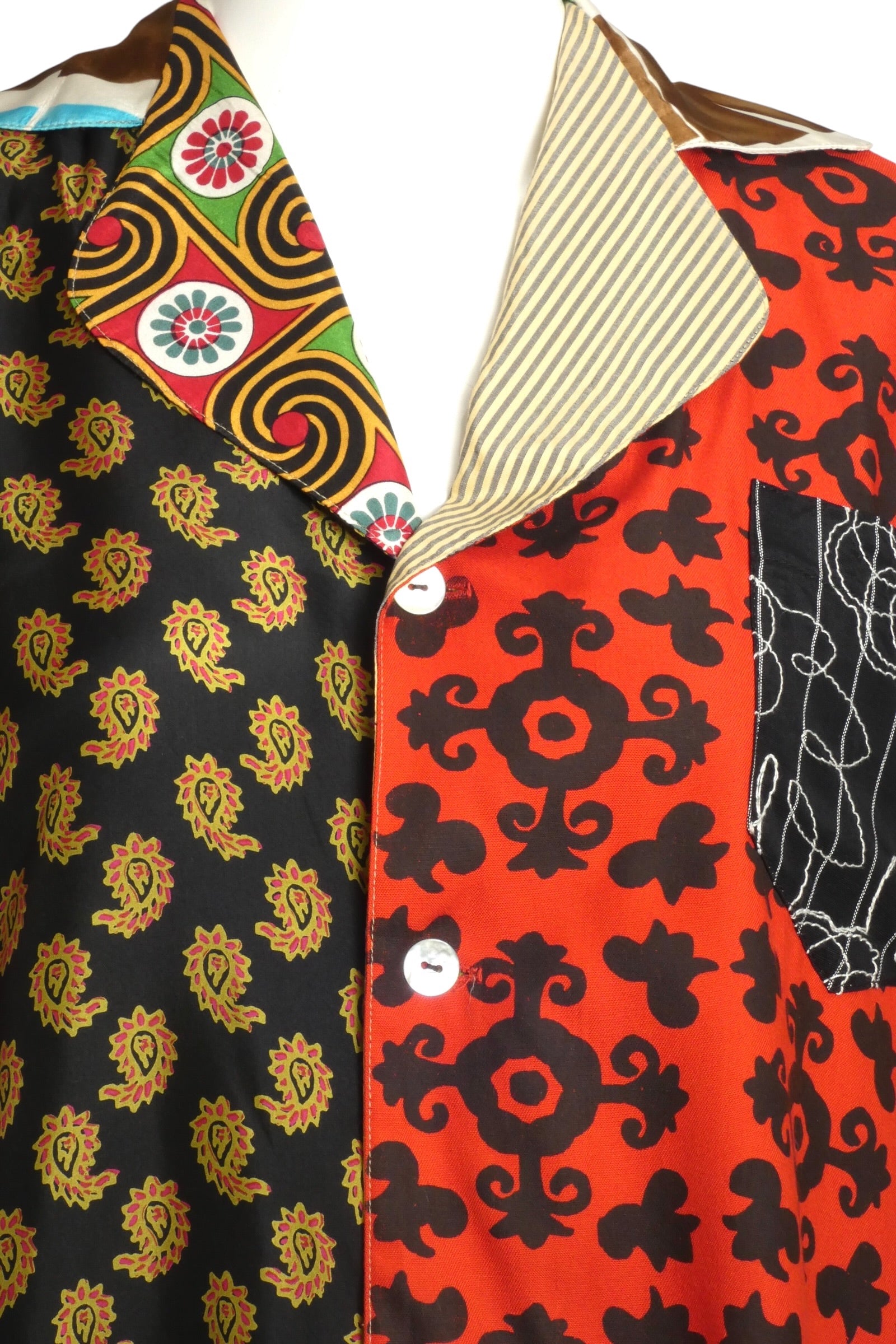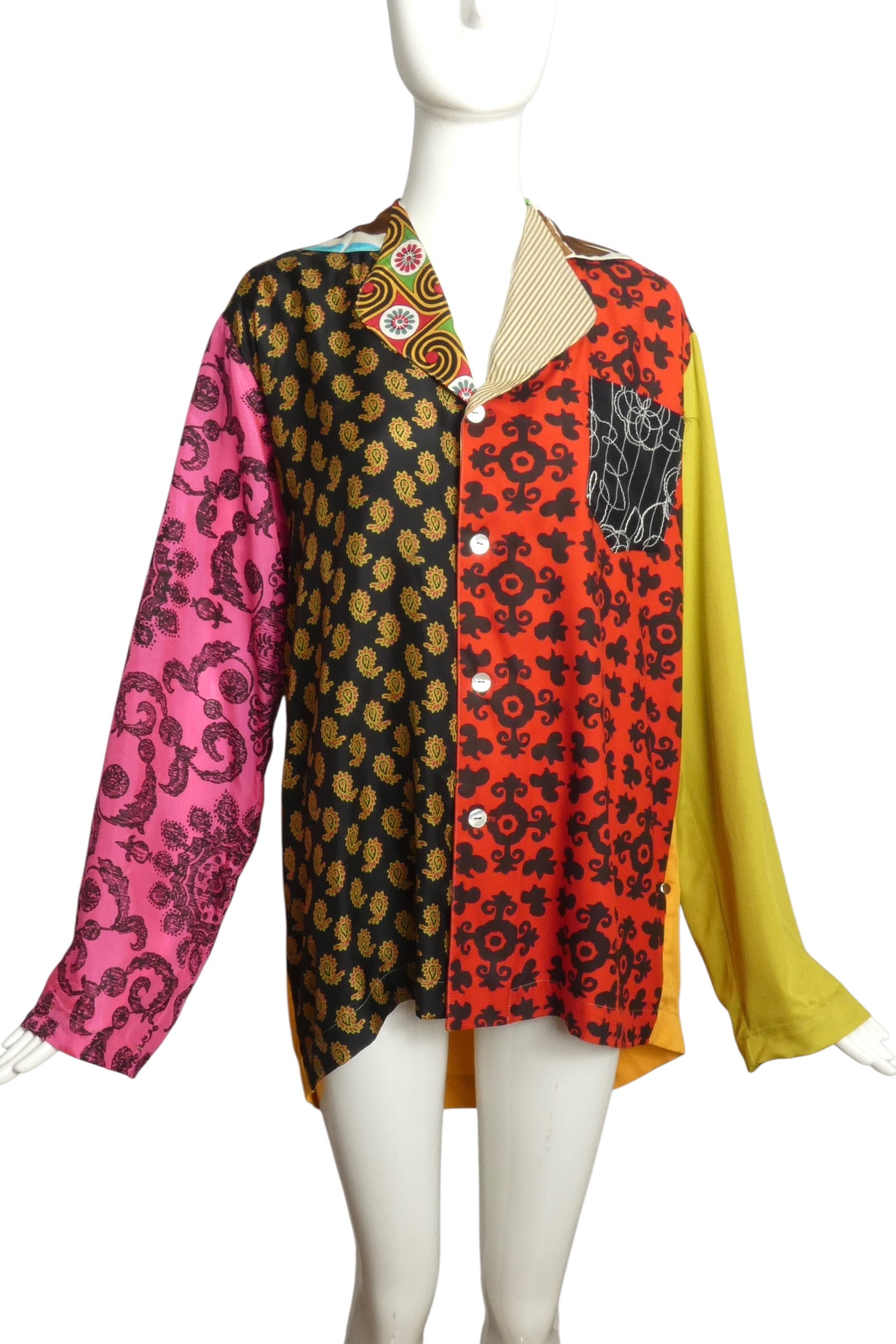 Description: A quintessential Todd Oldham creation from the 1990s, this patchwork blouse showcases the visionary designer's bold approach to textile composition. Constructed from mixed-print rayon panels featuring interlocking geometric and botanical motifs, the piece demonstrates Oldham's mastery of chromatic layering and pattern juxtaposition. Anchored by a notched collar, extended sleeves, and front button placket, the structured silhouette provides sophisticated counterpoint to the exuberant surface design. Representative of Dallas's most daring design moment, this blouse remains essential for vintage enthusiasts and those drawn to conceptual, artistically-driven fashion statements.