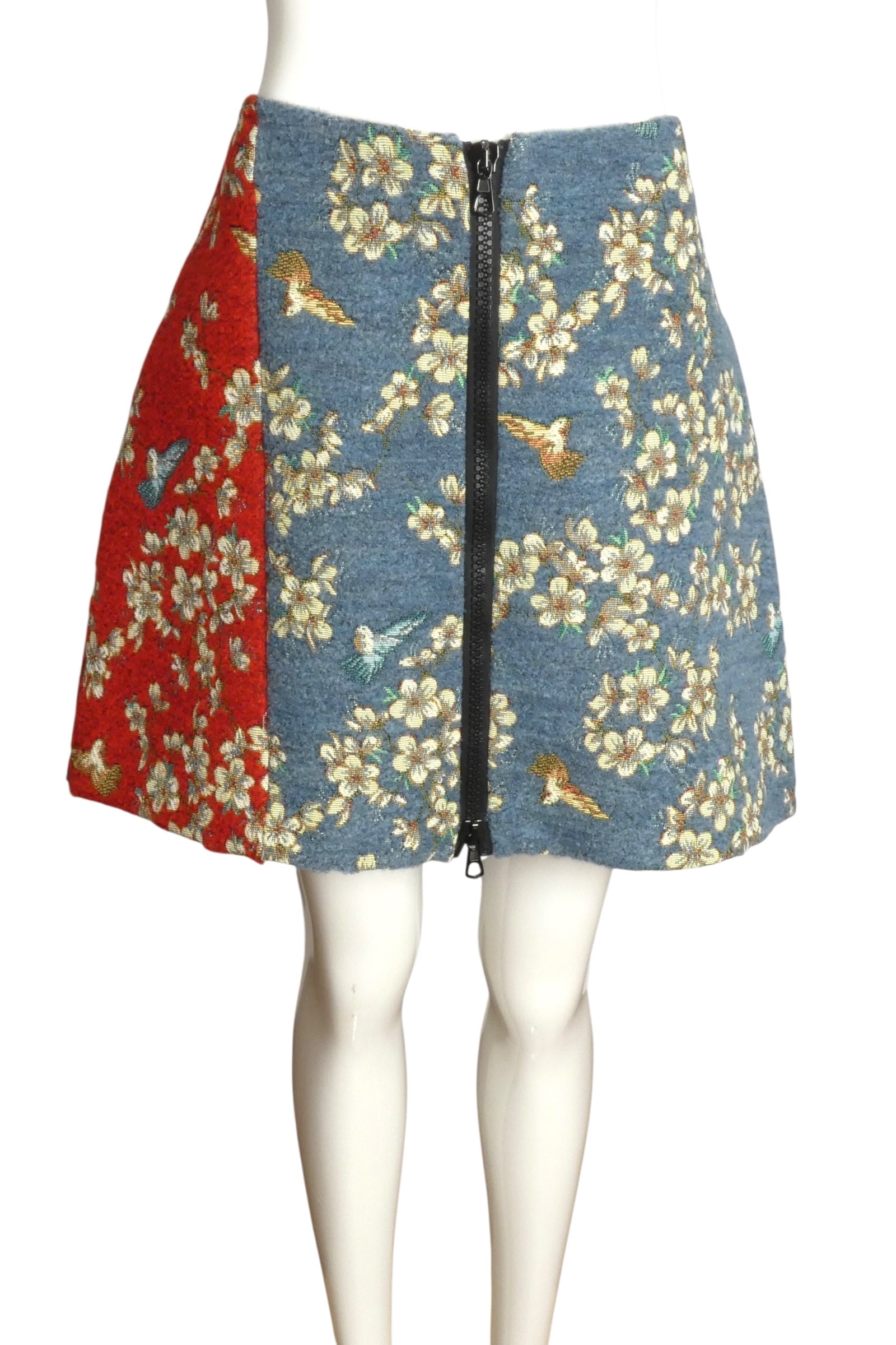 Description: Brighten your wardrobe with this playful color block tapestry skirt from the Fall 2018 collection, showcasing a delightful dogwood floral and bird design. The A-line silhouette is dart-fitted to the waist for a flattering fit without a waistband, while a bold black zipper runs down the front for a modern edge. Brand new with tags, this ULTRACHIC skirt is a fun mix of classic charm and contemporary style.