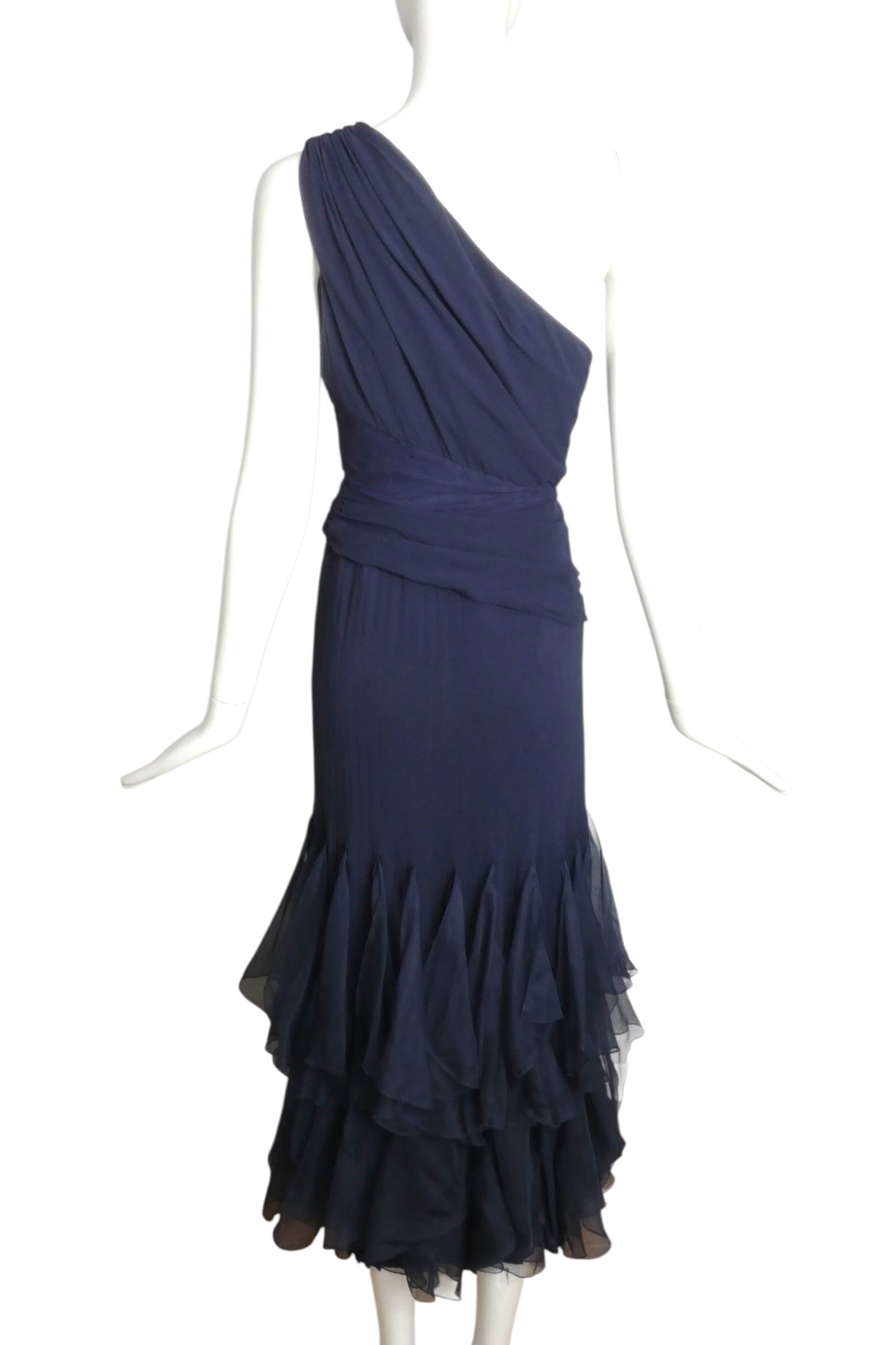 Description: A breathtaking Valentino creation from the Spring/Summer 1995 runway collection in luxurious navy silk chiffon. The ethereal one-shoulder bodice features graceful gathers cascading from the left shoulder, while a strategically placed midriff cutout—faced for modesty and removable for runway authenticity—adds architectural intrigue. The slender skirt showcases rows of bias-cut handkerchief ruffles that create fluid movement with every step. A complementary long-sleeve nylon tulle bodysuit accompanies the dress, offering styling versatility. A museum-quality piece exemplifying Valentino's mastery of romantic draping and innovative construction.