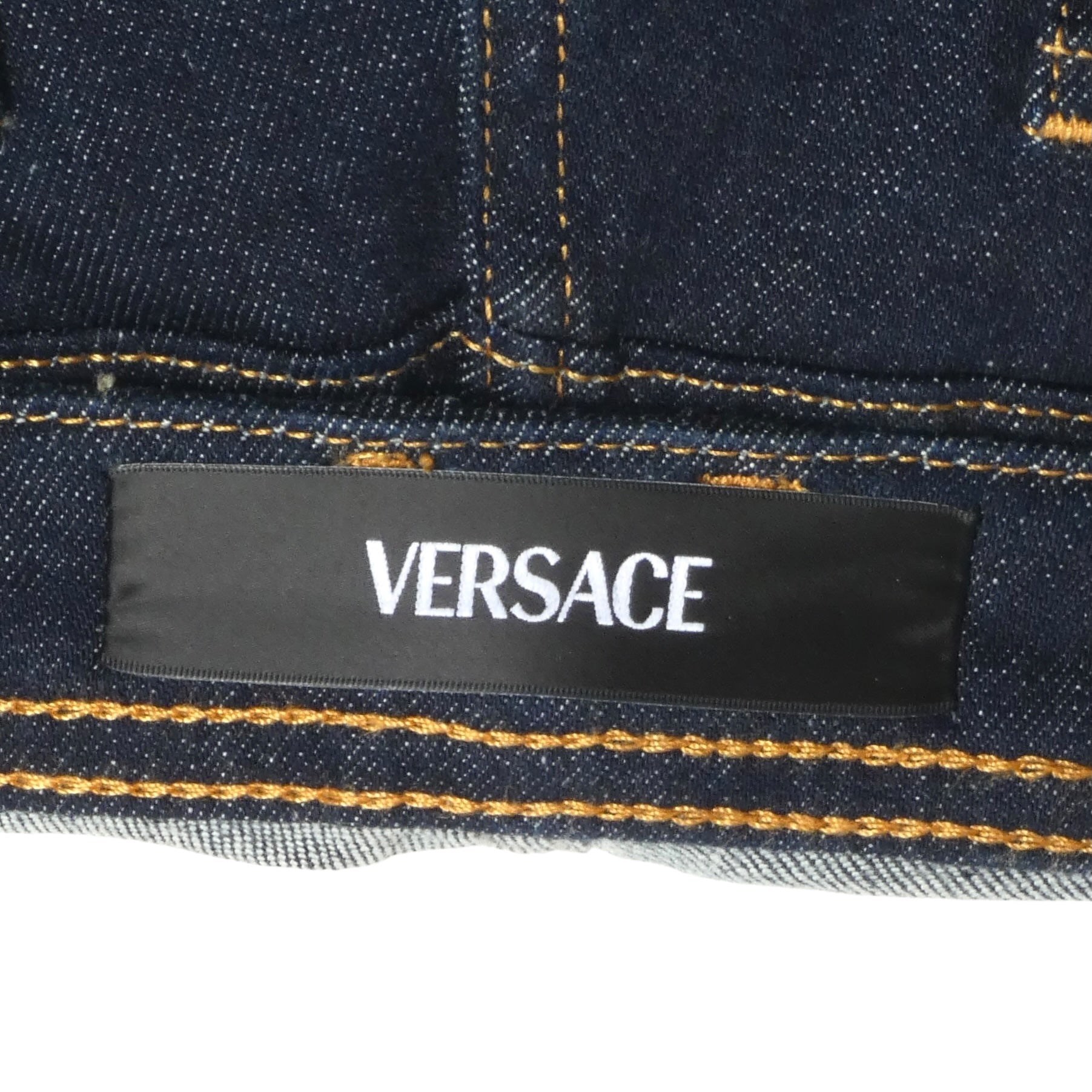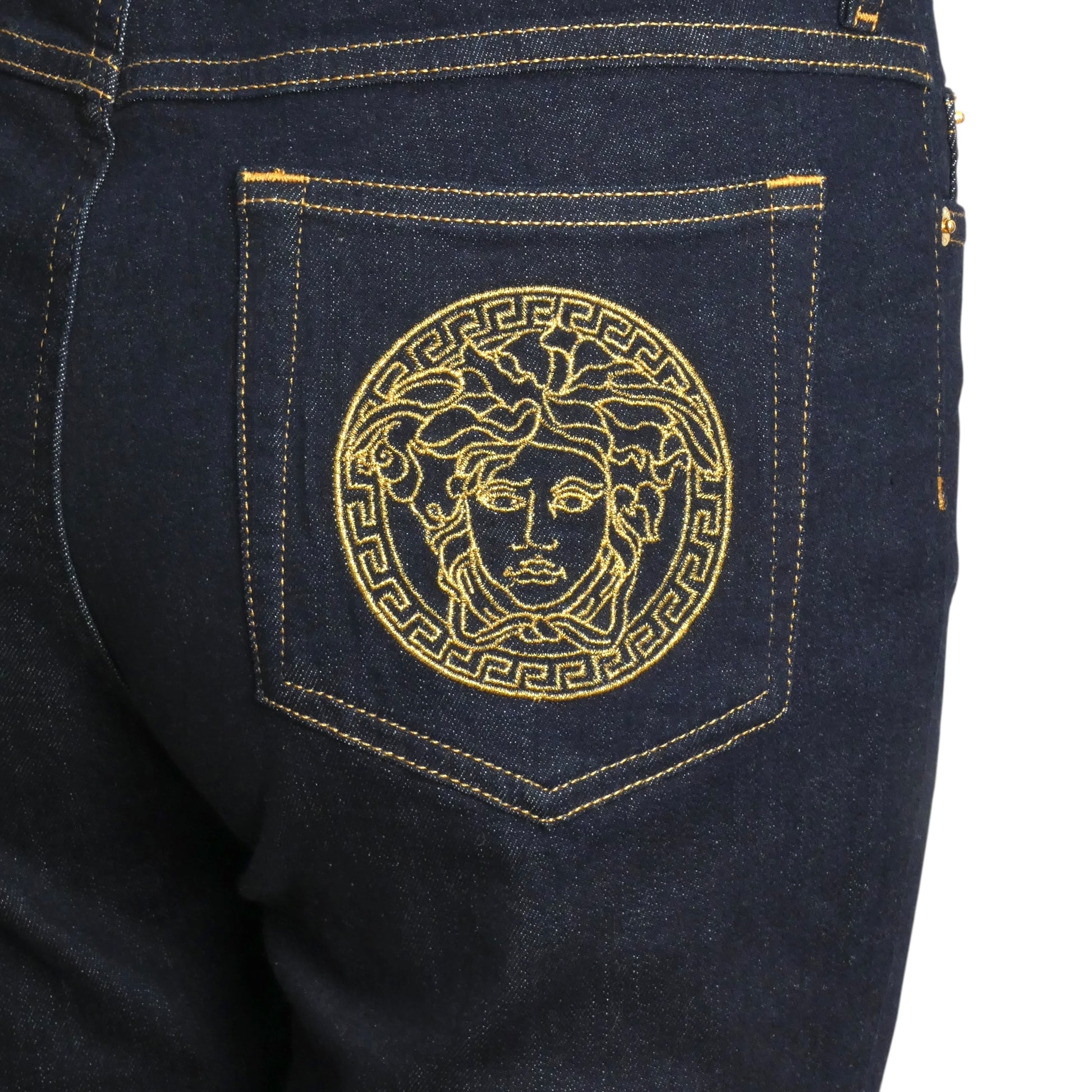 Description: Experience luxury with these VERSACE NWT Denim Skinny Leg Jeans in size 8. Crafted from dark denim, they feature distinctive gold topstitching and a signature gold Medusa head button at the waist for a refined touch. The back pocket showcases a striking gold metallic embroidered Medusa head, highlighting the brand’s iconic design flair. These jeans come with the original store tags, ensuring authenticity and pristine condition. Perfect for those who appreciate sophisticated style with a bold statement.
