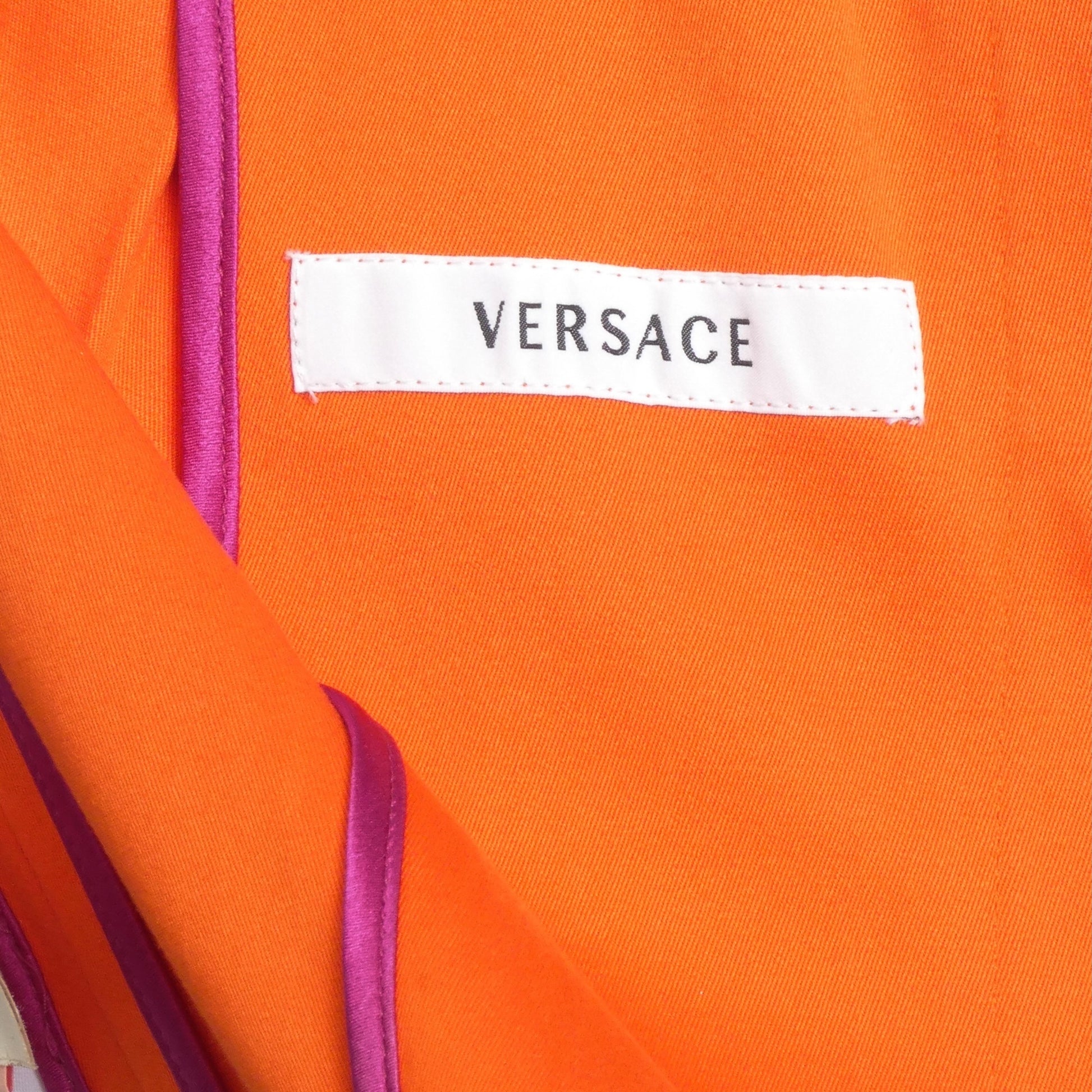 Description: This vibrant orange twill cotton jacket from Versace adds a playful twist to your wardrobe. Featuring a chic Mandarin collar and dramatic pleats cascading from the shoulders, it combines style and flair. The unique armor-like sleeves can be scrunched and buttoned for versatility, while the cutaway front and large patch pockets bring both function and attitude. Perfect for making a bold statement with ease.