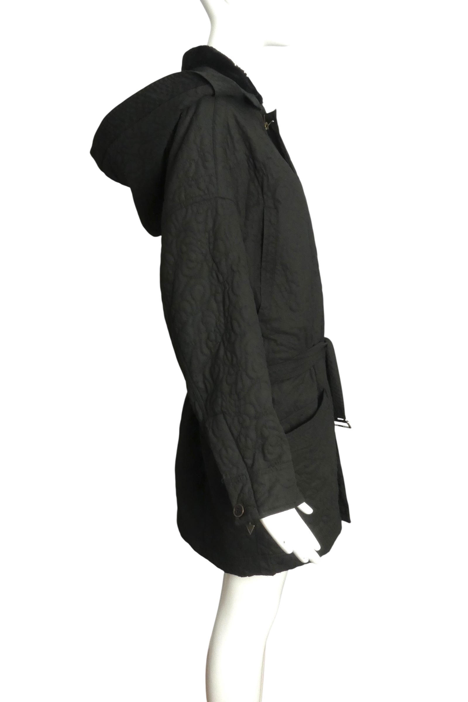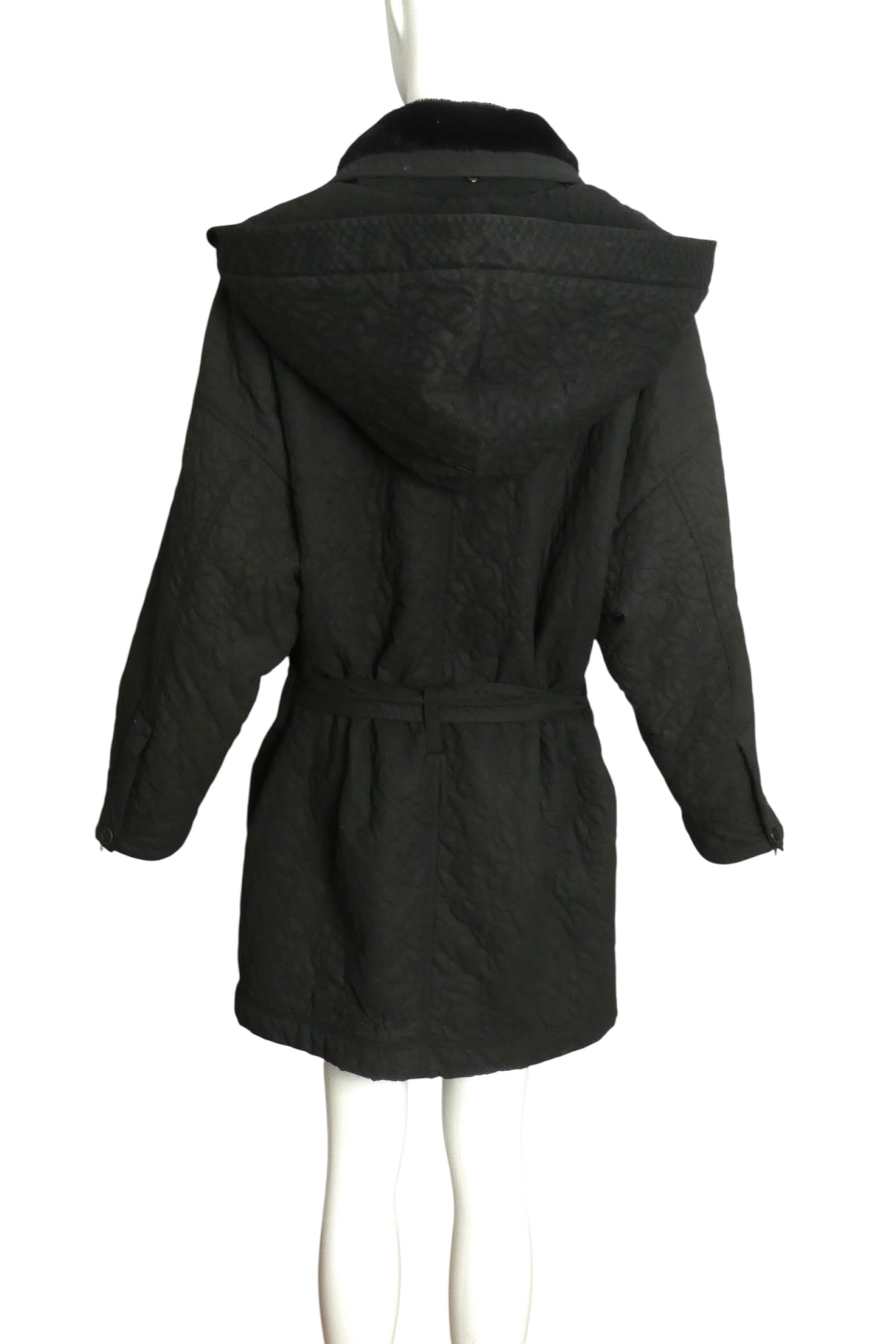 Description: SEmbrace playful elegance with this stunning 1990s VERSUS VERSACE black quilted coat. Designed oversized for comfort, it boasts a plush faux fur collar and a smooth hidden zipper for easy wear. A detachable hood adds extra versatility. Spacious inset pockets are perfect for keeping hands warm or storing essentials, and the matching belt with a slide buckle cinches the waist to create a chic silhouette. Ideal for making a statement while staying cozy on cool days!