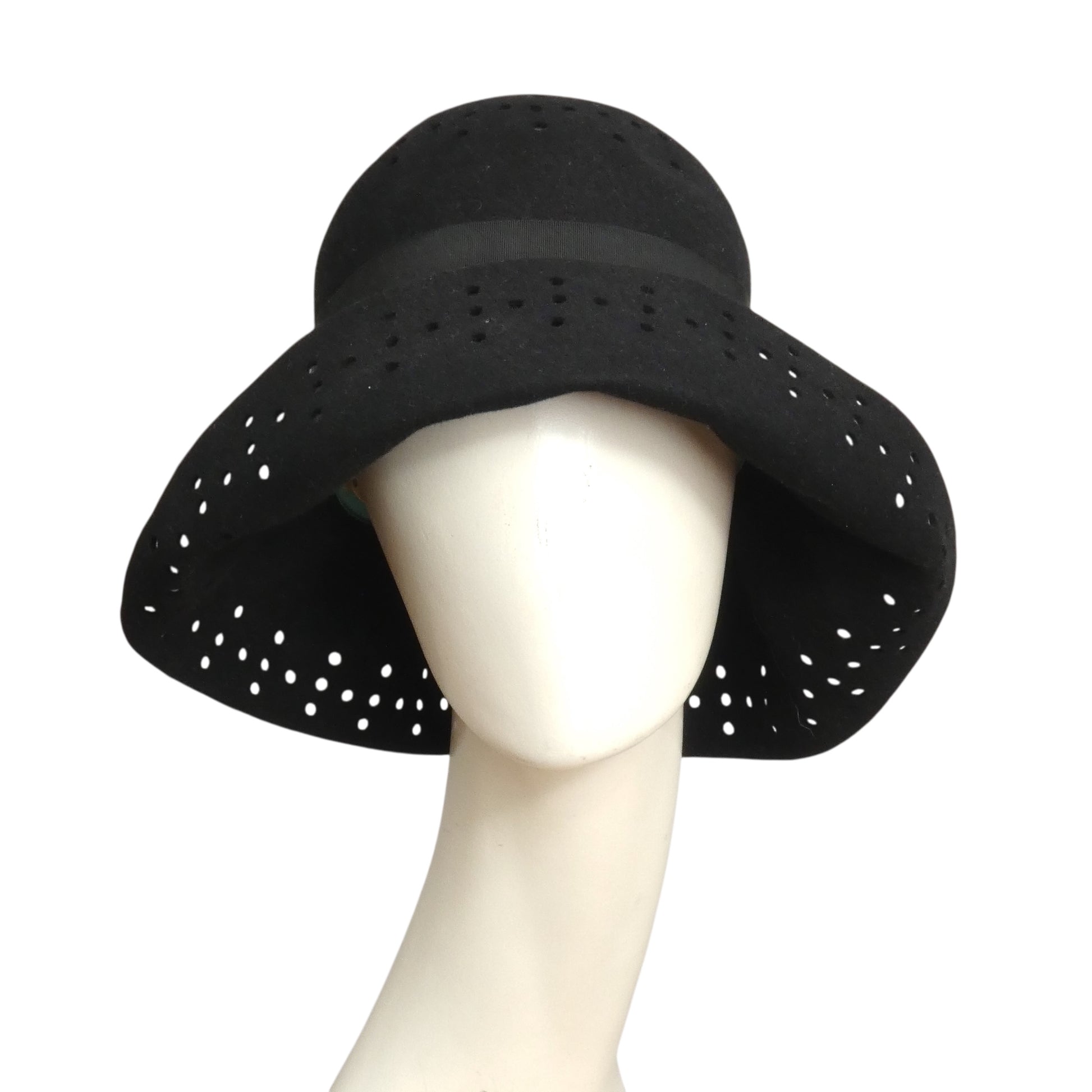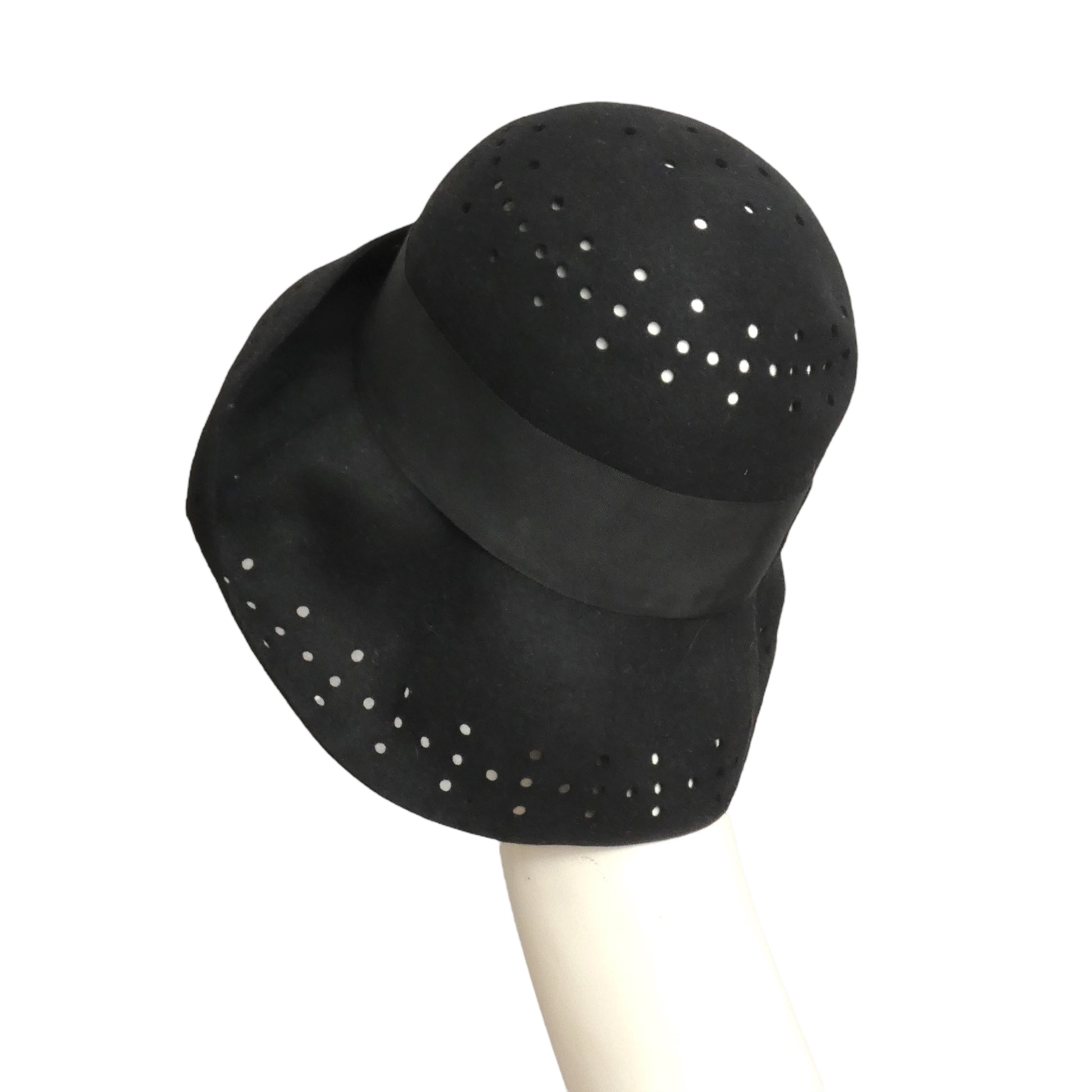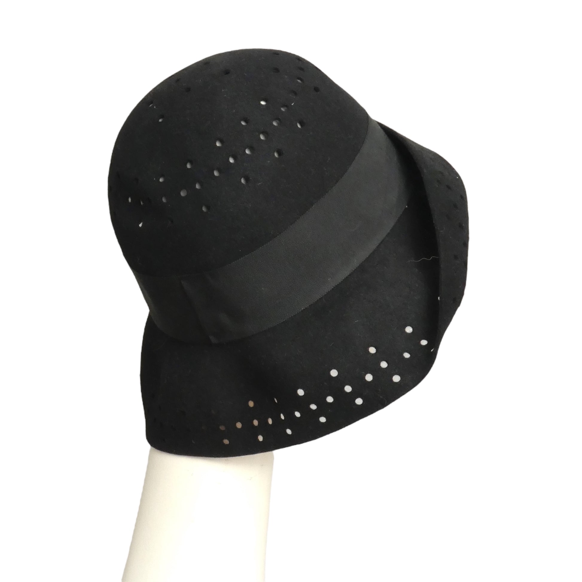 Description: This black wool felt hat from the late 1960s features a tall crown and a flexible brim you can shape your way. Delightful cutout details decorate the top of the crown and the brim, while a broad black grosgrain ribbon wraps around the base, adding a stylish finishing touch.