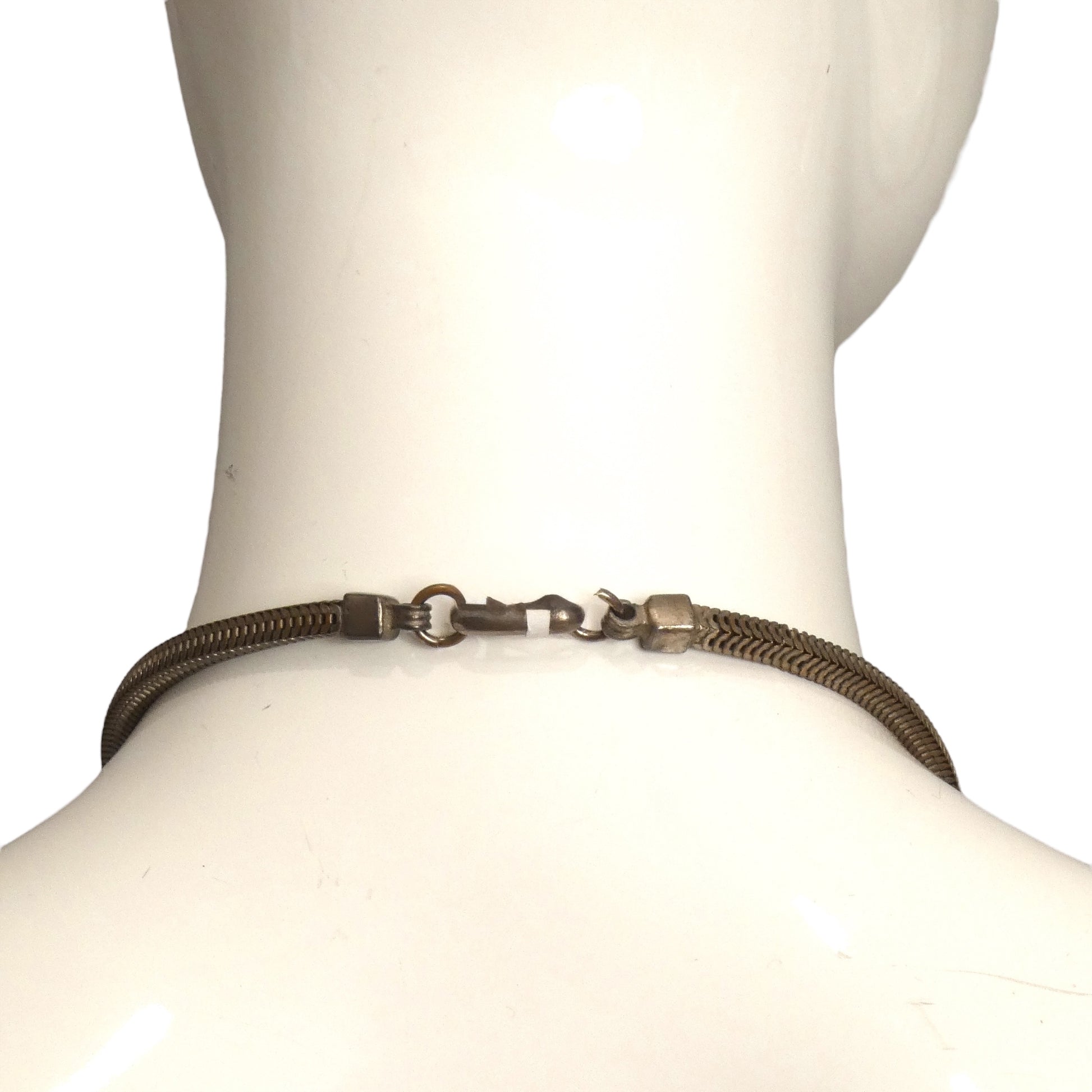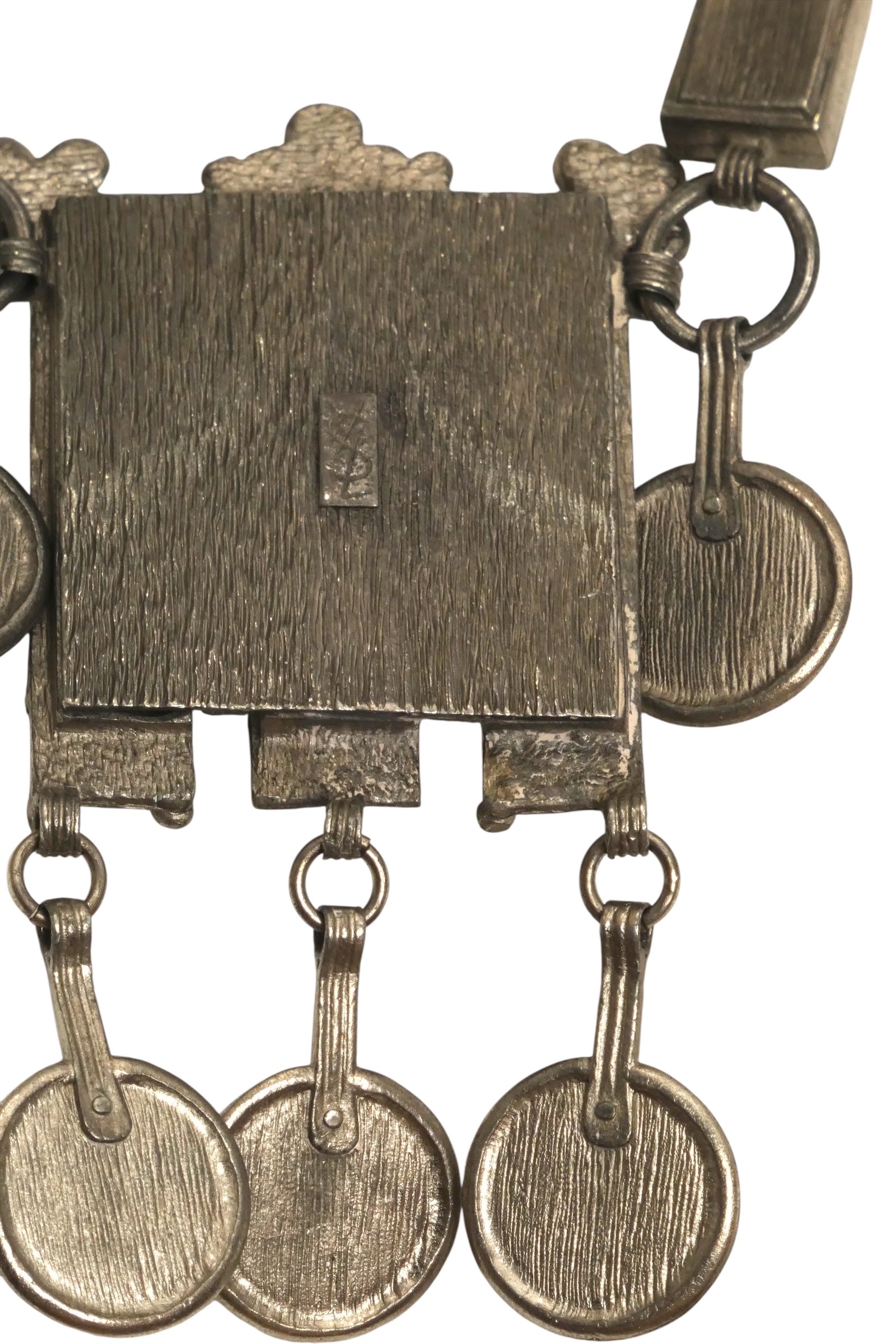 Description: Step into vintage charm with this playful Yves Saint Laurent necklace from c.1970, crafted by the talented Roger Scemama. Its ethnic-inspired silver design shines with vibrant green and brown enamel, sparkling red and green gemstones, and a bold pendant adorned with cascading silver coins. The handy hook closure keeps it secure while you turn heads. Add a splash of timeless elegance and a touch of fun to your collection with this unique statement piece!