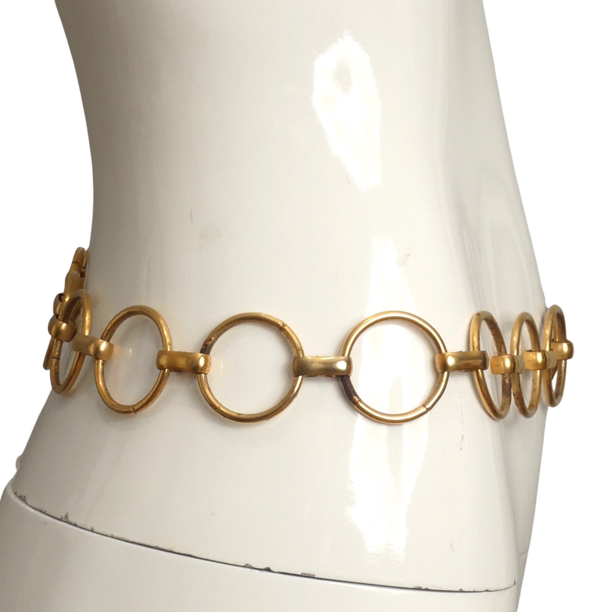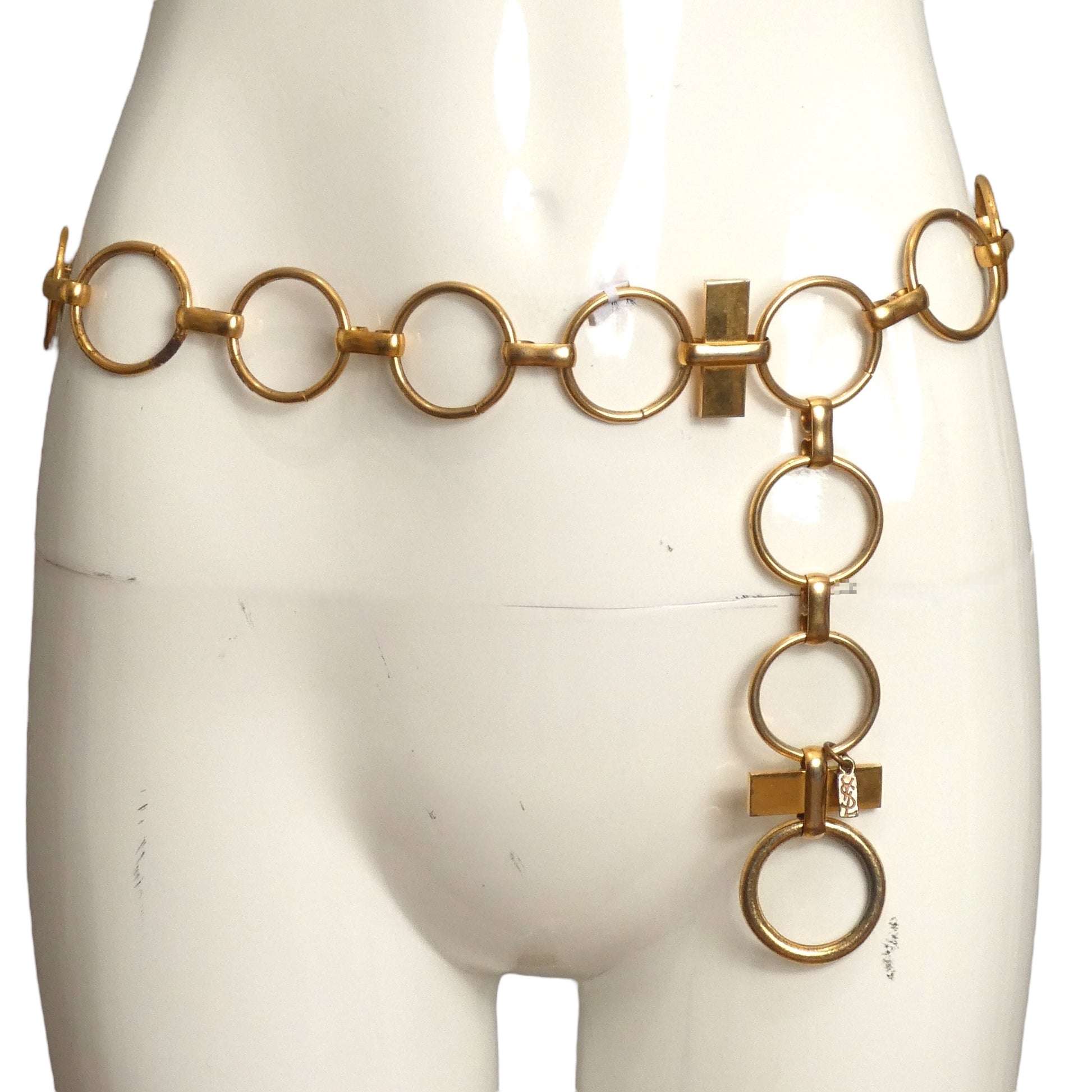Description: Elevate your style with this dazzling Yves Saint Laurent 1970s Gold Gilt O-Ring Belt! Featuring beautifully linked gold-tone rings and wide bars with a handy hook, it’s as easy to wear as it is eye-catching. The iconic YSL hang tag adds a touch of luxury, making this belt a playful yet sophisticated statement piece for any outfit.