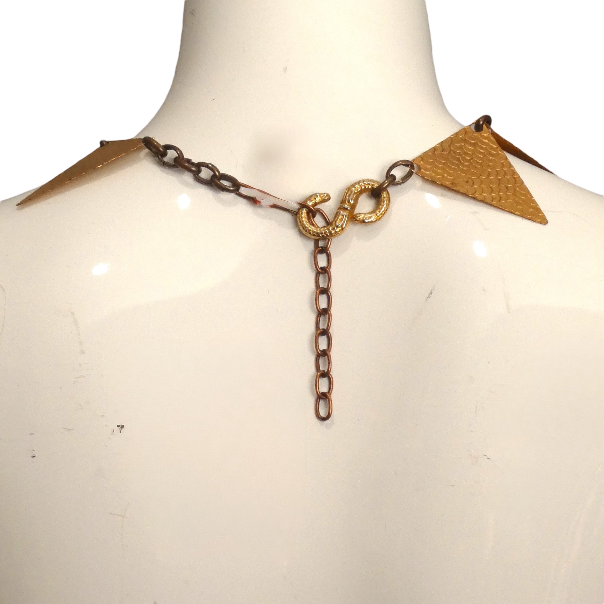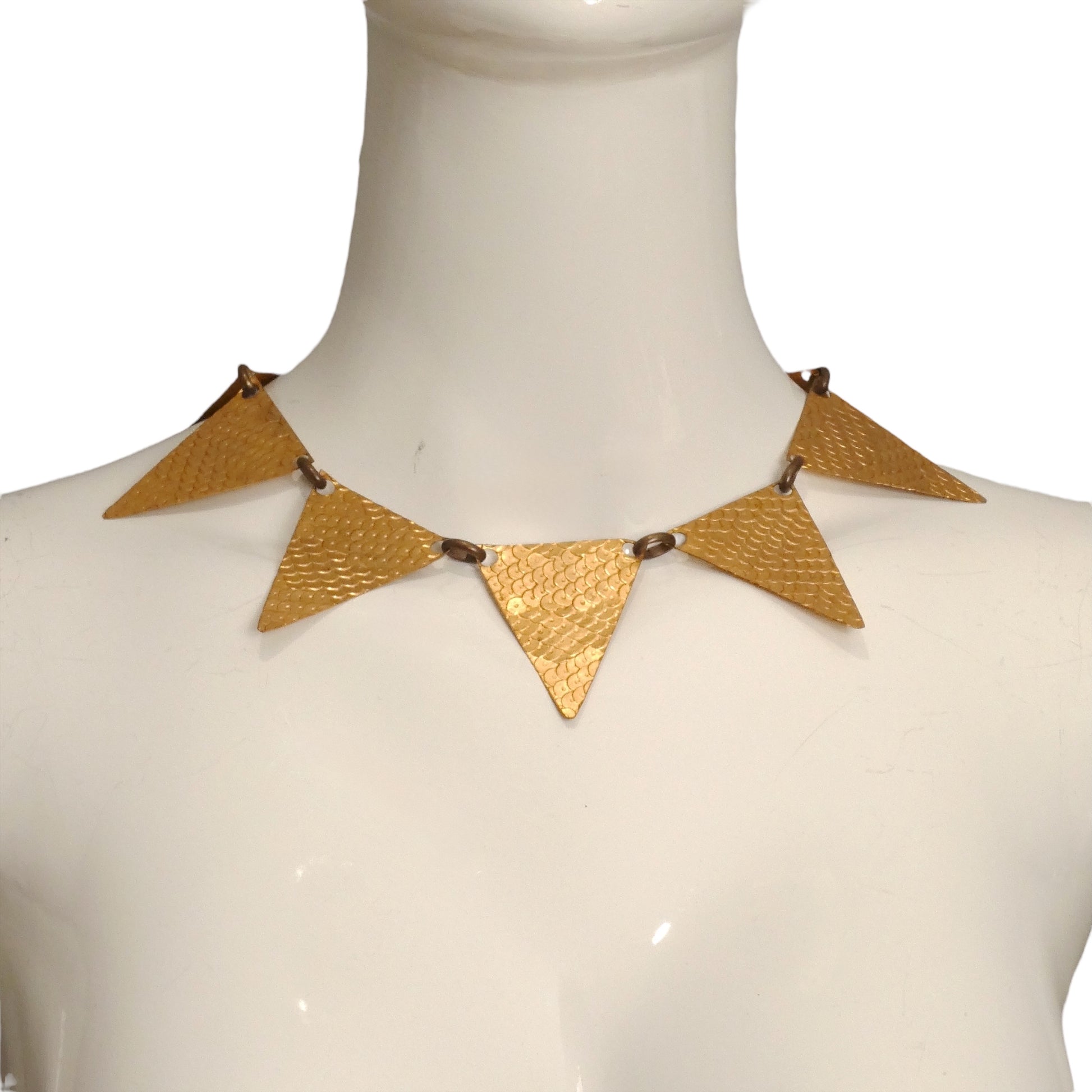Description: Make a bold and playful statement with this vintage gold tone pennant necklace from the 1970s. Featuring eye-catching gold triangles, each decorated with unique sequin patterns, it’s connected by large jump rings for added flair. The secure chains and oversized S-hook fastening ensure a comfy fit, making it perfect for adding a touch of vintage glamour to any outfit. This necklace is a fun and fabulous must-have for collectors and style lovers alike!