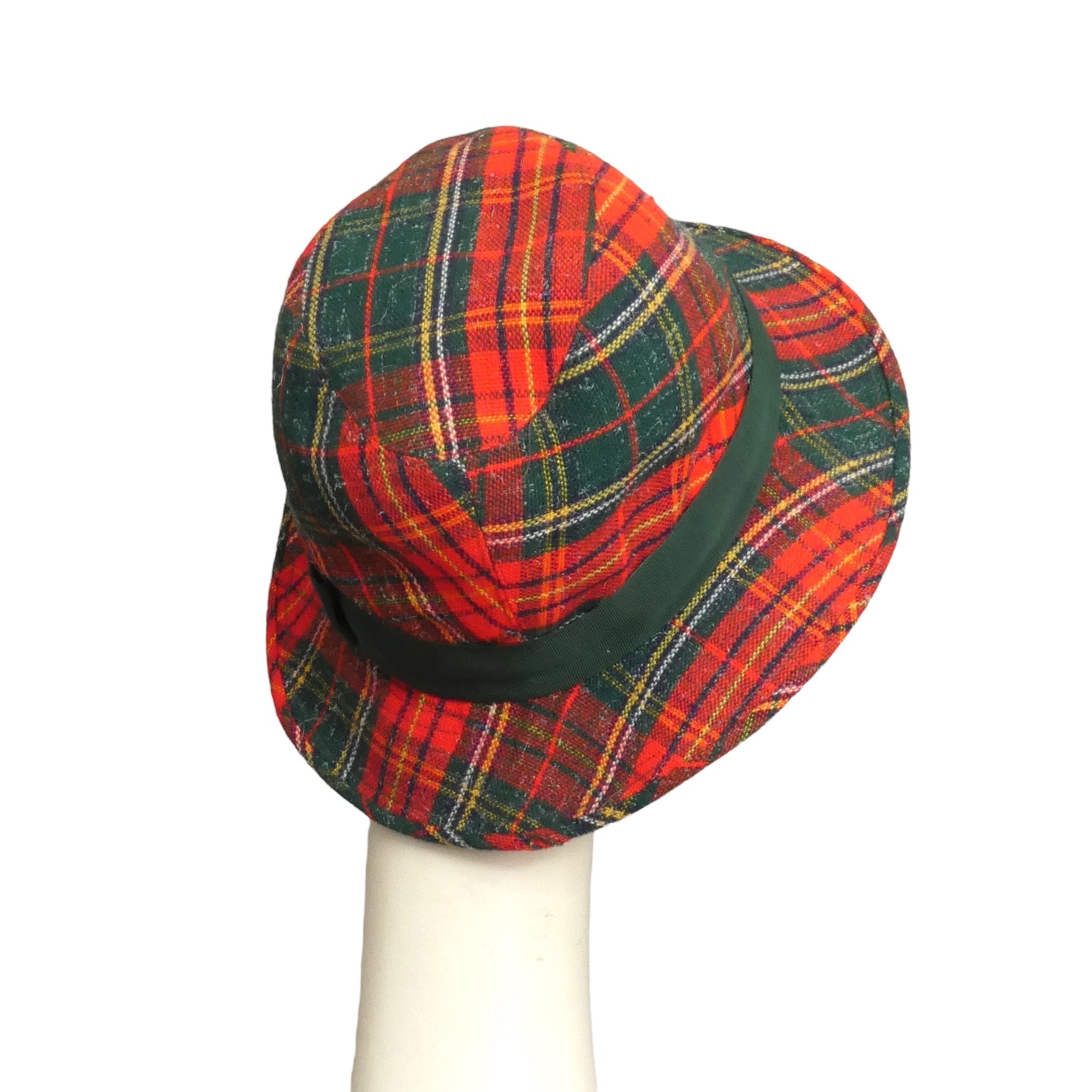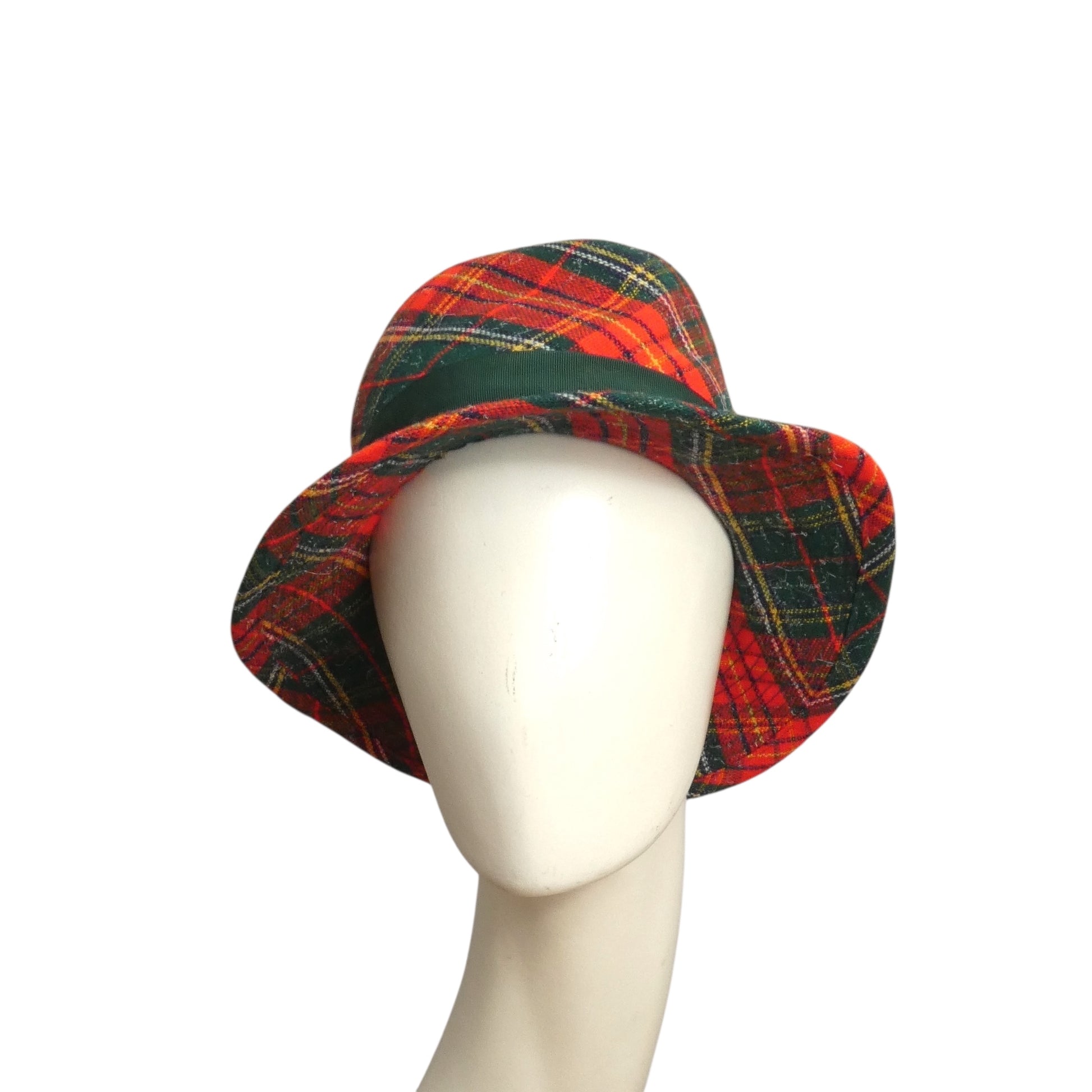 Description: Step back in time with this charming fedora from the late 1960s to early 1970s, crafted in cozy wool plaid. It features a tall crown and a medium-sized brim, topped off with a cheeky green grosgrain ribbon wrapped around the base. Perfect for adding a dash of vintage flair to any outfit!