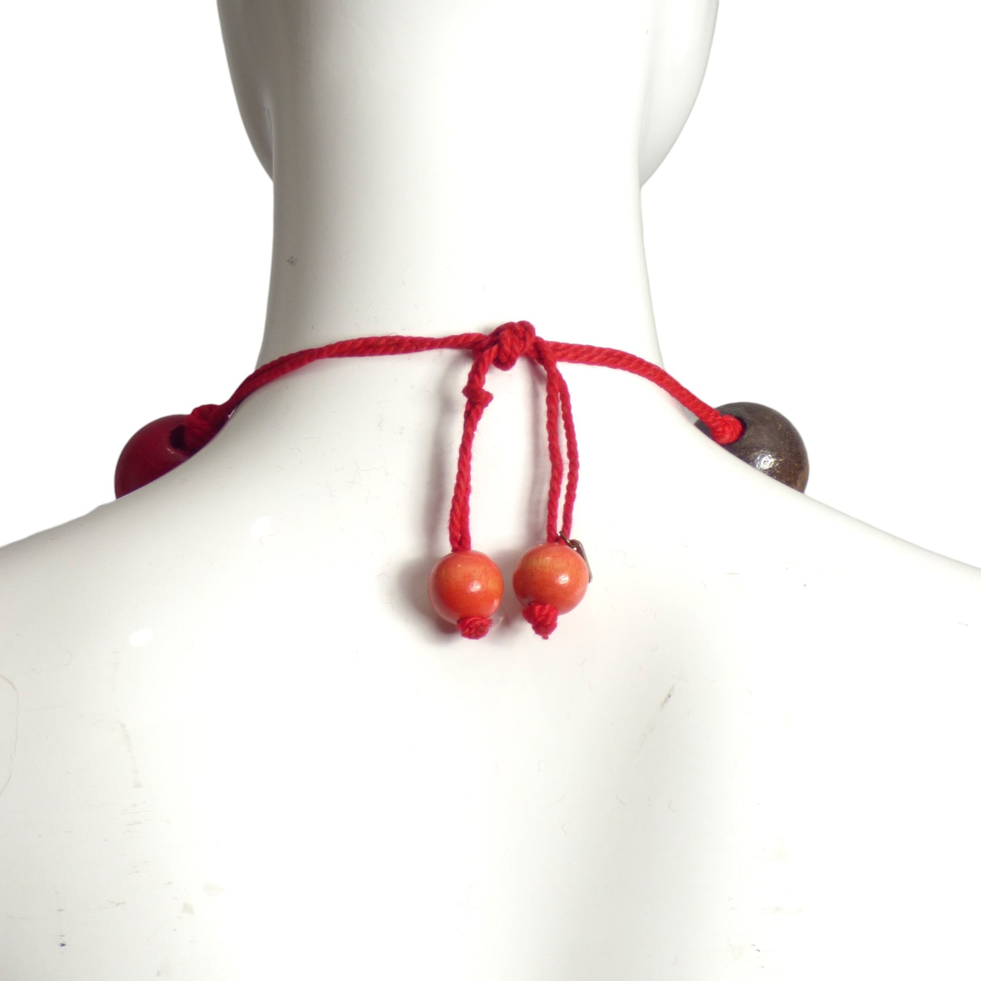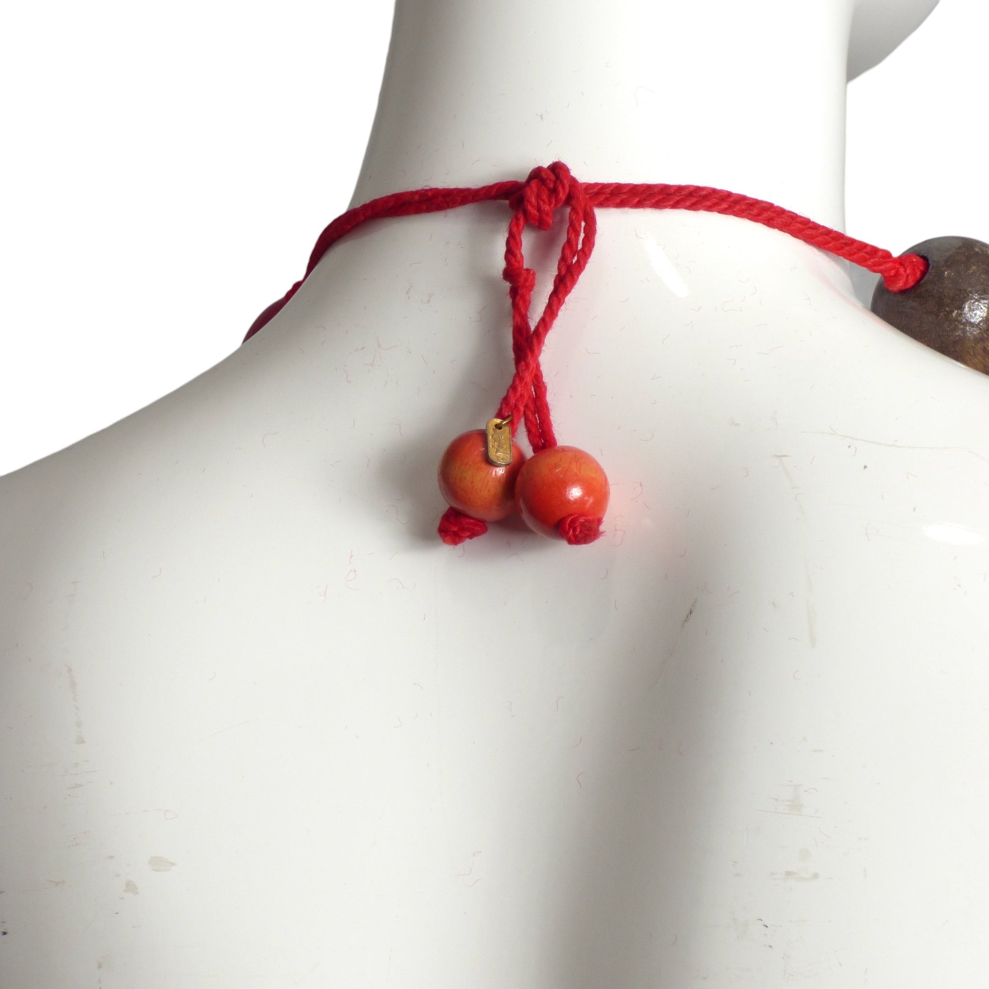Description: Get ready to stand out with this stunning necklace made of large, colorful wood beads! Four strands of twisted red rope showcase the vibrant hues of the beads, separated by bold knots. Complete with small knots and a striking orange accent bead, this piece is finished off with a gold YSL hang tag to add a touch of daring luxury.